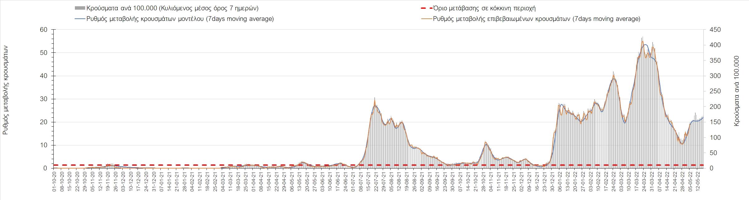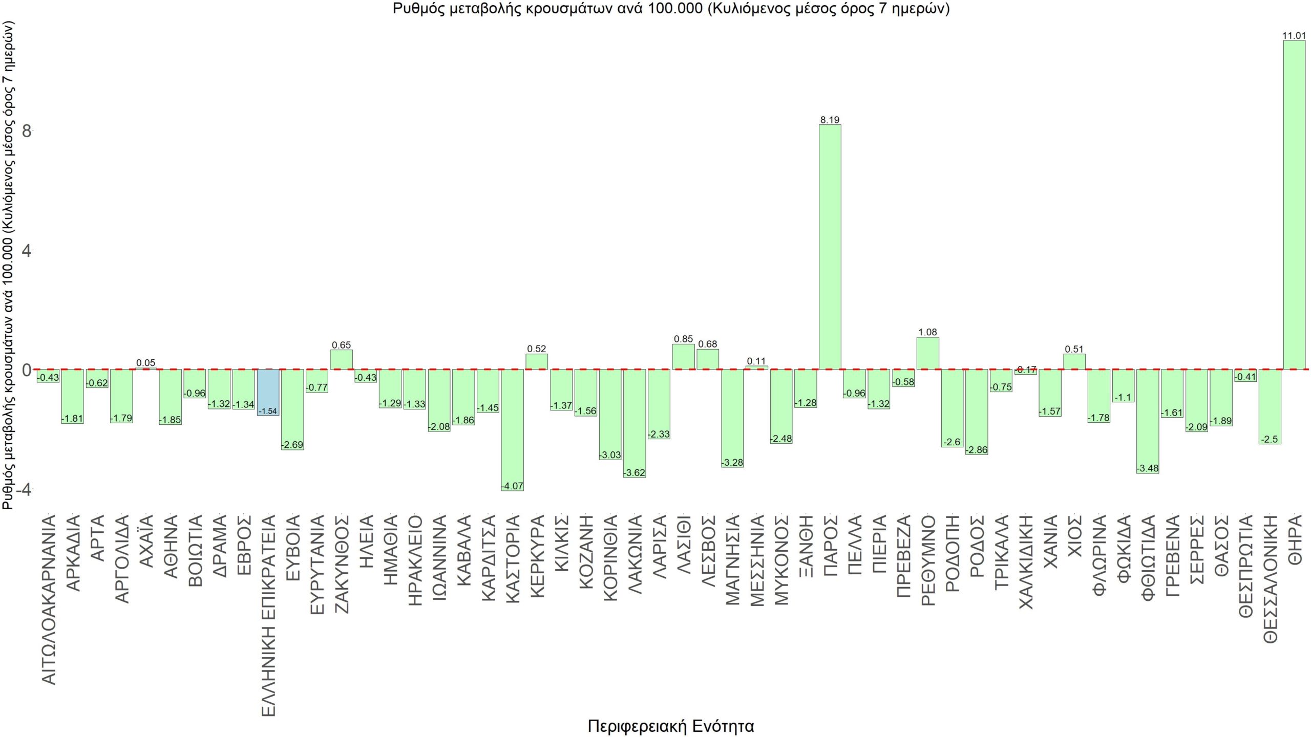 Η αποτύπωση των τάσεων στις επιμέρους περιοχές, παρουσιάζεται στο Σχήμα 61, όπου παρουσιάζεται ο ρυθμός μεταβολής των νέων κρουσμάτων ανά 100.000 κατοίκους (κυλιόμενος μέσος όρος 7 ημερών) των επιμέρους περιοχών. Θετικές τιμές του ρυθμού μεταβολής υποδηλώνουν άνοδο, ενώ αρνητικές τιμές υποδηλώνουν πτωτική πορεία.