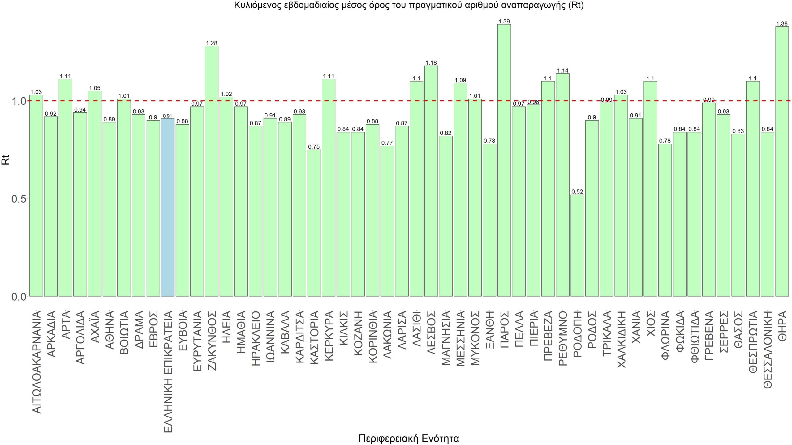 O πραγματικός αριθμός αναπαραγωγής Rt ανά περιφερειακή ενότητα της χώρας παρουσιάζεται στο Σχήμα 58.