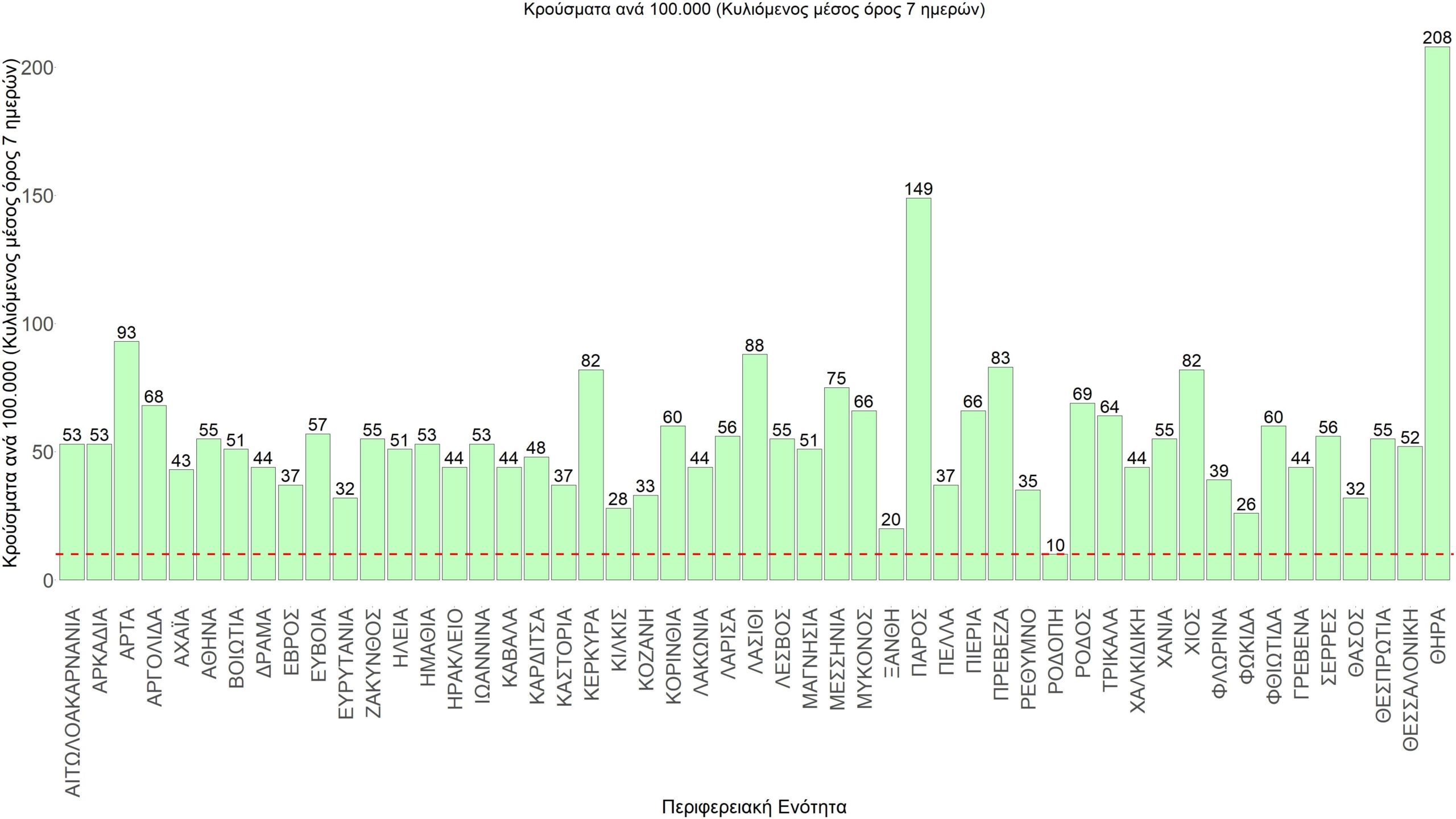 Η συγκεντρωτική εικόνα των νέων κρουσμάτων ανά 100.000 κατοίκους (κυλιόμενος μέσος όρος 7 ημερών) των επιμέρους περιοχών παρουσιάζεται στο Σχήμα 60. Όλες οι περιοχές είναι πάνω από το όριο ανησυχίας, με εξαίρεση τη Ροδόπη που πλέον βρίσκεται ακριβώς στο όριο.