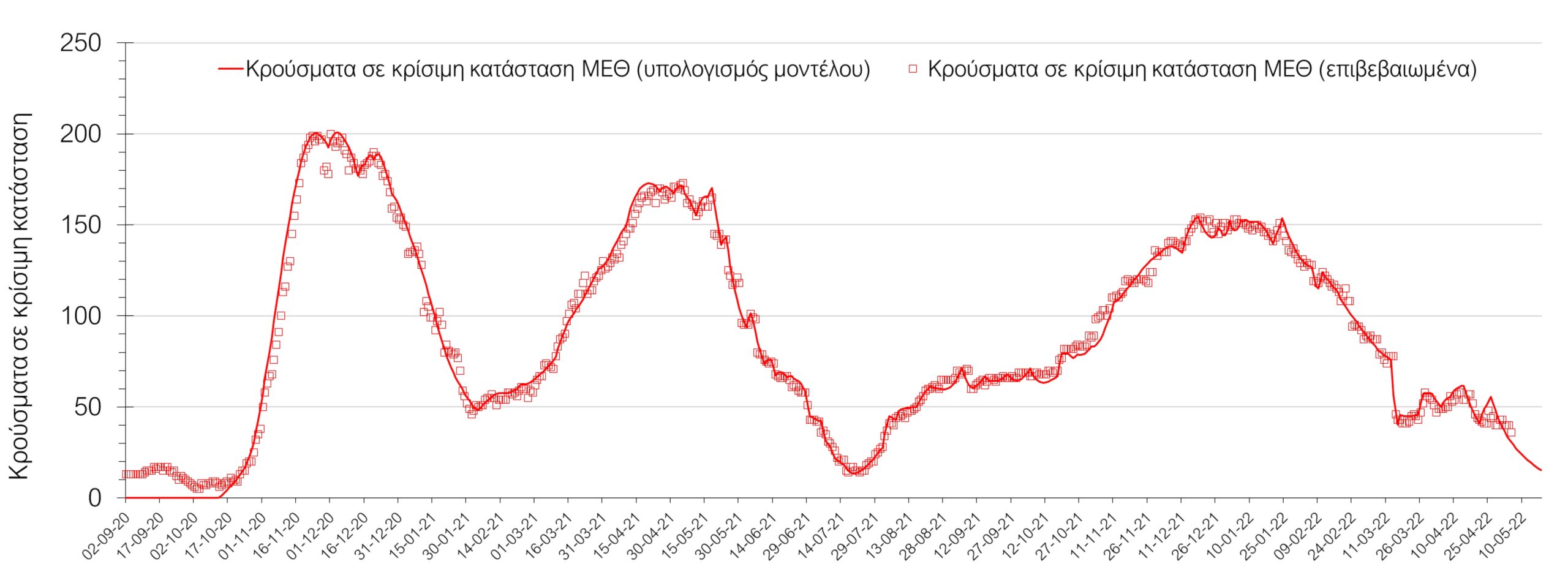 Η πορεία της μέσης εβδομαδιαίας τιμής των κρουσμάτων, καθώς και του κυλιόμενου μέσου όρου 7 ημερών του αριθμού των κρουσμάτων ανά 100.000 πληθυσμού, όπως έχουν καταγραφεί από τον ΕΟΔΥ και η αναμενόμενη πορεία τους, όπως προδιαγράφεται από την υπολογιστική πλατφόρμα CORE για την Ελληνική επικράτεια (όπως και στην Αττική και τη Θεσσαλονίκη) μέχρι τις 15 Μαΐου, αποτυπώνονται στο Σχήμα 4. Αυτή η προβλεπόμενη πορεία, που αφορά τα κρούσματα, τους νοσηλευόμενους σε απλές κλίνες, όσο και σε ΜΕΘ, καθώς επίσης και τους θανάτους, βασίζεται στις ακόλουθες παραδοχές: