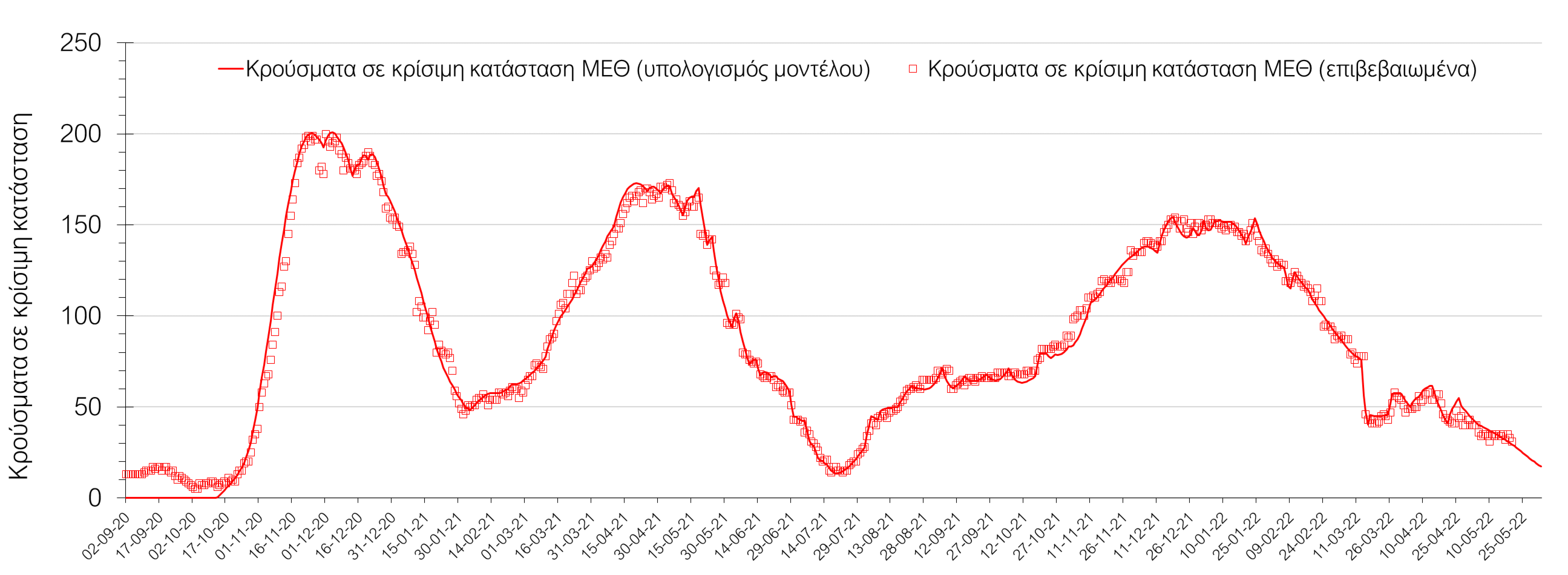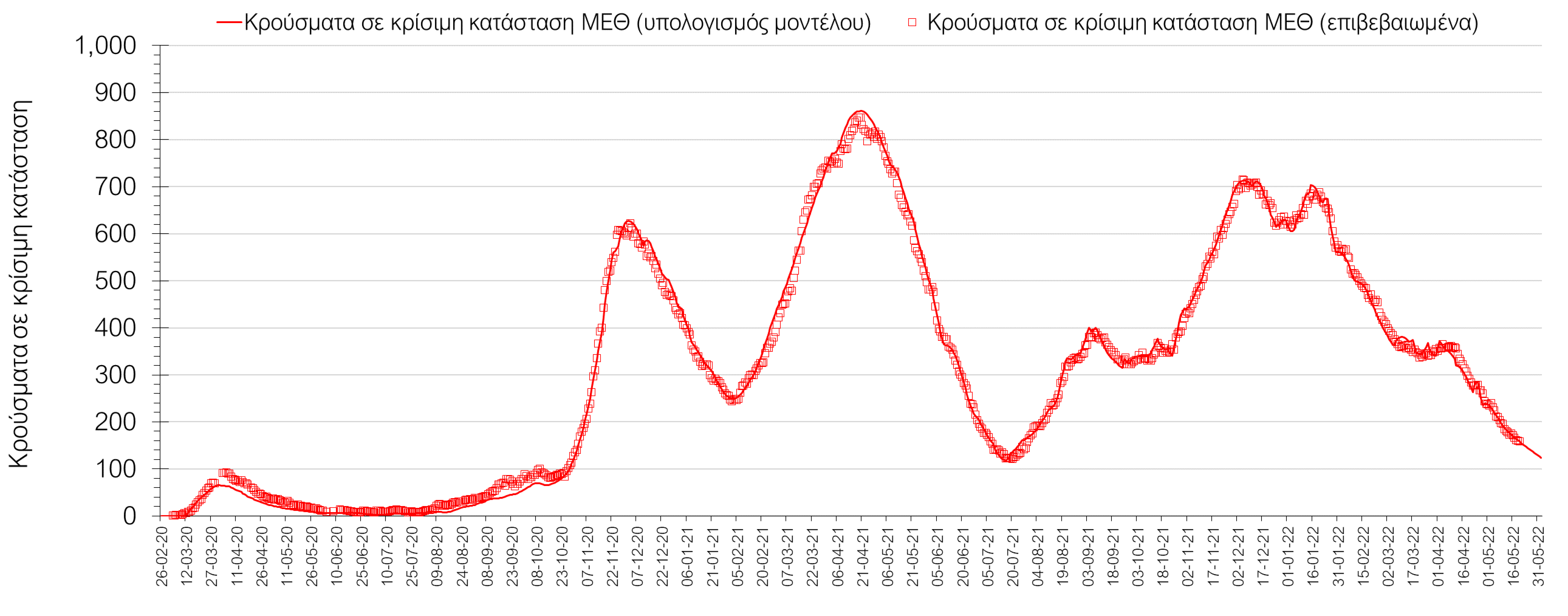 Η πορεία της μέσης εβδομαδιαίας τιμής των κρουσμάτων, καθώς και του κυλιόμενου μέσου όρου 7 ημερών του αριθμού των κρουσμάτων ανά 100.000 πληθυσμού, όπως έχουν καταγραφεί από τον ΕΟΔΥ και η αναμενόμενη πορεία τους, όπως προδιαγράφεται από την υπολογιστική πλατφόρμα CORE για την Ελληνική επικράτεια (όπως και στην Αττική και τη Θεσσαλονίκη) μέχρι τις 31 Μαΐου, αποτυπώνονται στο Σχήμα 4. Αυτή η προβλεπόμενη πορεία, που αφορά τα κρούσματα, τους νοσηλευόμενους σε απλές κλίνες, όσο και σε ΜΕΘ, καθώς επίσης και τους θανάτους, βασίζεται στις ακόλουθες παραδοχές: