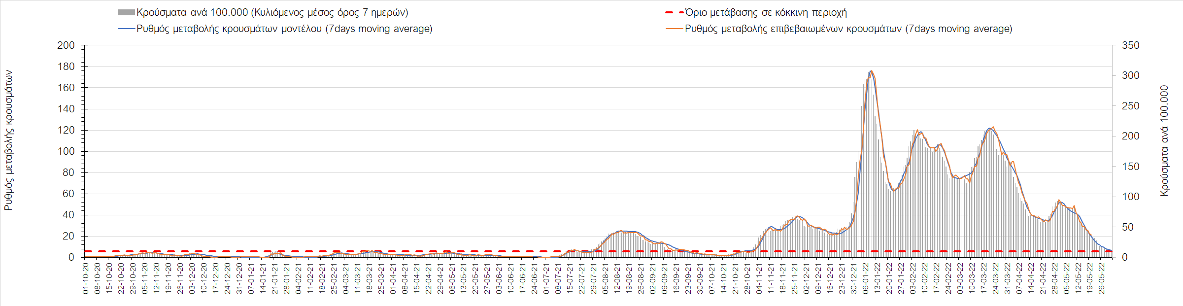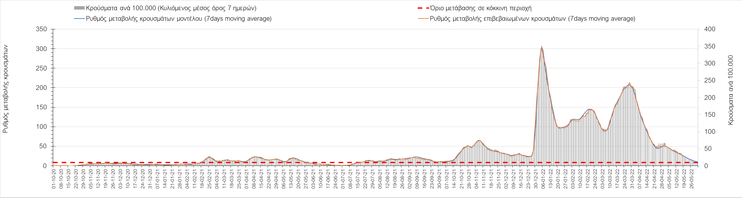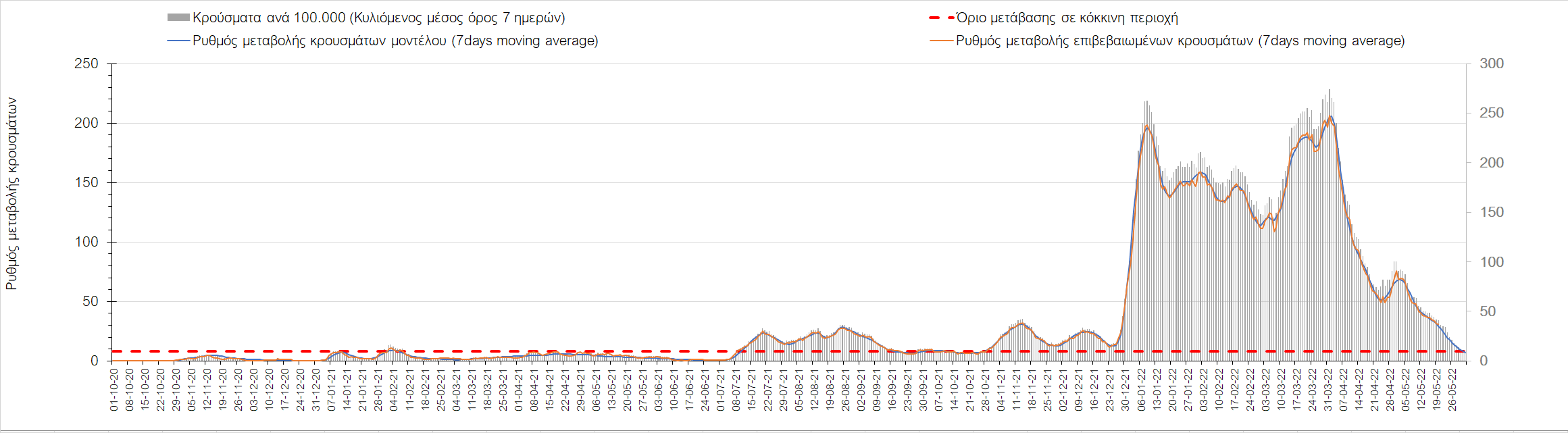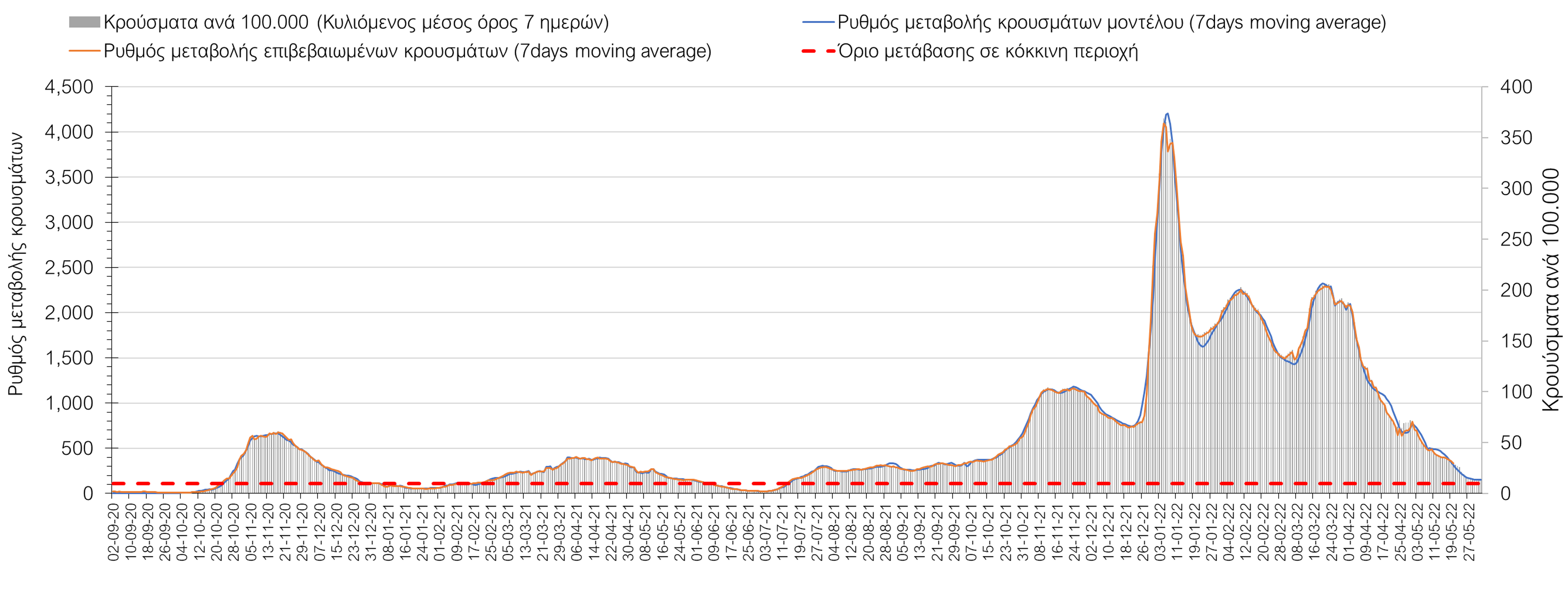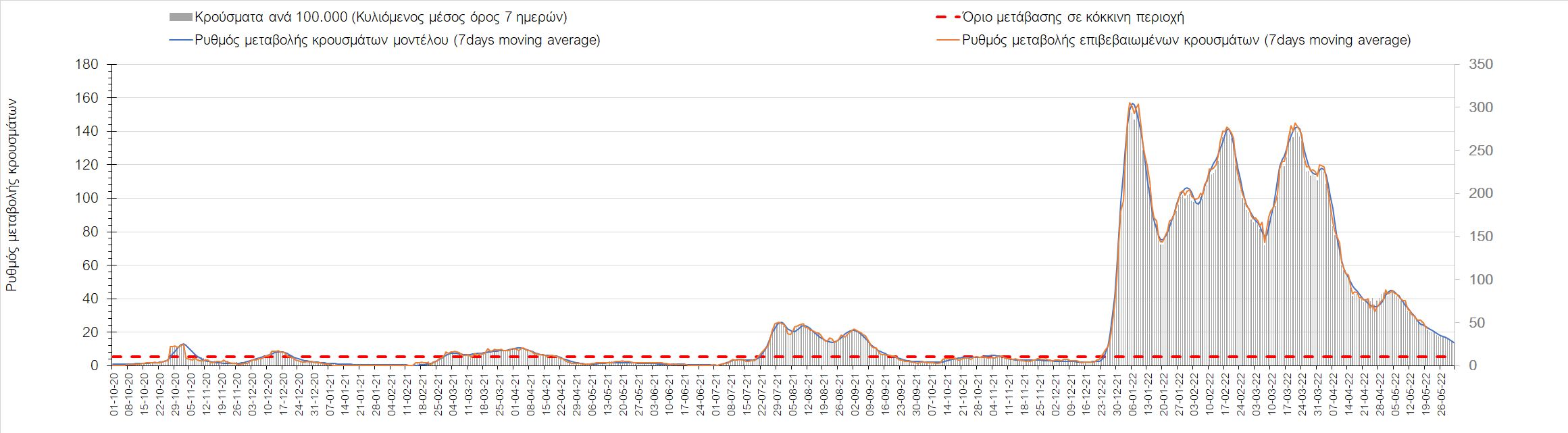 Συμπεράσματα: Με βάση τα σημερινά αποτελέσματα, σε σχέση με την Πέμπτη, παρατηρήθηκε οριακά μικρότερος αριθμός ασθενών σε κρίσιμη κατάσταση (διασωληνωμένοι σε ΜΕΘ) όπως επίσης και αριθμός θανάτων από COVID-19. Σε πανελλαδικό επίπεδο ο κυλιόμενος εβδομαδιαίος μέσος όρος του δείκτη θετικότητας διαμορφώθηκε στο 5,9% (η ημερήσια τιμή είναι 4,7%) ενώ ο κυλιόμενος εβδομαδιαίος μέσος όρος του πραγματικού αριθμού αναπαραγωγής Rt (δηλαδή ο αριθμός των ατόμων που ένας φορέας μπορεί να επιμολύνει) μειώθηκε ελαφρώς στο 0,93 (Rt κάτω από τη μονάδα υποδηλώνει καθαρή μείωση της διασποράς του ιού στην κοινότητα). Συνολικά, ο αριθμός των κρουσμάτων (όπως αποτυπώνεται στον κυλιόμενο μέσο όρο 7 ημερών) παραμένει υψηλός, και οφείλονταν αρχικά στις αυξημένες επαφές τις ημέρες του Πάσχα και του τριημέρου της Πρωτομαγιάς, έχοντας συντελέσει σε ανατροπή της πορείας αποκλιμάκωσης, ενώ η πρόσφατη προσωρινή αναστροφή, συντηρήθηκε τόσο από την απώλεια ανοσίας λόγω της παρόδου μεγάλου χρονικού διαστήματος σε μεγάλο τμήμα του πληθυσμού από τον τελευταίο εμβολιασμό, όσο και από νόσηση, καθώς και από τη χαλάρωση των μέτρων σε συνδυασμό με την κατάργηση των self-test. Συνεπώς, ενώ πρακτικά η πτωτική πορεία έχει επανέλθει στις περισσότερες περιφερειακές ενότητες, υπάρχουν περιοχές στις οποίες παρατηρείται ξανά προσωρινή ανοδική πορεία. Σε αυτό το πλαίσιο δεν συνιστάται η άρση της υποχρεωτικής χρήσης μέτρων προσωπικής προστασίας όπως η μάσκα σε κλειστούς χώρους.