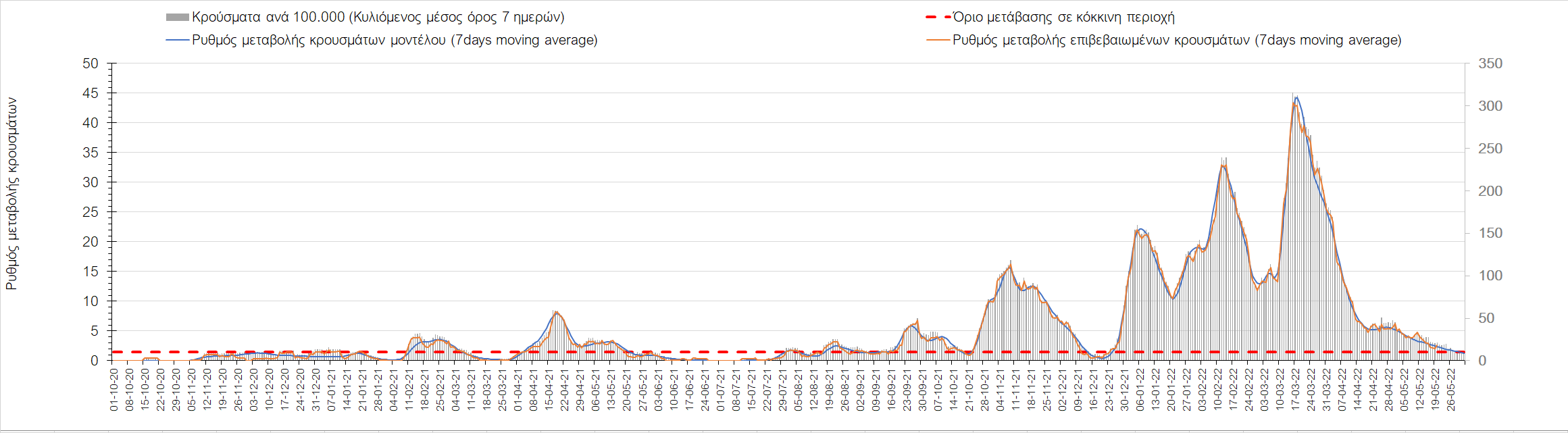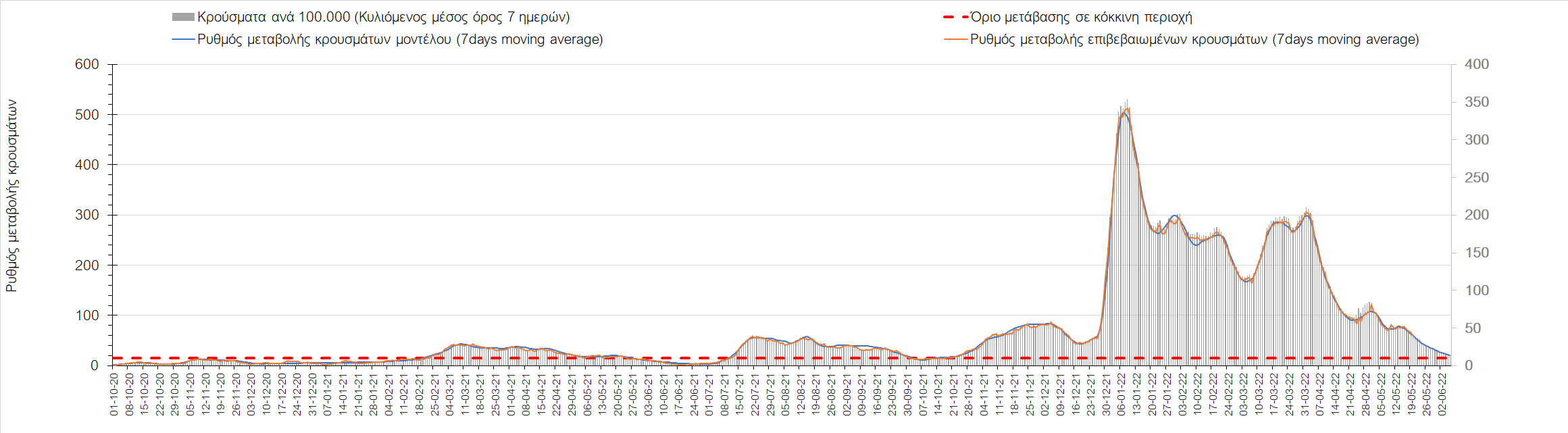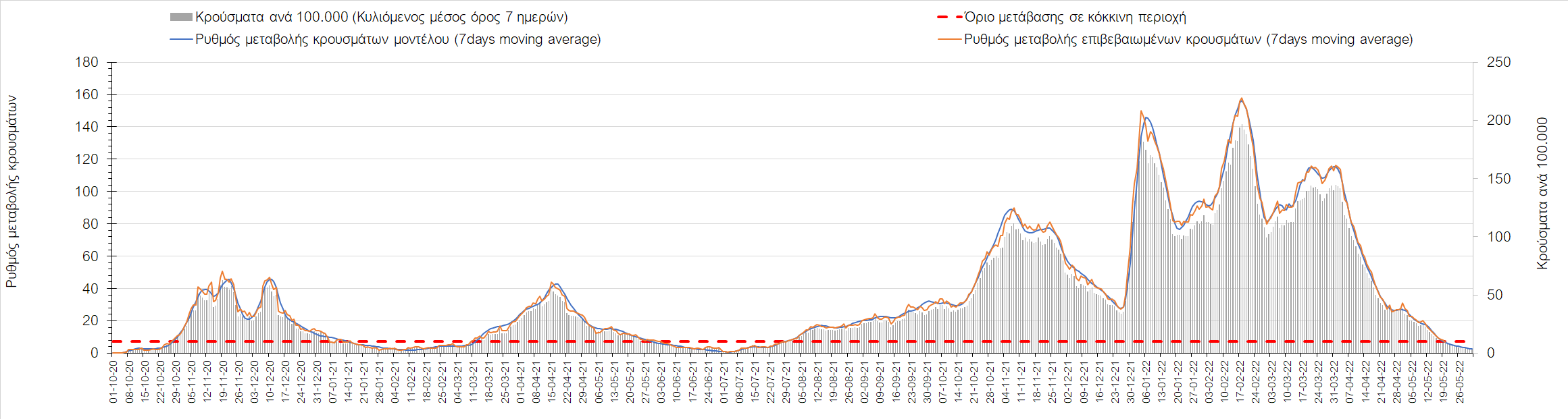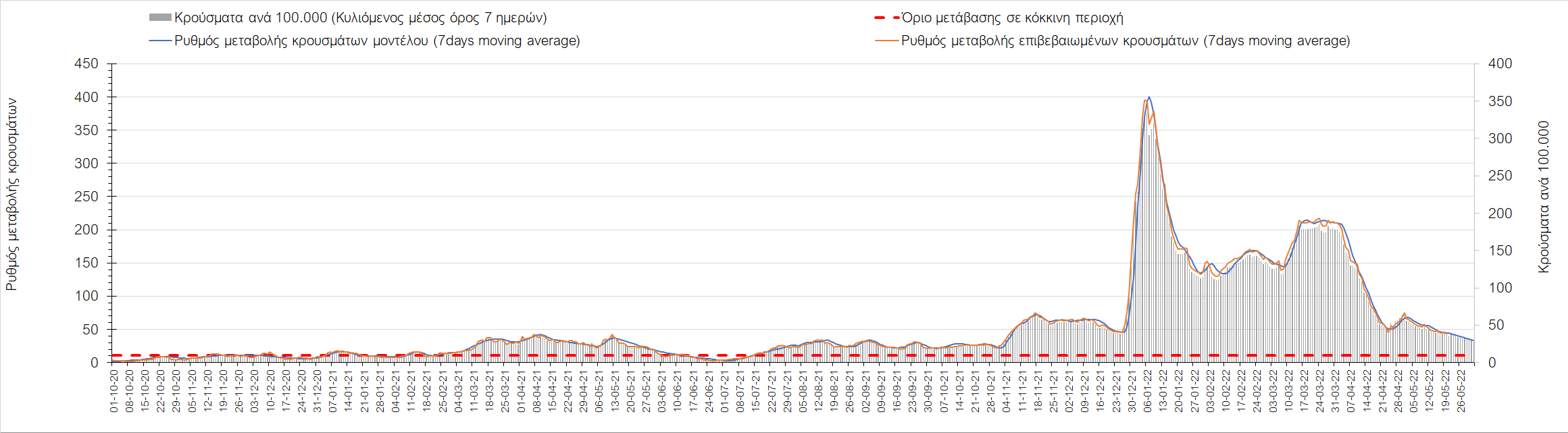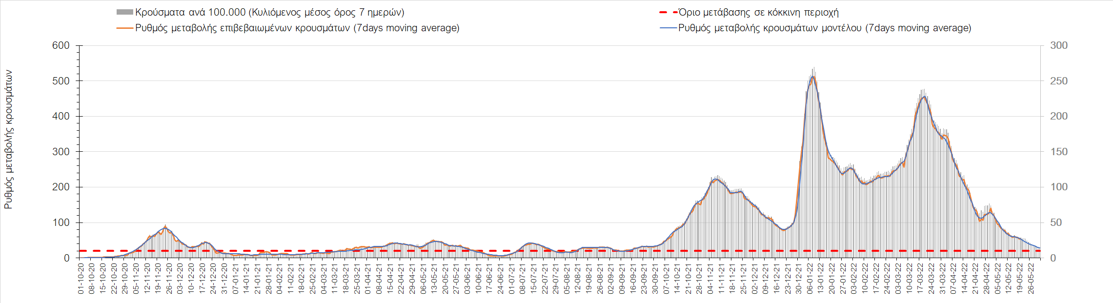 Συμπεράσματα: Με βάση τα σημερινά αποτελέσματα, σε σχέση με την Πέμπτη, παρατηρήθηκε οριακά μικρότερος αριθμός ασθενών σε κρίσιμη κατάσταση (διασωληνωμένοι σε ΜΕΘ) όπως επίσης και αριθμός θανάτων από COVID-19. Σε πανελλαδικό επίπεδο ο κυλιόμενος εβδομαδιαίος μέσος όρος του δείκτη θετικότητας διαμορφώθηκε στο 5,9% (η ημερήσια τιμή είναι 4,7%) ενώ ο κυλιόμενος εβδομαδιαίος μέσος όρος του πραγματικού αριθμού αναπαραγωγής Rt (δηλαδή ο αριθμός των ατόμων που ένας φορέας μπορεί να επιμολύνει) μειώθηκε ελαφρώς στο 0,93 (Rt κάτω από τη μονάδα υποδηλώνει καθαρή μείωση της διασποράς του ιού στην κοινότητα). Συνολικά, ο αριθμός των κρουσμάτων (όπως αποτυπώνεται στον κυλιόμενο μέσο όρο 7 ημερών) παραμένει υψηλός, και οφείλονταν αρχικά στις αυξημένες επαφές τις ημέρες του Πάσχα και του τριημέρου της Πρωτομαγιάς, έχοντας συντελέσει σε ανατροπή της πορείας αποκλιμάκωσης, ενώ η πρόσφατη προσωρινή αναστροφή, συντηρήθηκε τόσο από την απώλεια ανοσίας λόγω της παρόδου μεγάλου χρονικού διαστήματος σε μεγάλο τμήμα του πληθυσμού από τον τελευταίο εμβολιασμό, όσο και από νόσηση, καθώς και από τη χαλάρωση των μέτρων σε συνδυασμό με την κατάργηση των self-test. Συνεπώς, ενώ πρακτικά η πτωτική πορεία έχει επανέλθει στις περισσότερες περιφερειακές ενότητες, υπάρχουν περιοχές στις οποίες παρατηρείται ξανά προσωρινή ανοδική πορεία. Σε αυτό το πλαίσιο δεν συνιστάται η άρση της υποχρεωτικής χρήσης μέτρων προσωπικής προστασίας όπως η μάσκα σε κλειστούς χώρους.