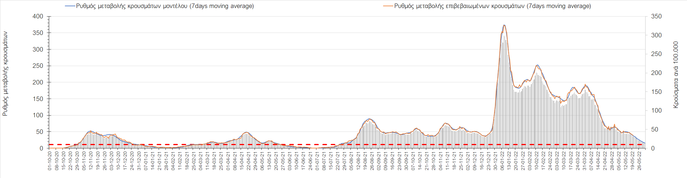 Ο αριθμός των κρουσμάτων που παρατηρείται, είναι σημαντικά υψηλότερος από αυτόν που αναμέναμε όταν ξεκίνησε η αποκλιμάκωση του 5ου κύματος και υποδηλώνει διαφυγή ανοσίας. O κυρίως λόγος που συμβαίνει αυτή η διαφυγή ανοσίας, είναι η καθυστέρηση της εφαρμογής της αναμνηστικής δόσης, με δεδομένη τη σημαντική διαφορά στην αποτελεσματικότητα προστασίας μεταξύ εμβολιασμένων με 2 δόσεις και με 3. Επίσης, σημαντική διαφυγή ανοσίας υπάρχει λόγω του αυξημένου ρυθμού επαναμολύνσεων ακόμα και σε σύντομο διάστημα από προηγούμενη μόλυνση, που αποτελεί χαρακτηριστικό του νέου υποστελέχους της Ο (Β.Α.2, ή παραλλαγή Ο-2), το οποίο εικάζεται ότι είναι ακόμη πιο μεταδοτικό από την παραλλαγή Ο κατά 33% μεσοσταθμικά. Συνεπώς, ο συνδυασμός επιβράδυνσης της 3ης δόσης και της παρουσίας του νέου στελέχους, οδήγησαν σε ένα νέο κύμα που έχει ήδη καθυστερήσει επιπλέον την ταχύτερη αποκλιμάκωση. Πλέον, ενώ συνολικά παρατηρείται πτωτική πορεία, έχοντας ξεπεράσει την ανοδική διακύμανση που παρατηρήθηκε πριν 2 εβδομάδες λόγω των αυξημένων επαφών του Πάσχα και του τριημέρου της Πρωτομαγιάς, τις προηγούμενες ημέρες παρατηρήθηκε σημαντική επιβράδυνση της πορείας αποκλιμάκωσης, με επιμέρους ανοδικές διακυμάνσεις, που διαμορφώνονταν κυρίως από την ήπια ανοδική τάση στην Αττική.