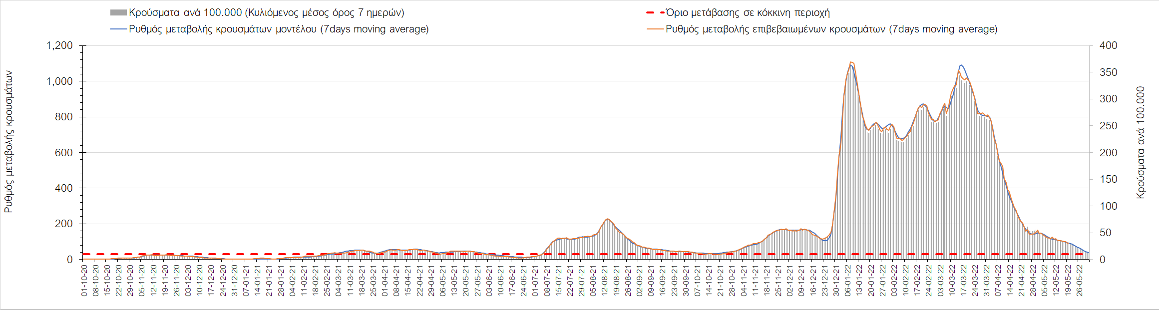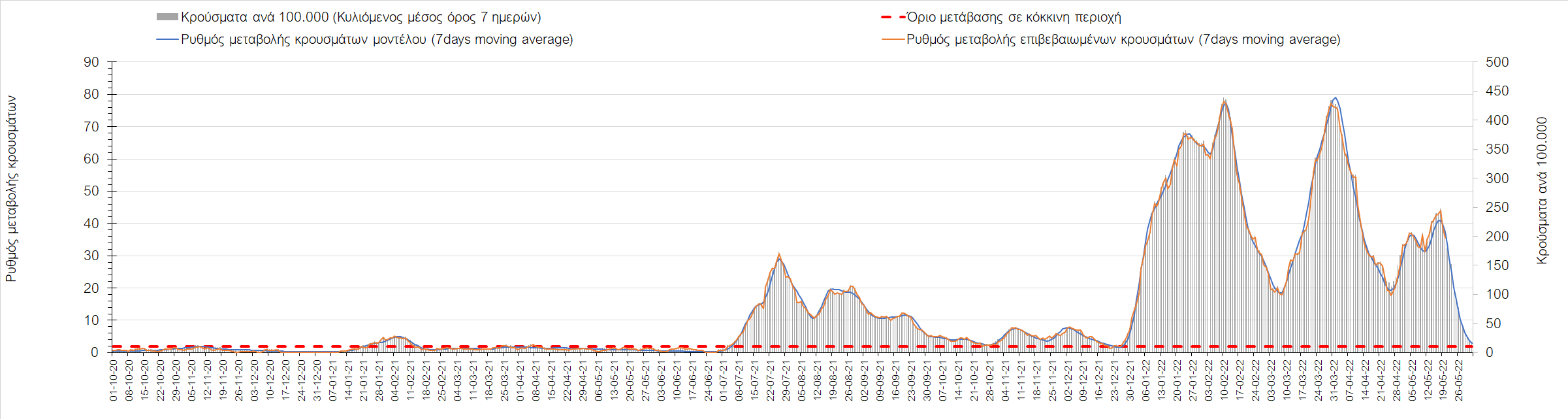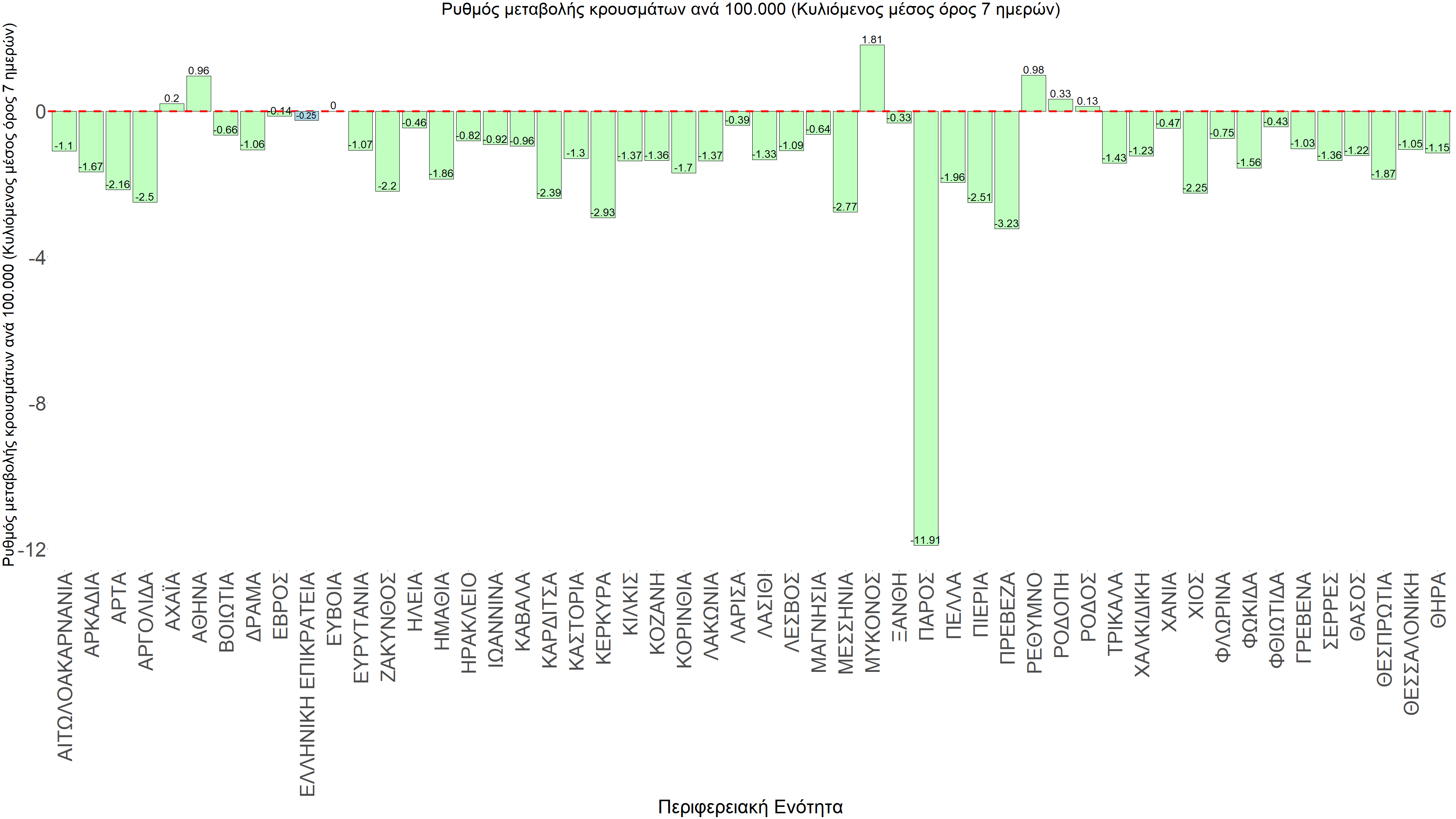 Η αποτύπωση των τάσεων στις επιμέρους περιοχές, παρουσιάζεται στο Σχήμα 61, όπου παρουσιάζεται ο ρυθμός μεταβολής των νέων κρουσμάτων ανά 100.000 κατοίκους (κυλιόμενος μέσος όρος 7 ημερών) των επιμέρους περιοχών. Θετικές τιμές του ρυθμού μεταβολής υποδηλώνουν άνοδο, ενώ αρνητικές τιμές υποδηλώνουν πτωτική πορεία.