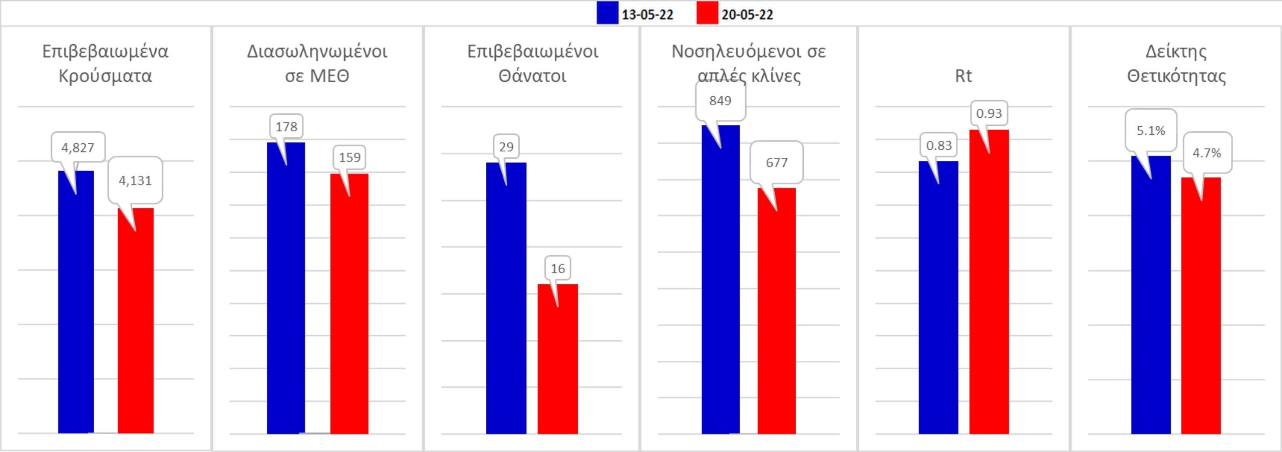 Σχήμα 59. Συγκριτικά αποτελέσματα της επιδημιολογικής εικόνας της σημερινής Παρασκευής (20/05/2022) σε σχέση με την προηγούμενη (13/05/2022)