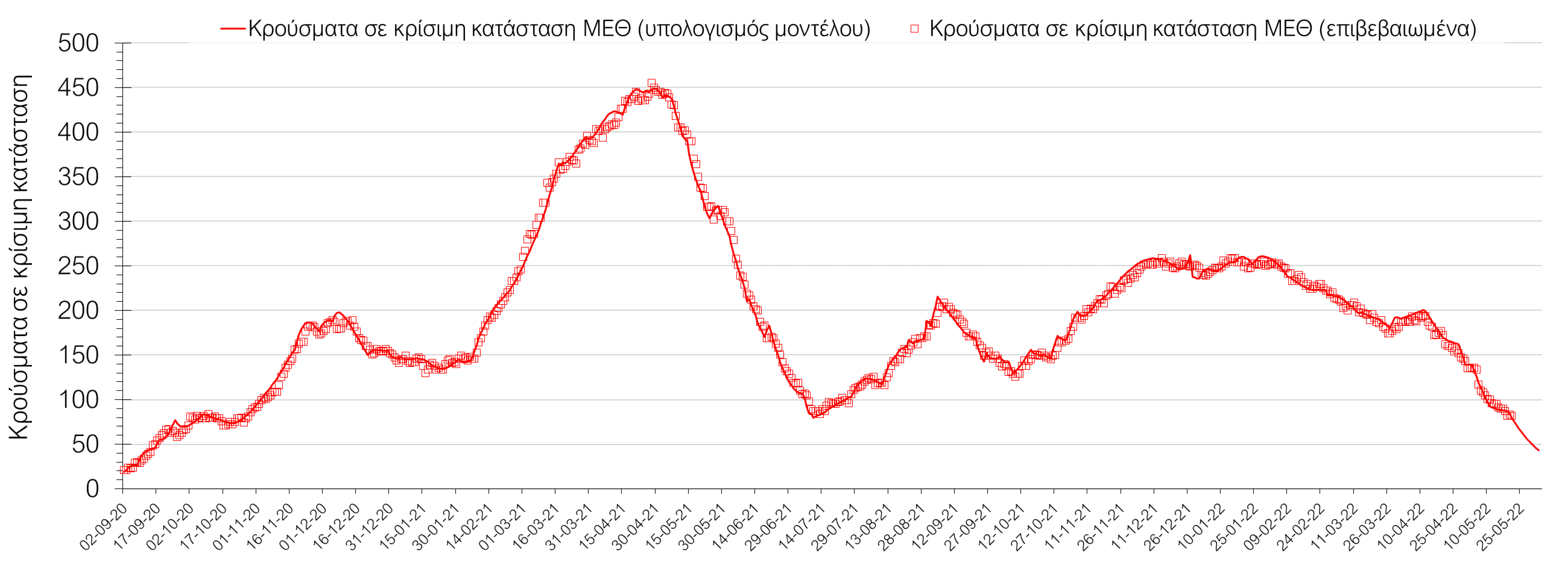 Όσον αφορά στους ασθενείς σε κρίσιμη κατάσταση (διασωληνωμένοι σε ΜΕΘ), ο αριθμός είναι οριακά μειωμένος σε σχέση με την Πέμπτη (159 από 160). Η καμπύλη εξέλιξης του αριθμού των ασθενών που νοσηλεύονται σε κλίνες ΜΕΘ με βάση τις προσομοιώσεις της πλατφόρμας CORE, παρουσιάζεται στο Σχήμα 1, των ασθενών που νοσηλεύονται σε απλές κλίνες στο Σχήμα 2, ενώ η εκτίμησή μας για την πορεία των θανάτων ανά ημέρα παρουσιάζεται στο Σχήμα 3.