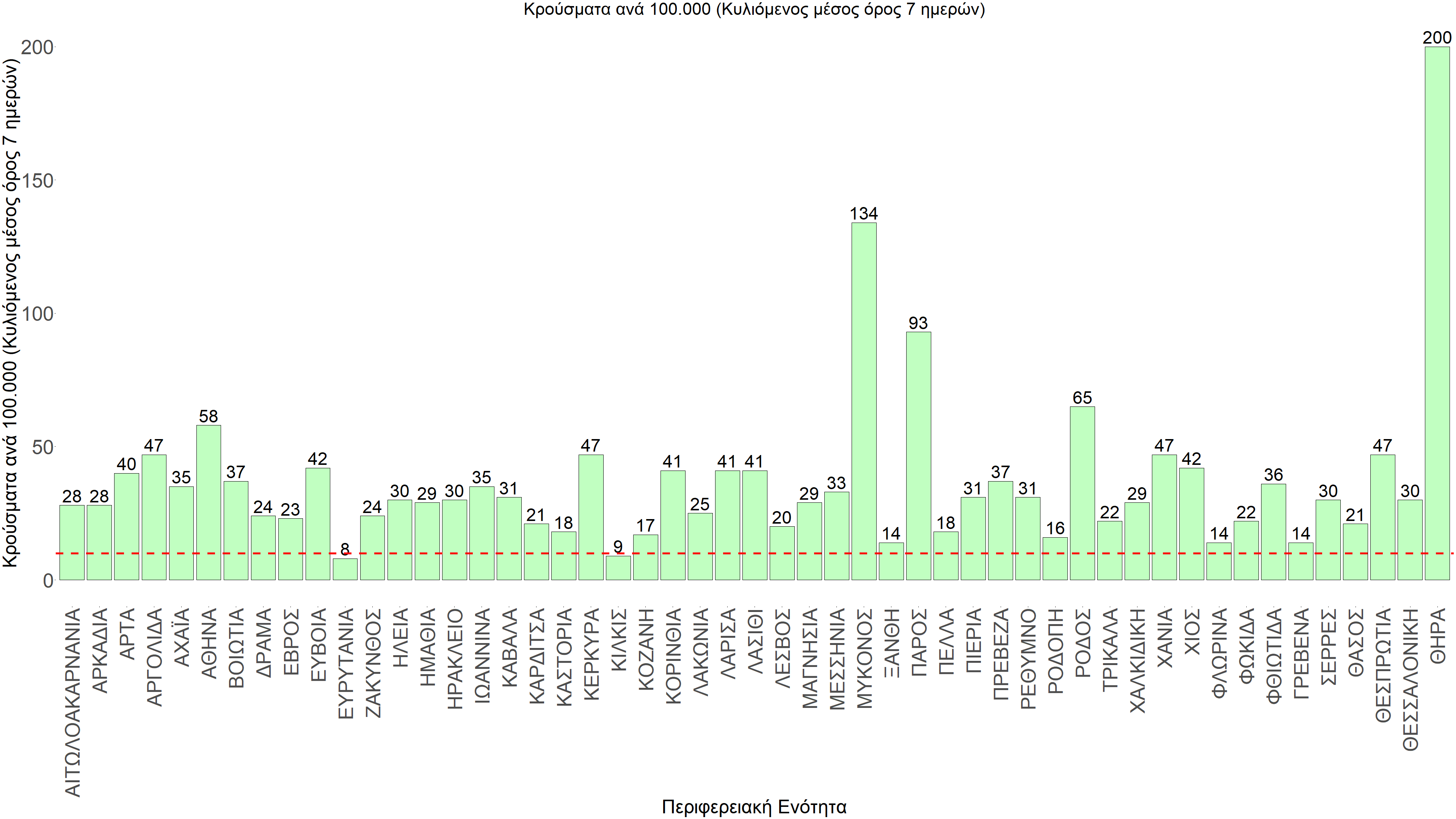 Η συγκεντρωτική εικόνα των νέων κρουσμάτων ανά 100.000 κατοίκους (κυλιόμενος μέσος όρος 7 ημερών) των επιμέρους περιοχών παρουσιάζεται στο Σχήμα 60. Όλες οι περιοχές παραμένουν πάνω από το όριο ανησυχίας, με εξαίρεση την Ευρυτανία και το Κιλκίς.