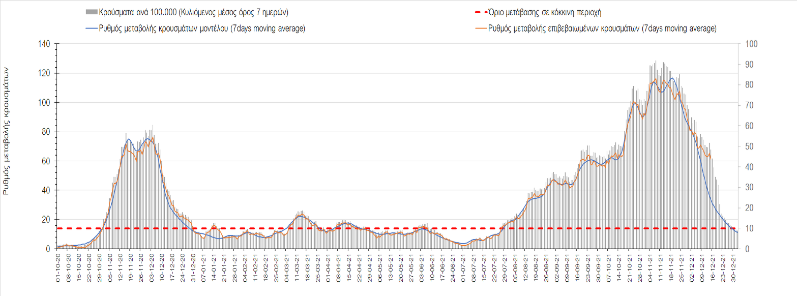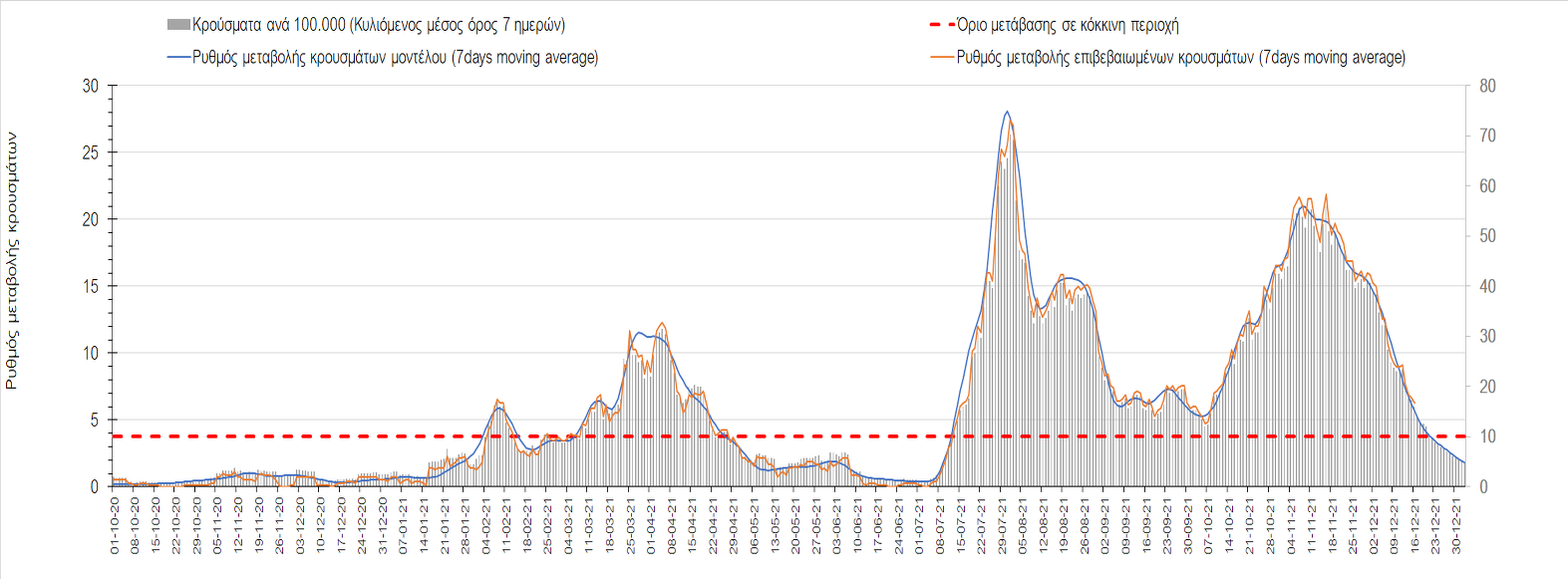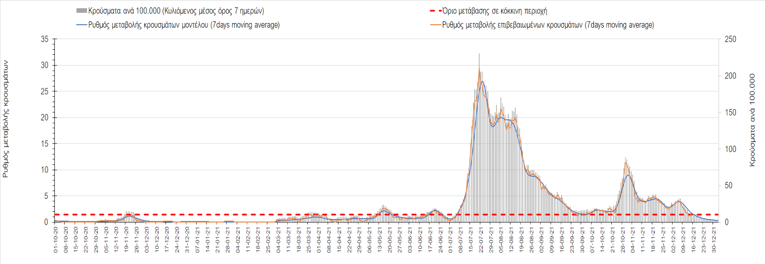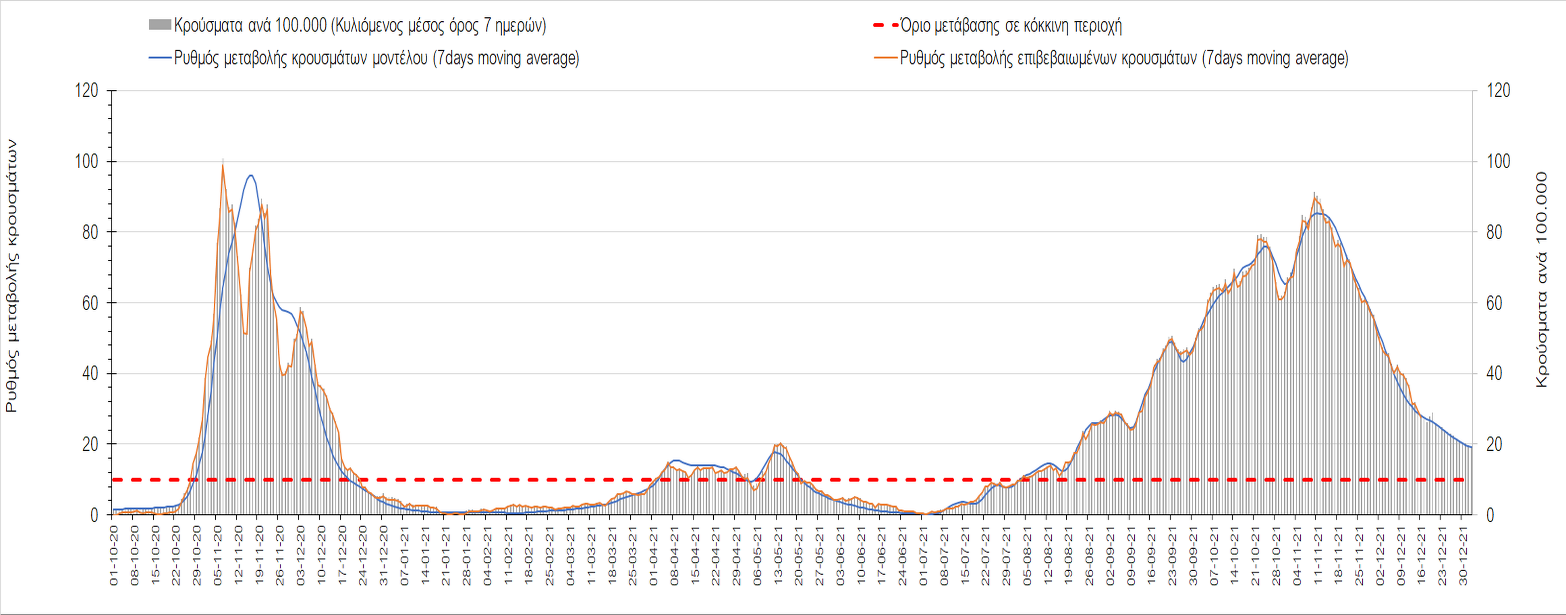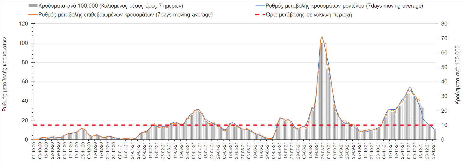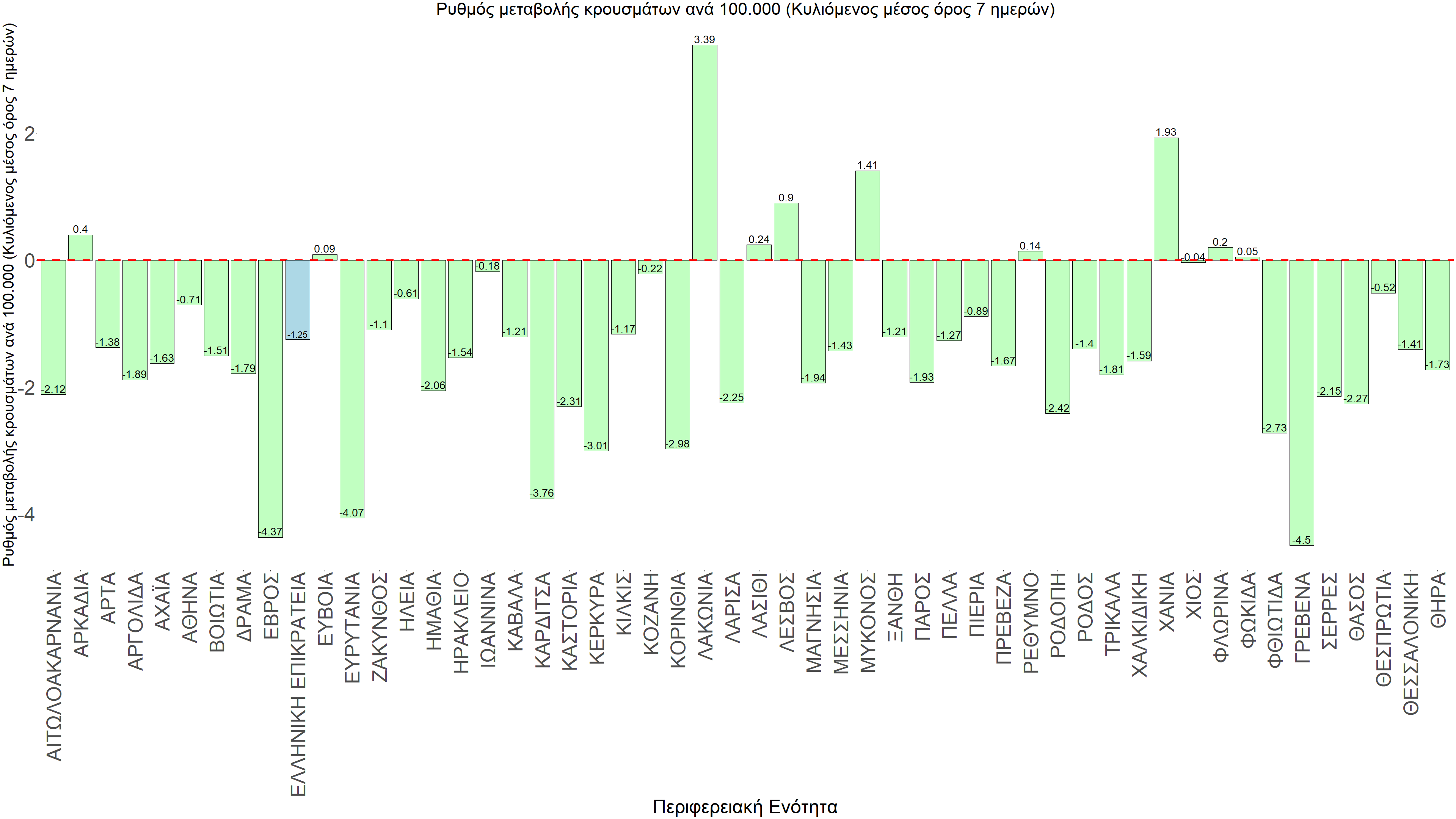 Η αποτύπωση των τάσεων στις επιμέρους περιοχές, παρουσιάζεται στο Σχήμα 61, όπου παρουσιάζεται ο ρυθμός μεταβολής των νέων κρουσμάτων ανά 100.000 κατοίκους (κυλιόμενος μέσος όρος 7 ημερών) των επιμέρους περιοχών. Θετικές τιμές του ρυθμού μεταβολής υποδηλώνουν άνοδο, ενώ αρνητικές τιμές υποδηλώνουν πτωτική πορεία. Το σχήμα αυτό είναι ιδιαίτερα κατατοπιστικό, γιατί οι τιμές που παρουσιάζονται είναι κανονικοποιημένες ως προς τον πληθυσμό, και η σύγκριση των τάσεων ανάμεσα στις επιμέρους περιοχές είναι άμεση.