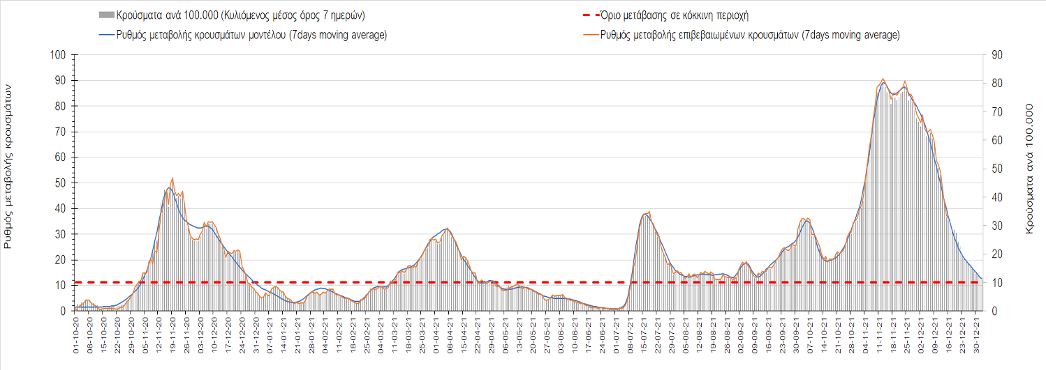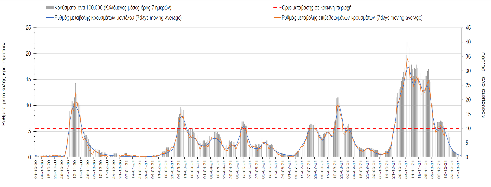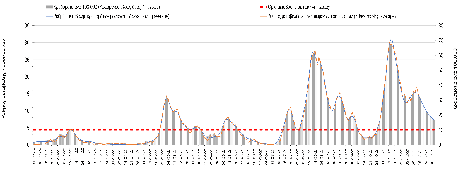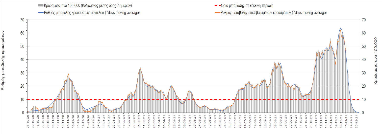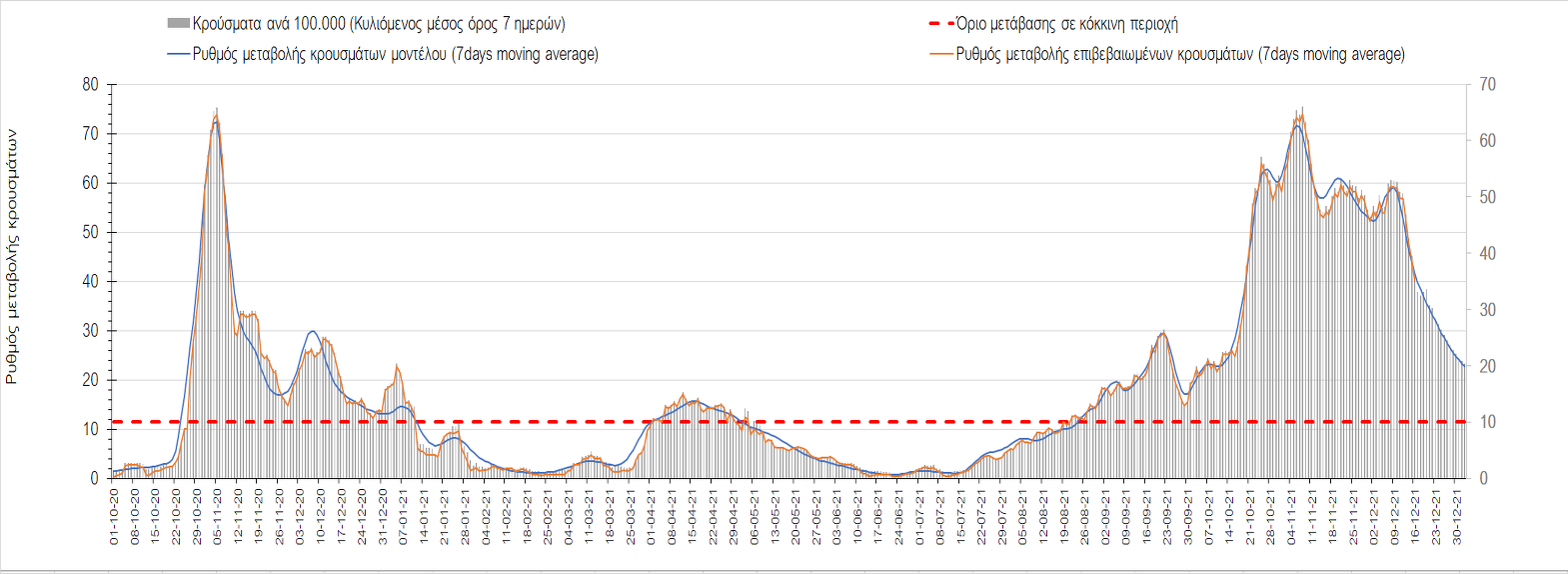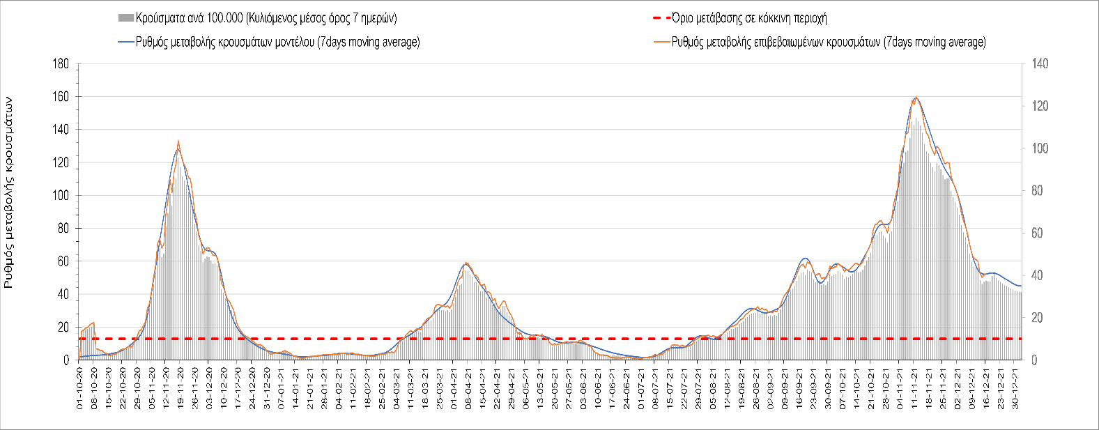 Η αποτύπωση των τάσεων στις επιμέρους περιοχές, παρουσιάζεται στο Σχήμα 61, όπου παρουσιάζεται ο ρυθμός μεταβολής των νέων κρουσμάτων ανά 100.000 κατοίκους (κυλιόμενος μέσος όρος 7 ημερών) των επιμέρους περιοχών. Θετικές τιμές του ρυθμού μεταβολής υποδηλώνουν άνοδο, ενώ αρνητικές τιμές υποδηλώνουν πτωτική πορεία. Το σχήμα αυτό είναι ιδιαίτερα κατατοπιστικό, γιατί οι τιμές που παρουσιάζονται είναι κανονικοποιημένες ως προς τον πληθυσμό, και η σύγκριση των τάσεων ανάμεσα στις επιμέρους περιοχές είναι άμεση.