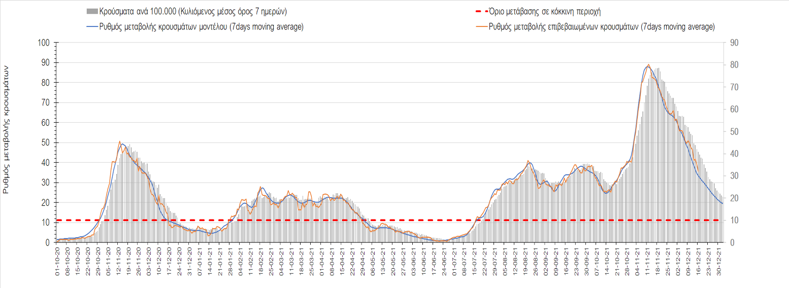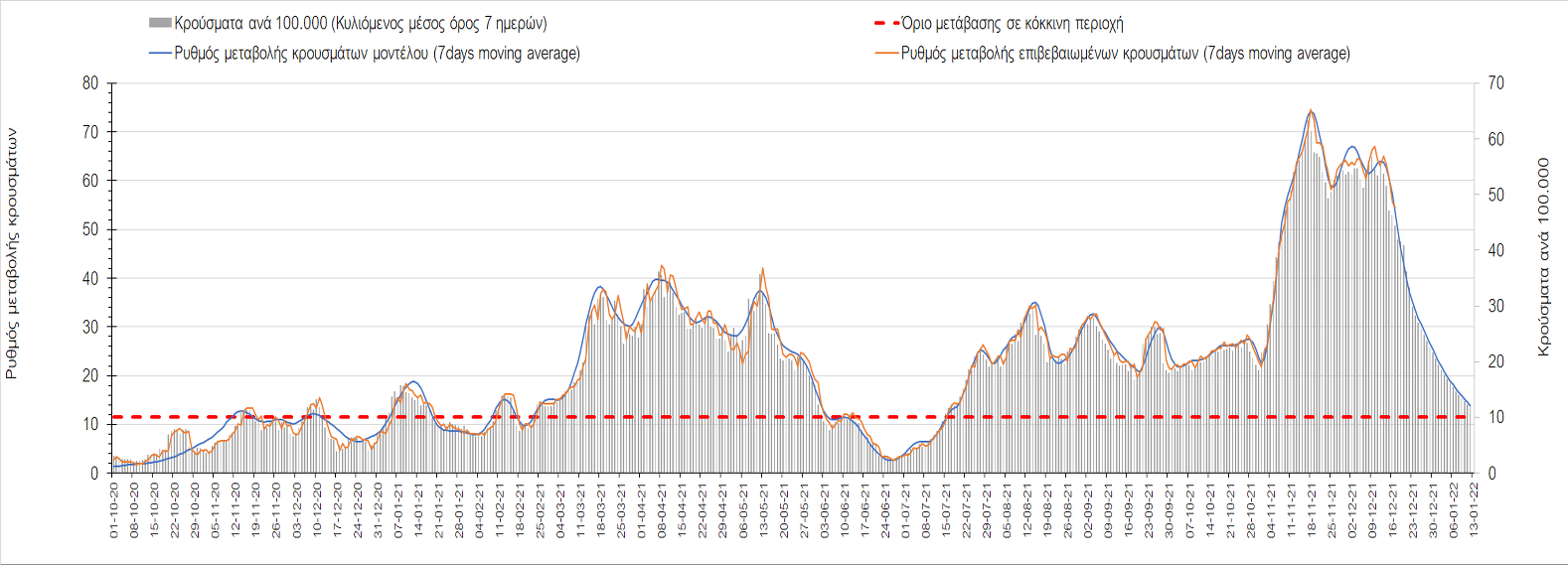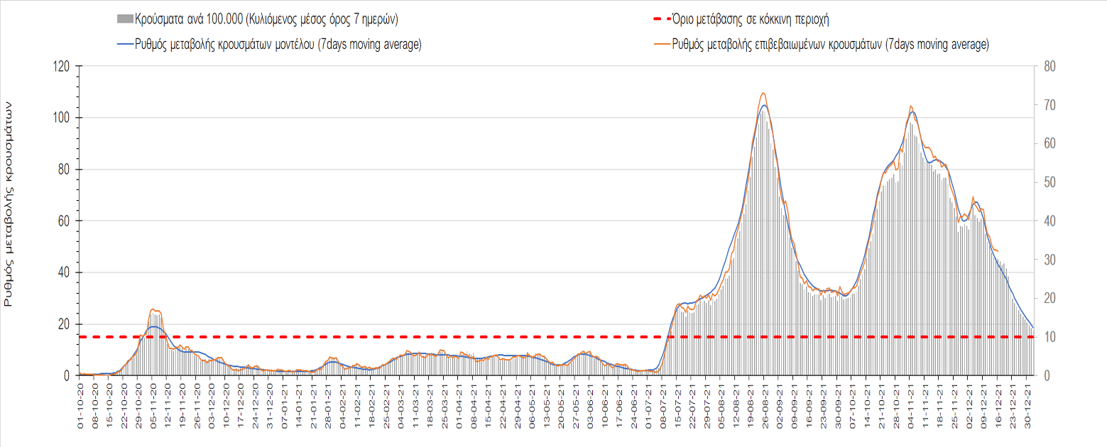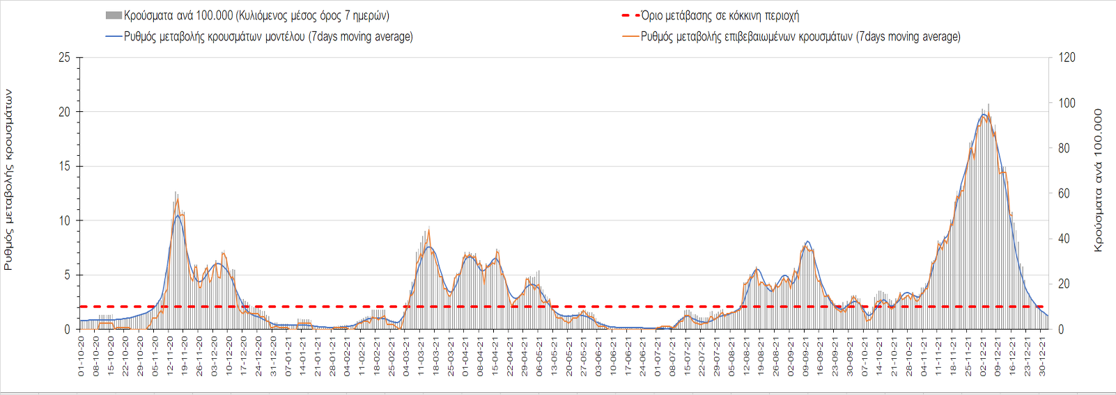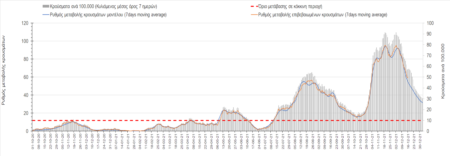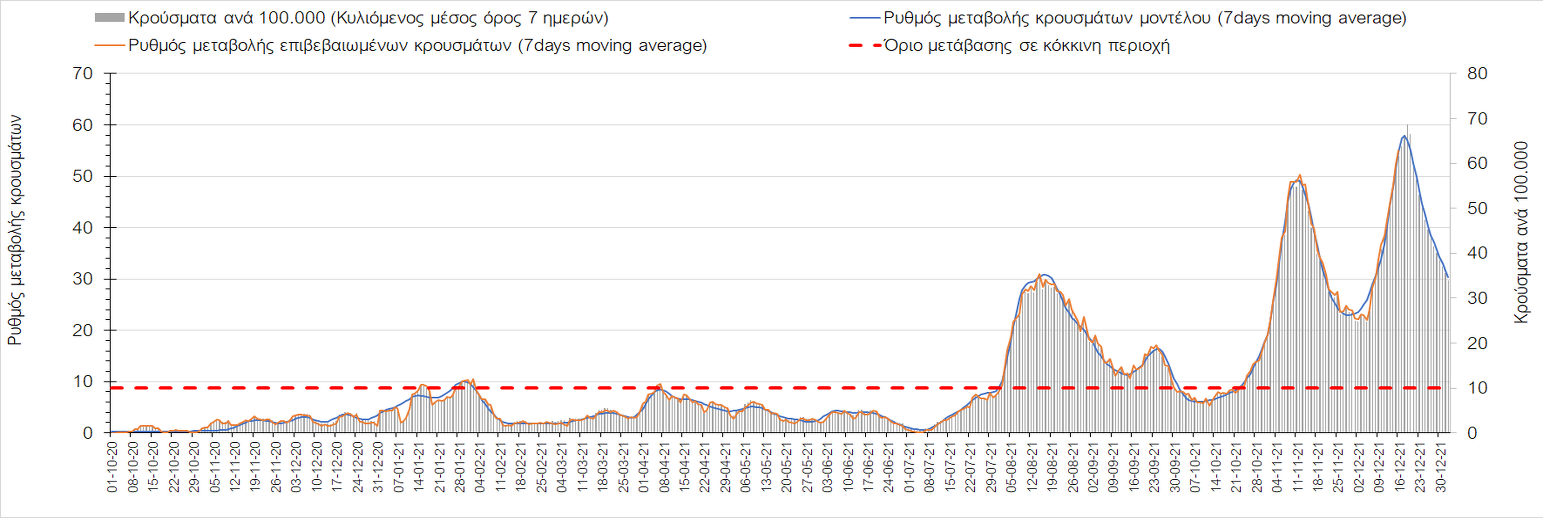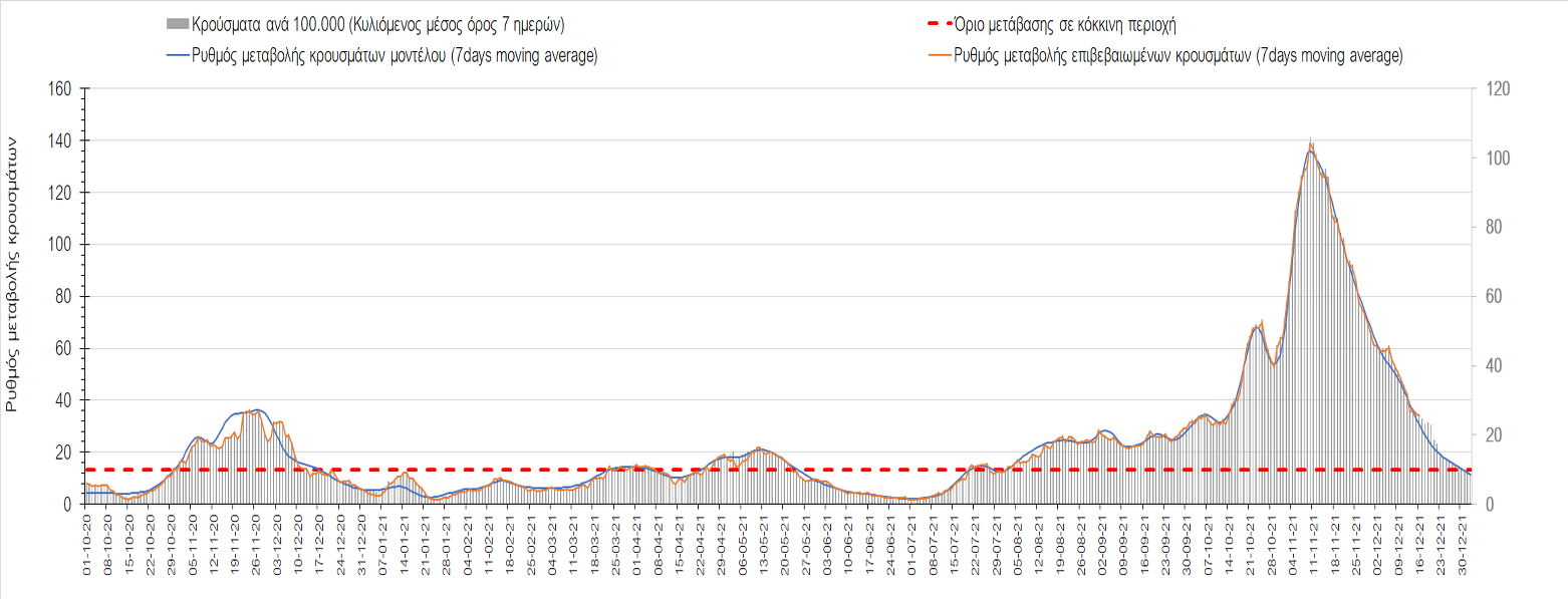 Η αποτύπωση των τάσεων στις επιμέρους περιοχές, παρουσιάζεται στο Σχήμα 61, όπου παρουσιάζεται ο ρυθμός μεταβολής των νέων κρουσμάτων ανά 100.000 κατοίκους (κυλιόμενος μέσος όρος 7 ημερών) των επιμέρους περιοχών. Θετικές τιμές του ρυθμού μεταβολής υποδηλώνουν άνοδο, ενώ αρνητικές τιμές υποδηλώνουν πτωτική πορεία. Το σχήμα αυτό είναι ιδιαίτερα κατατοπιστικό, γιατί οι τιμές που παρουσιάζονται είναι κανονικοποιημένες ως προς τον πληθυσμό, και η σύγκριση των τάσεων ανάμεσα στις επιμέρους περιοχές είναι άμεση.