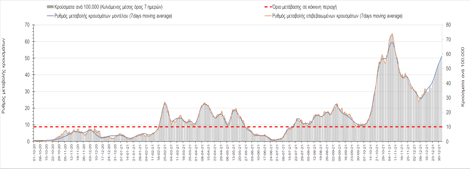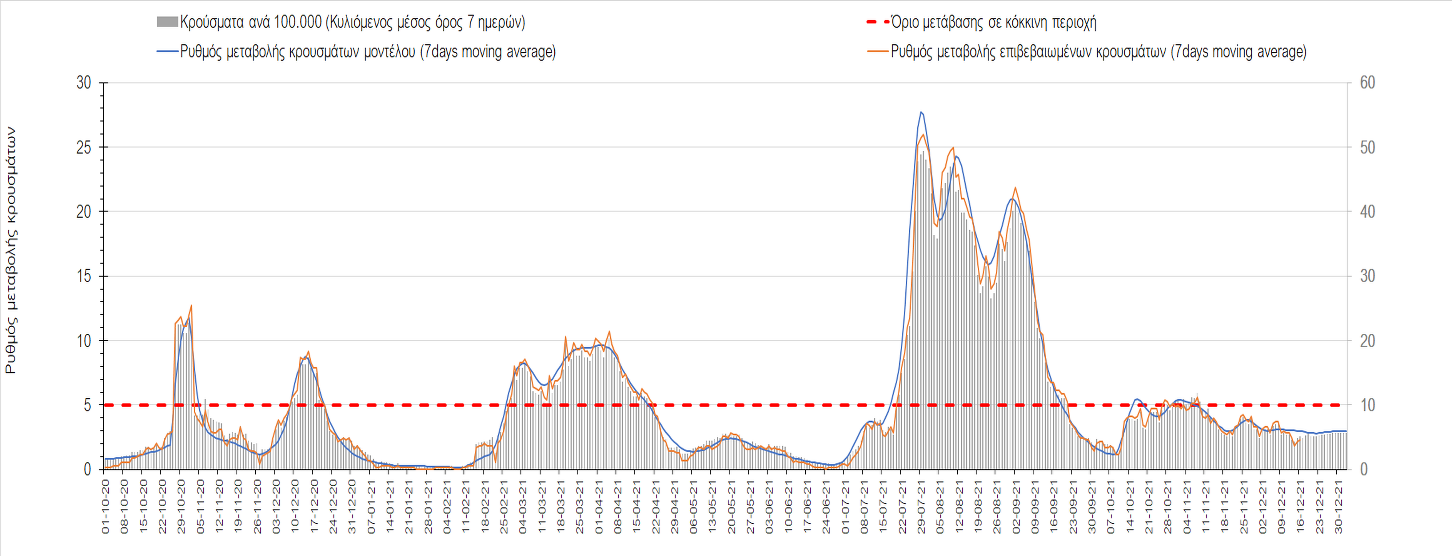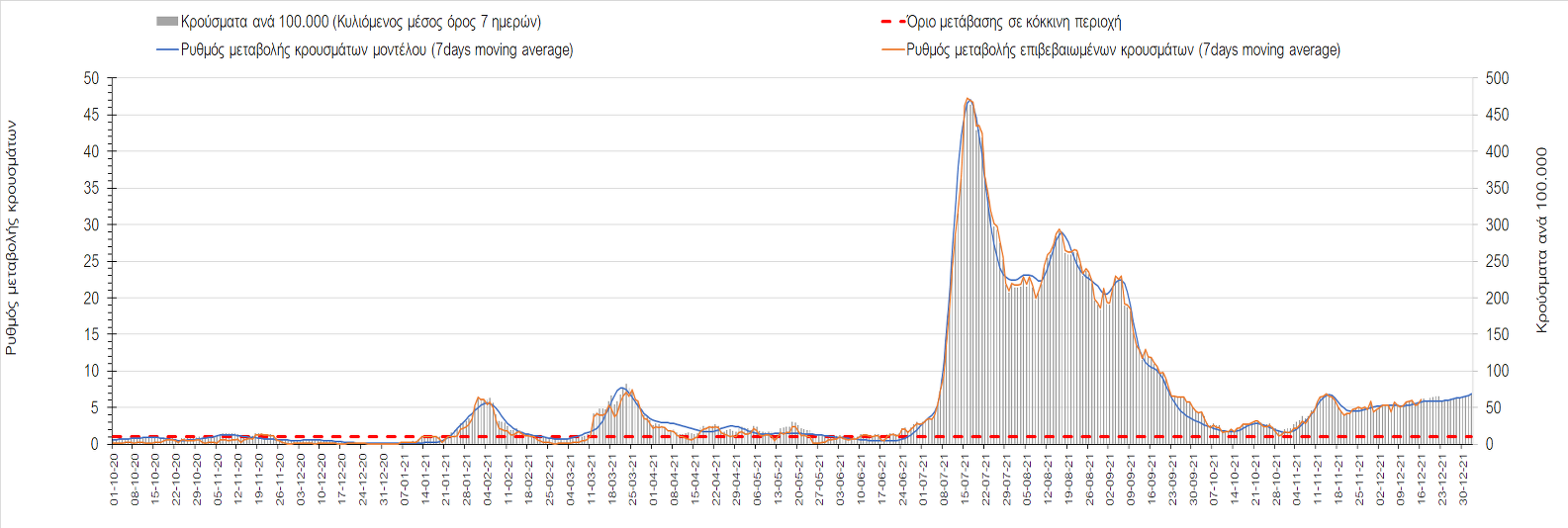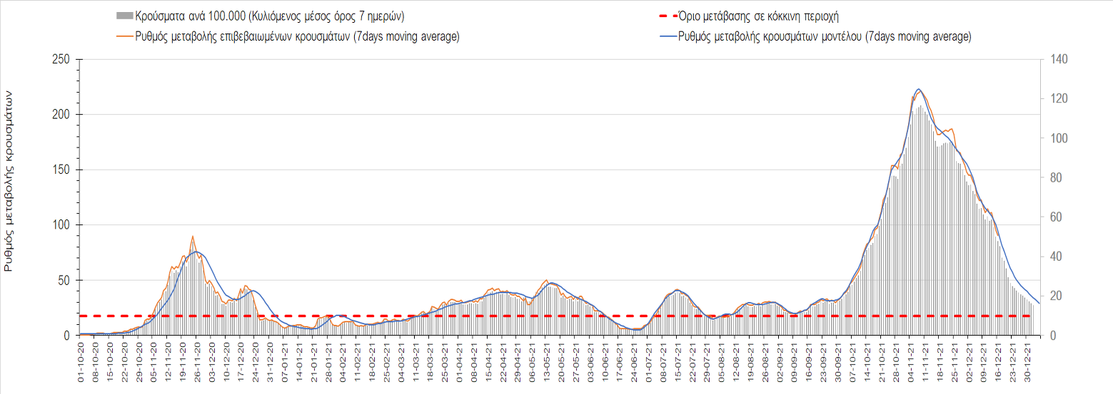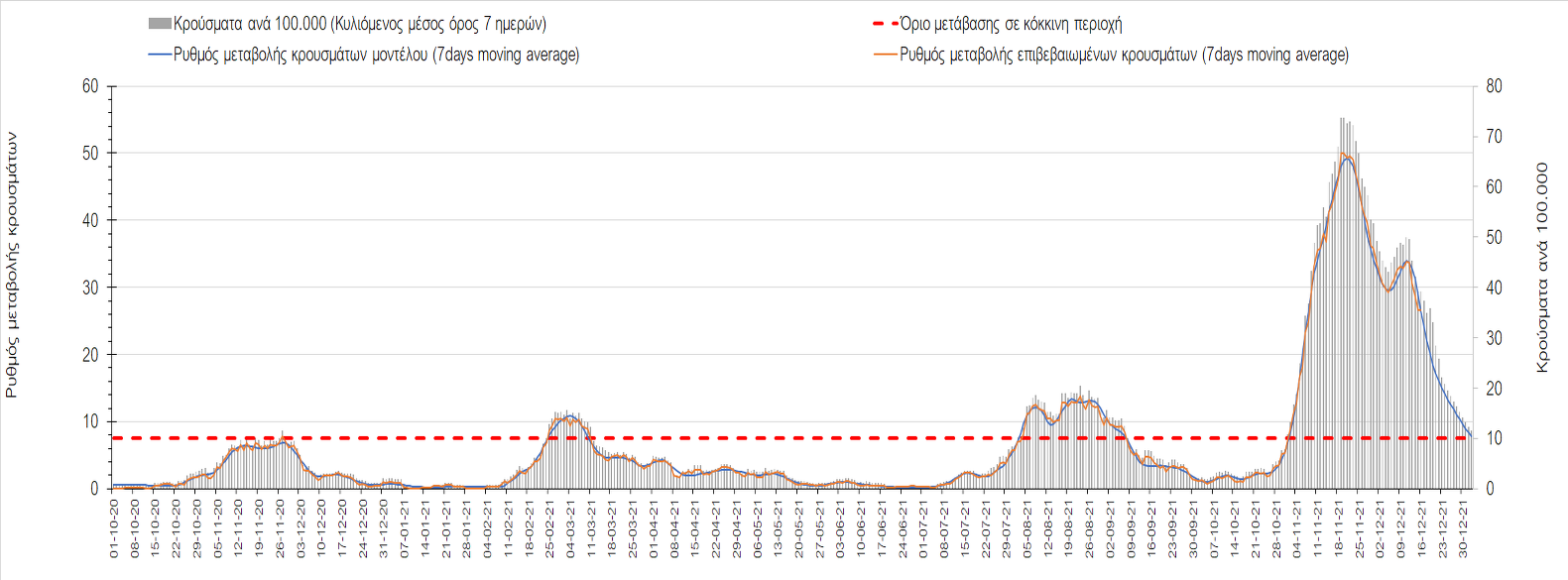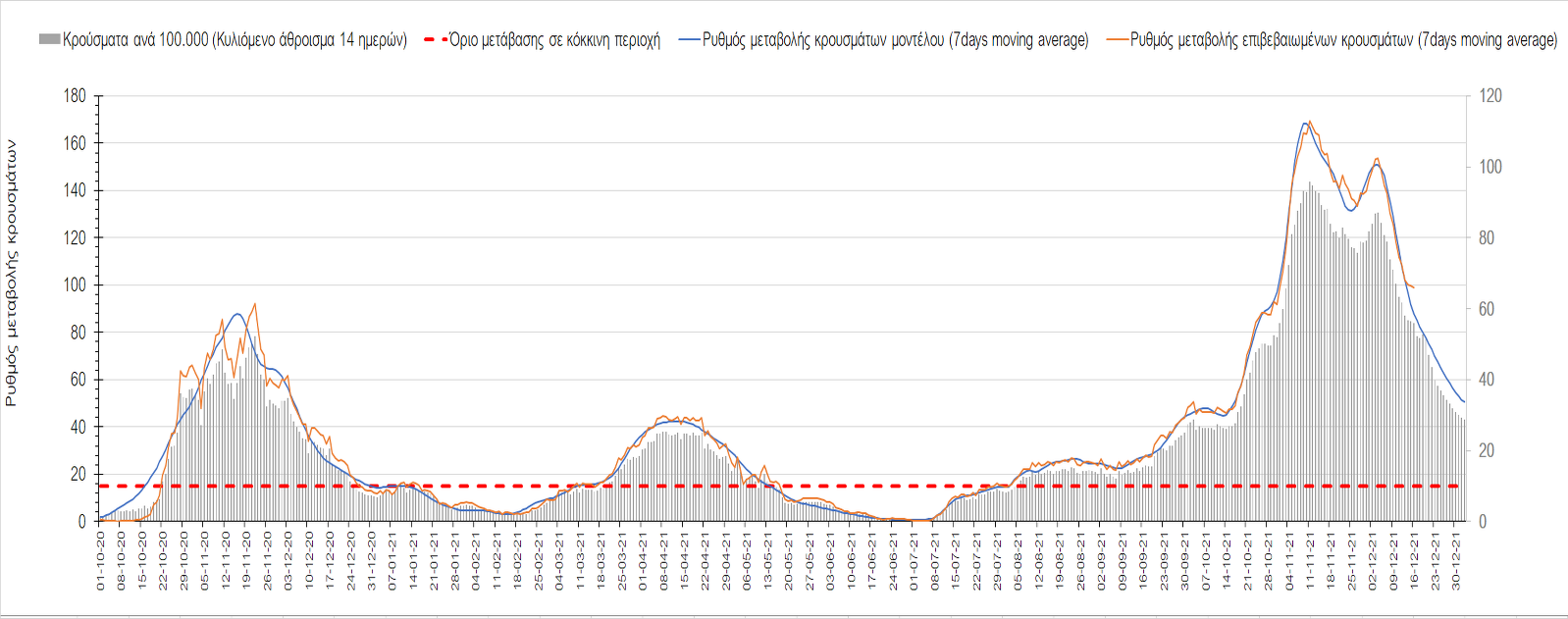 Η αποτύπωση των τάσεων στις επιμέρους περιοχές, παρουσιάζεται στο Σχήμα 61, όπου παρουσιάζεται ο ρυθμός μεταβολής των νέων κρουσμάτων ανά 100.000 κατοίκους (κυλιόμενος μέσος όρος 7 ημερών) των επιμέρους περιοχών. Θετικές τιμές του ρυθμού μεταβολής υποδηλώνουν άνοδο, ενώ αρνητικές τιμές υποδηλώνουν πτωτική πορεία. Το σχήμα αυτό είναι ιδιαίτερα κατατοπιστικό, γιατί οι τιμές που παρουσιάζονται είναι κανονικοποιημένες ως προς τον πληθυσμό, και η σύγκριση των τάσεων ανάμεσα στις επιμέρους περιοχές είναι άμεση.