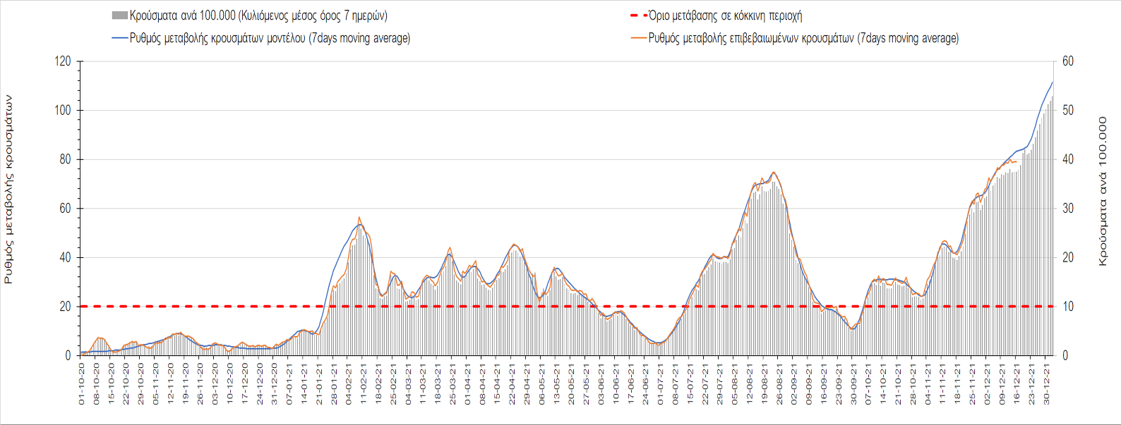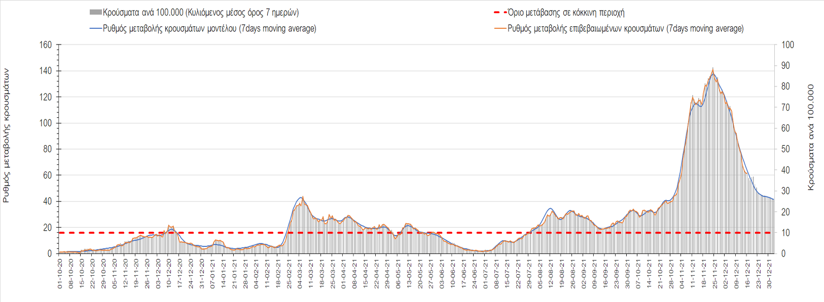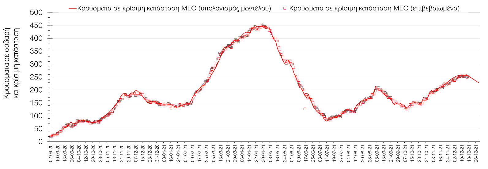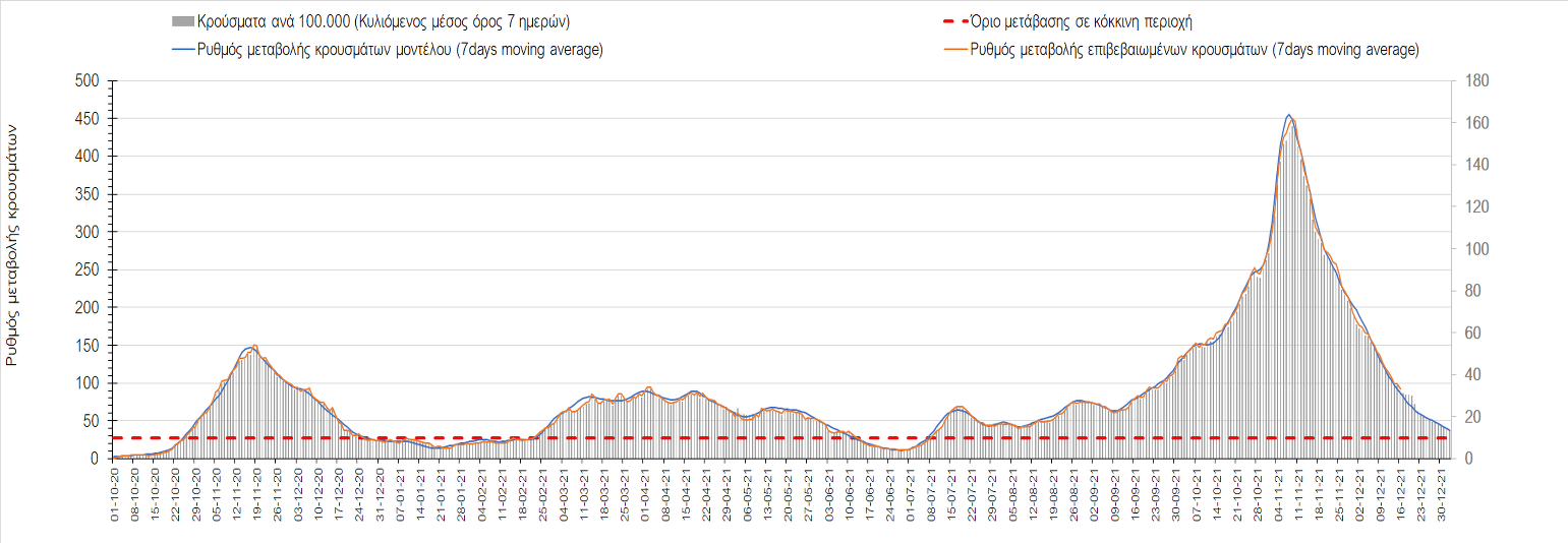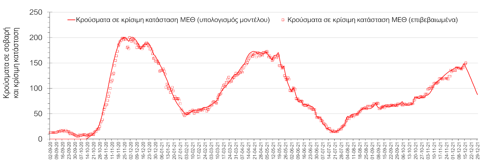 Η πορεία της μέσης εβδομαδιαίας τιμής των κρουσμάτων, καθώς και του κυλιόμενου μέσου όρου 7 ημερών του αριθμού των κρουσμάτων ανά 100.000 πληθυσμού, όπως έχουν καταγραφεί από τον ΕΟΔΥ και η αναμενόμενη πορεία τους όπως προδιαγράφεται από την υπολογιστική πλατφόρμα CORE για την Ελληνική επικράτεια μέχρι τις 31 Δεκεμβρίου, αποτυπώνονται στο Σχήμα 4. Αυτή η προβλεπόμενη πορεία, που αφορά τα κρούσματα, τους νοσηλευόμενους σε απλές κλίνες, όσο και σε ΜΕΘ, καθώς επίσης και τους θανάτους, βασίζεται στις ακόλουθες παραδοχές: