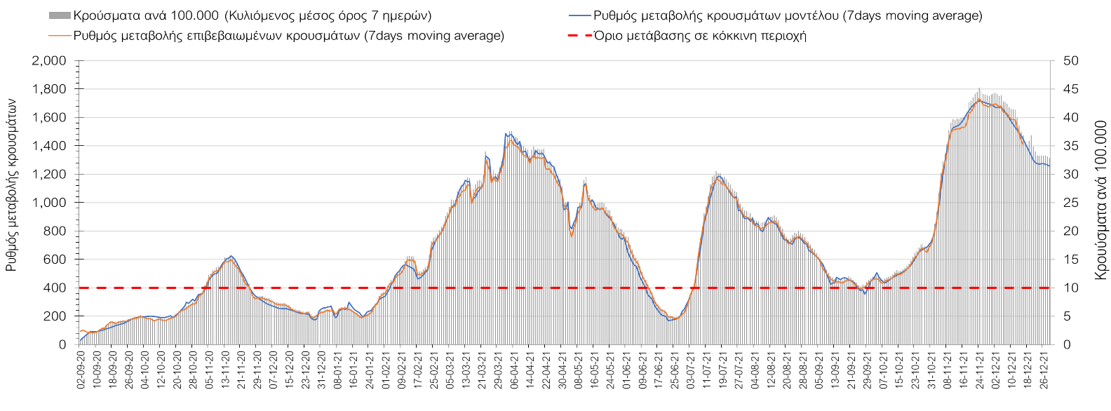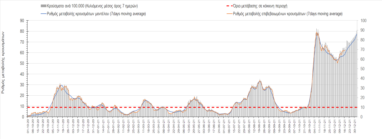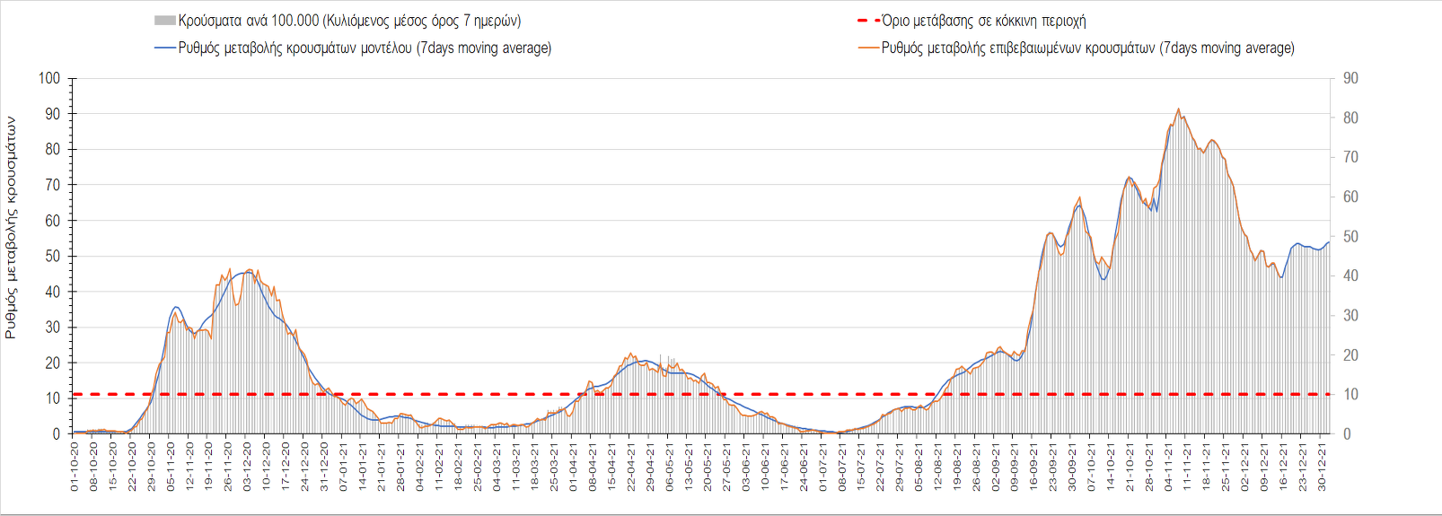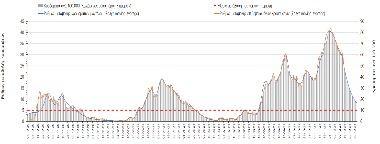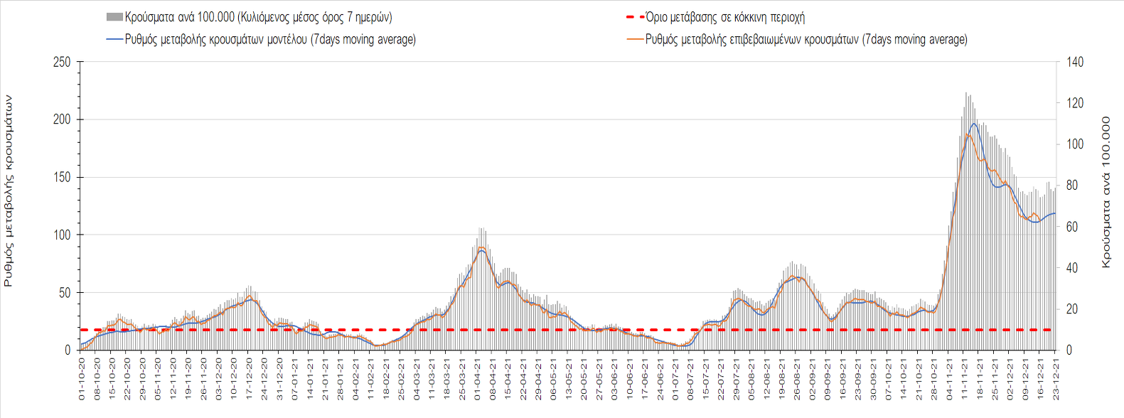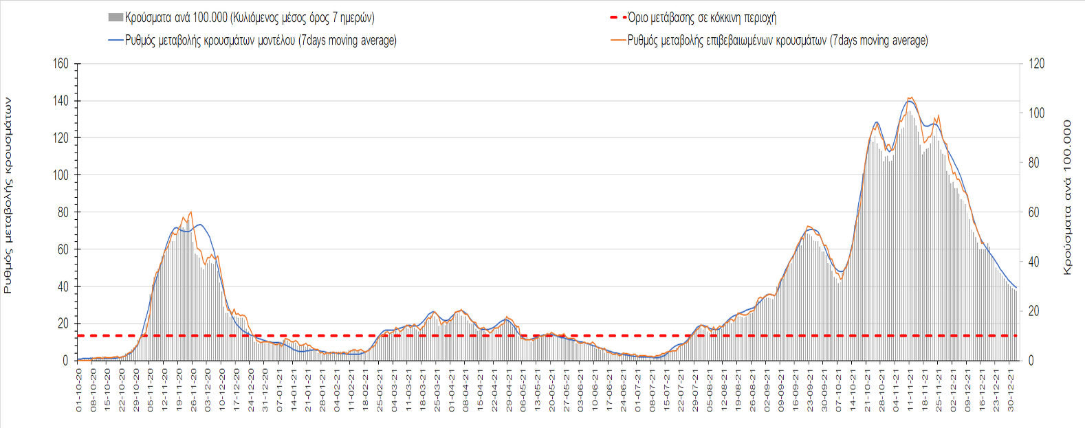 Η πορεία της μέσης εβδομαδιαίας τιμής των κρουσμάτων, καθώς και του κυλιόμενου μέσου όρου 7 ημερών του αριθμού των κρουσμάτων ανά 100.000 πληθυσμού, όπως έχουν καταγραφεί από τον ΕΟΔΥ και η αναμενόμενη πορεία τους όπως προδιαγράφεται από την υπολογιστική πλατφόρμα CORE για την Ελληνική επικράτεια μέχρι τις 31 Δεκεμβρίου, αποτυπώνονται στο Σχήμα 4. Αυτή η προβλεπόμενη πορεία, που αφορά τα κρούσματα, τους νοσηλευόμενους σε απλές κλίνες, όσο και σε ΜΕΘ, καθώς επίσης και τους θανάτους, βασίζεται στις ακόλουθες παραδοχές: