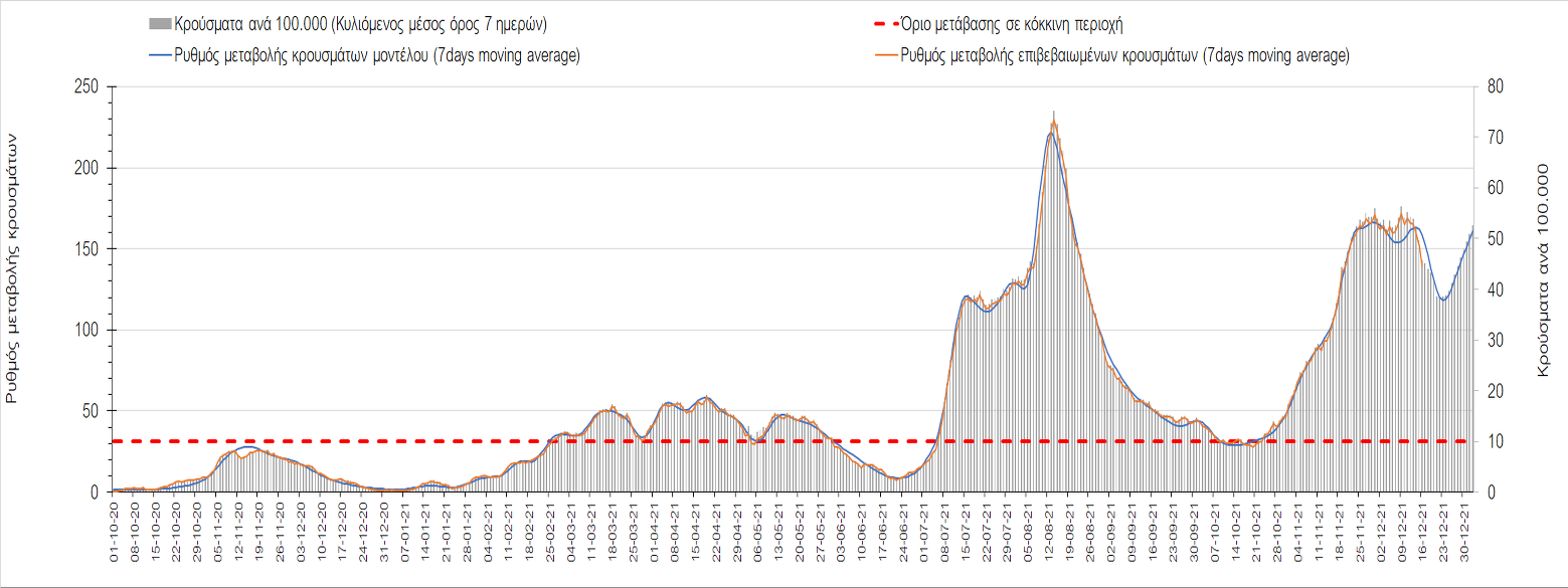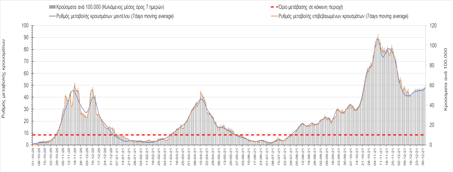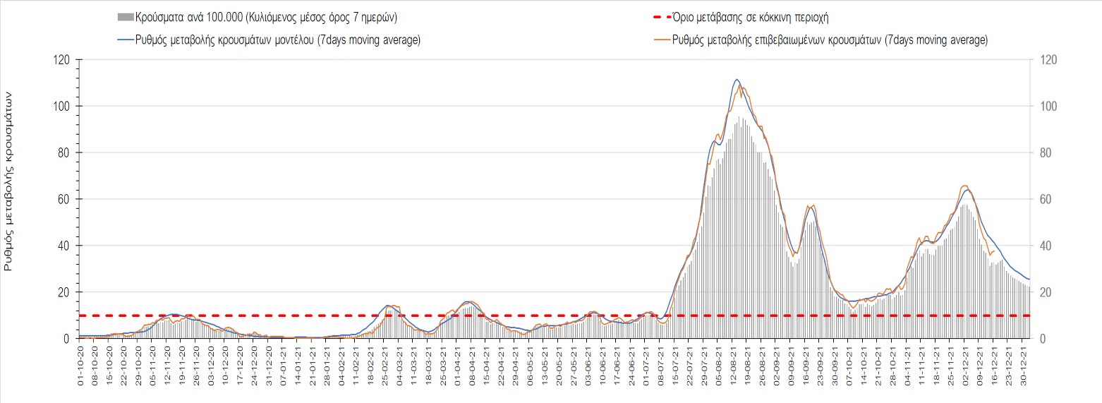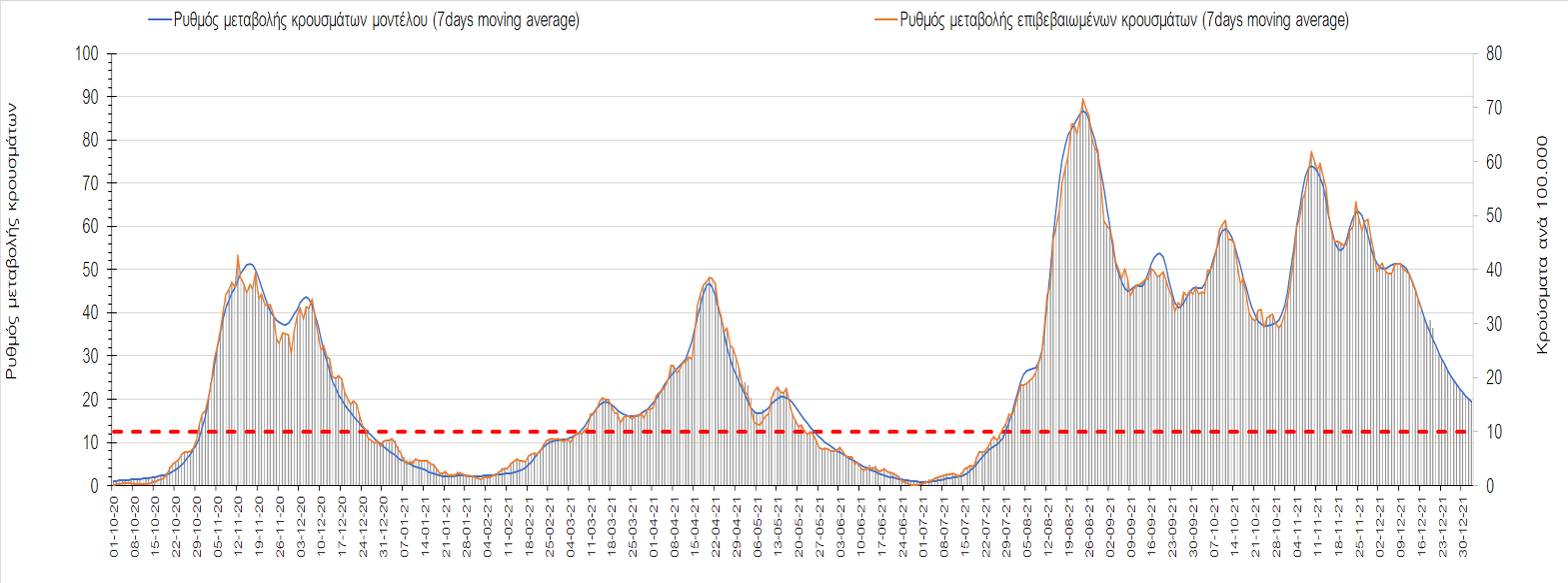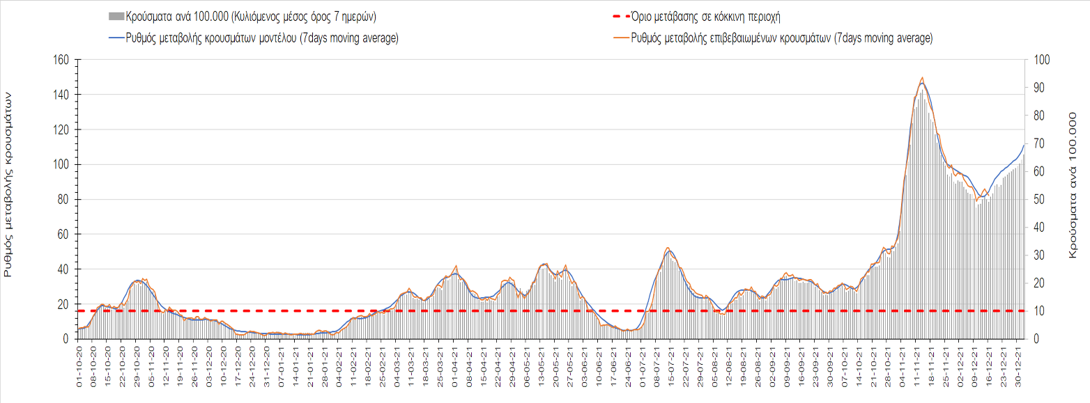 Η πορεία της μέσης εβδομαδιαίας τιμής των κρουσμάτων, καθώς και του κυλιόμενου μέσου όρου 7 ημερών του αριθμού των κρουσμάτων ανά 100.000 πληθυσμού, όπως έχουν καταγραφεί από τον ΕΟΔΥ και η αναμενόμενη πορεία τους όπως προδιαγράφεται από την υπολογιστική πλατφόρμα CORE για την Ελληνική επικράτεια μέχρι τις 31 Δεκεμβρίου, αποτυπώνονται στο Σχήμα 4. Αυτή η προβλεπόμενη πορεία, που αφορά τα κρούσματα, τους νοσηλευόμενους σε απλές κλίνες, όσο και σε ΜΕΘ, καθώς επίσης και τους θανάτους, βασίζεται στις ακόλουθες παραδοχές: