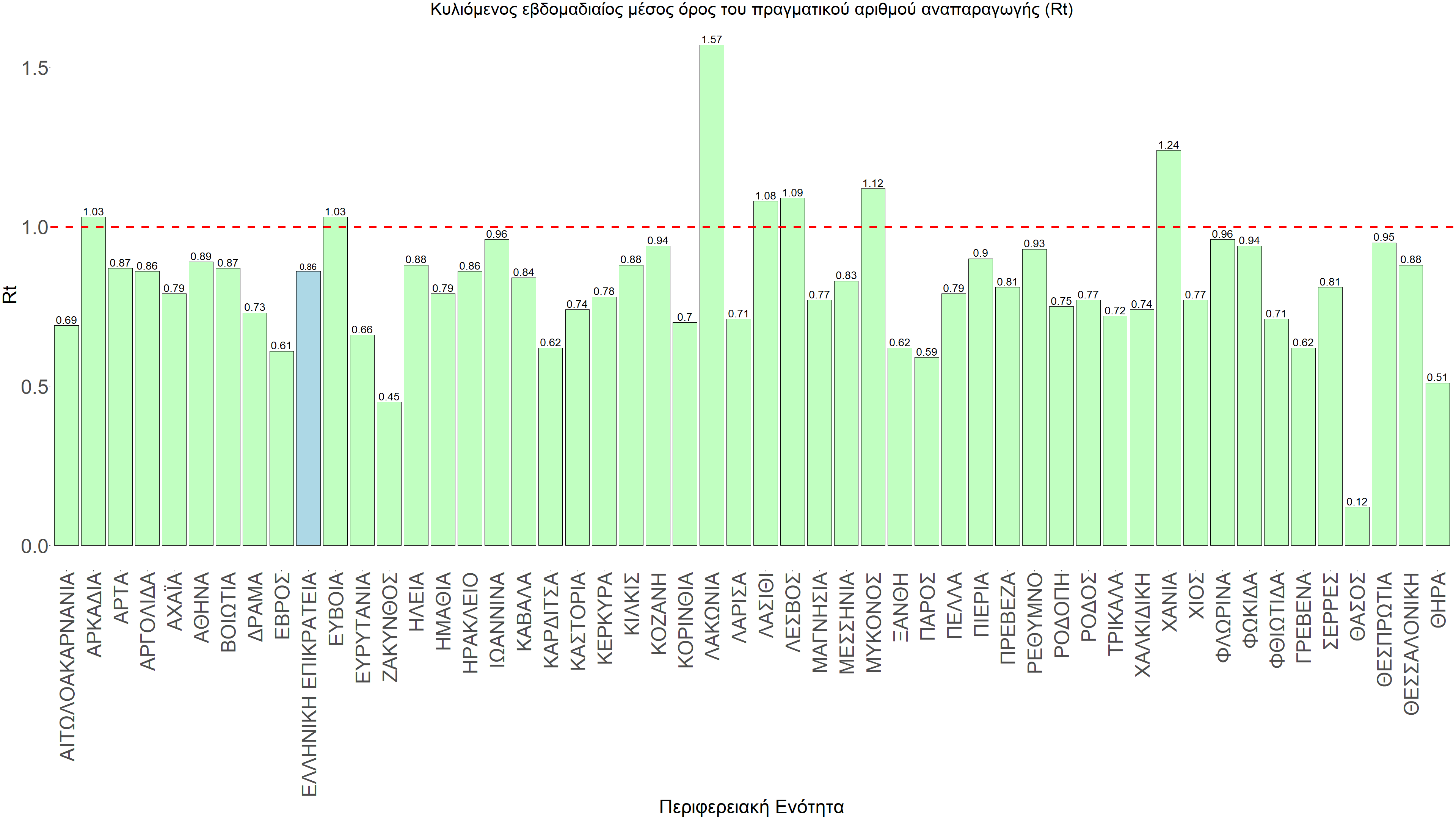 O πραγματικός αριθμός αναπαραγωγής Rt ανά περιφερειακή ενότητα της χώρας παρουσιάζεται στο Σχήμα 58.