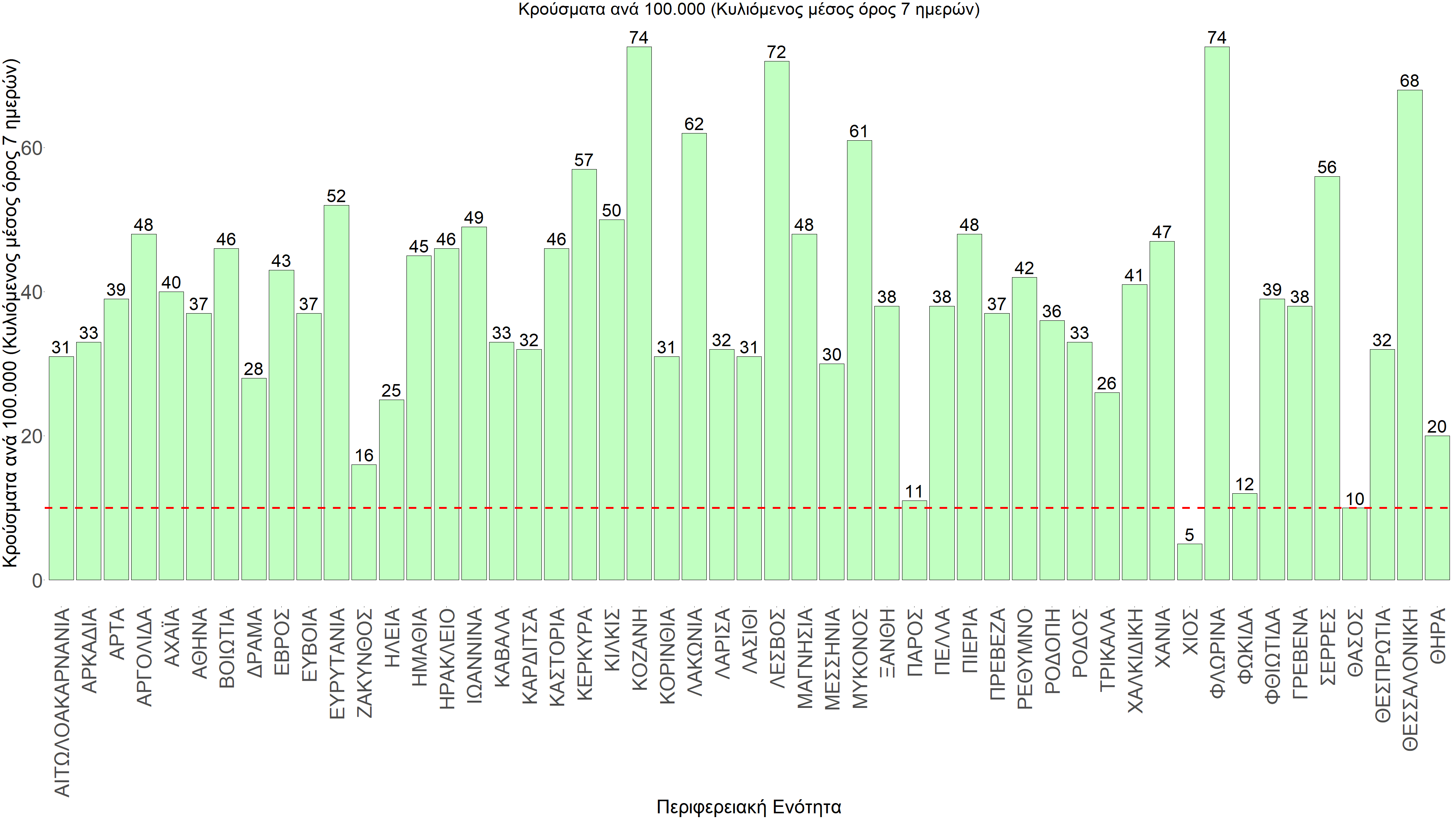 Σχήμα 60. Συγκεντρωτική εικόνα των νέων κρουσμάτων ανά 100.000 κατοίκους (κυλιόμενος μέσος όρος 7 ημερών) των επιμέρους περιοχών