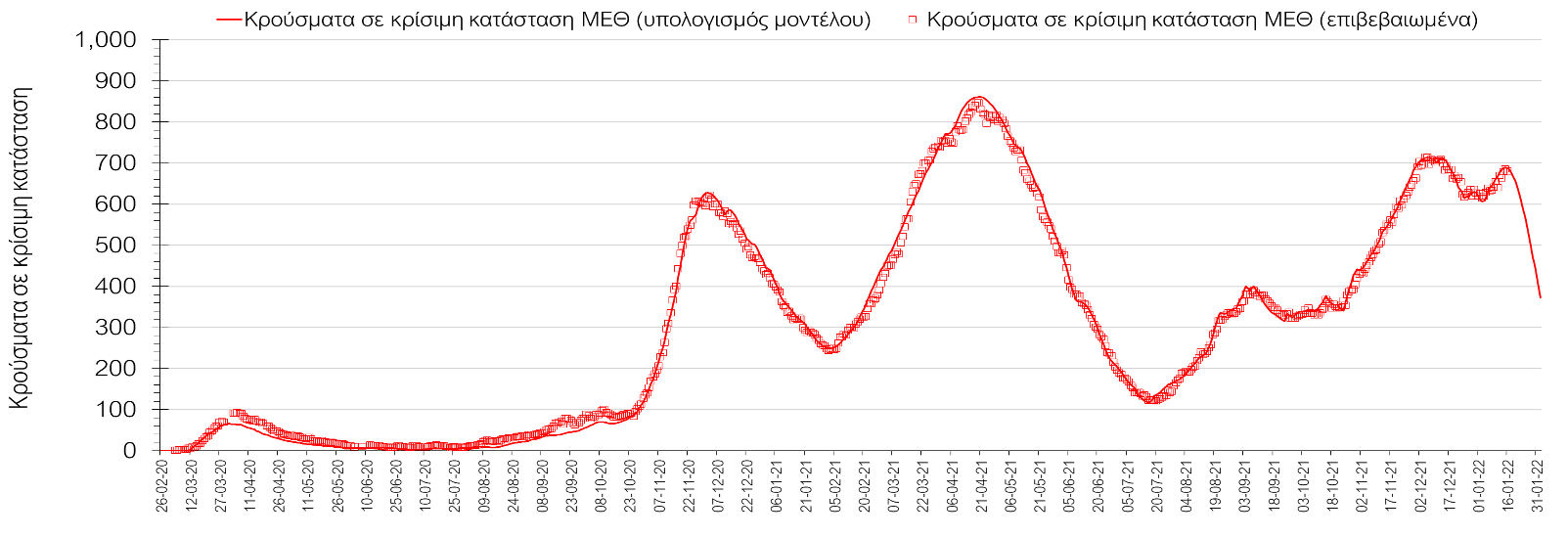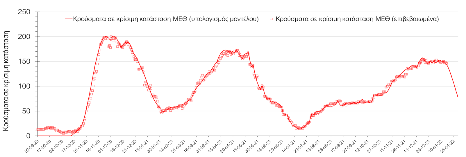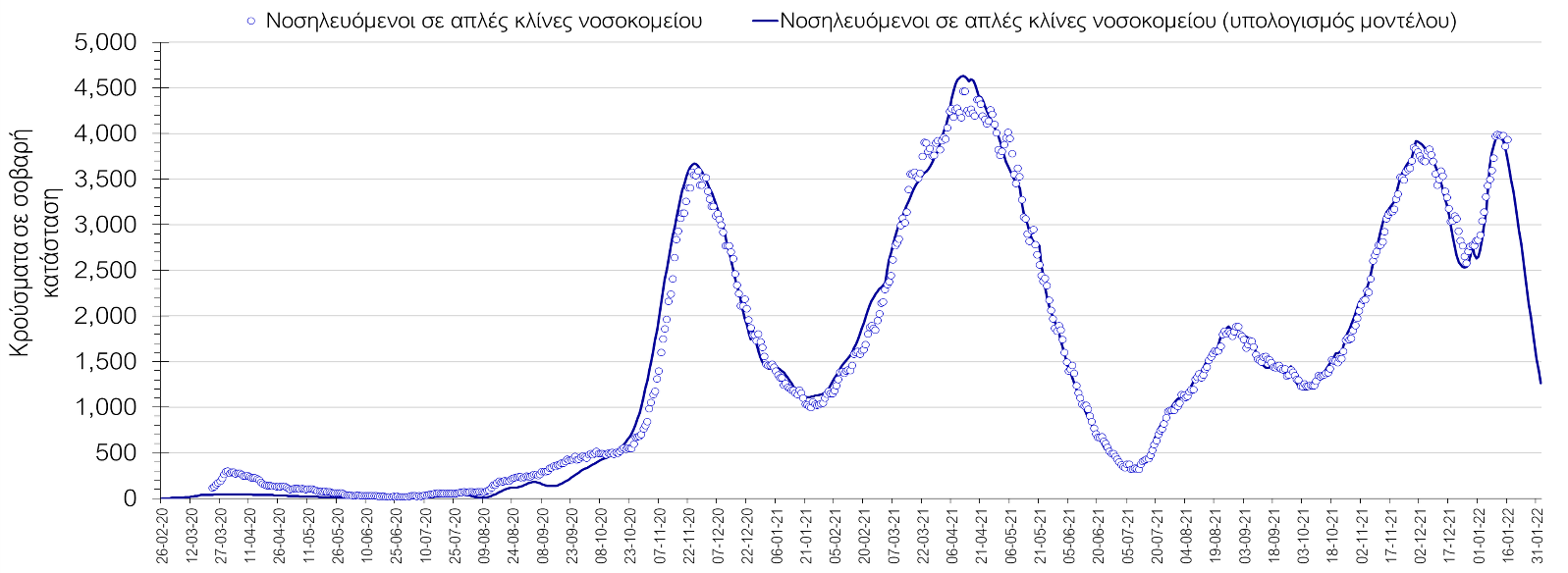 Η πορεία της μέσης εβδομαδιαίας τιμής των κρουσμάτων, καθώς και του κυλιόμενου μέσου όρου 7 ημερών του αριθμού των κρουσμάτων ανά 100.000 πληθυσμού, όπως έχουν καταγραφεί από τον ΕΟΔΥ και η αναμενόμενη πορεία τους όπως προδιαγράφεται από την υπολογιστική πλατφόρμα CORE για την Ελληνική επικράτεια μέχρι τις 31  Ιανουαρίου, αποτυπώνονται στο Σχήμα 4. Αυτή η προβλεπόμενη πορεία, που αφορά τα κρούσματα, τους νοσηλευόμενους σε απλές κλίνες, όσο και σε ΜΕΘ, καθώς επίσης και τους θανάτους, βασίζεται στις ακόλουθες παραδοχές:
