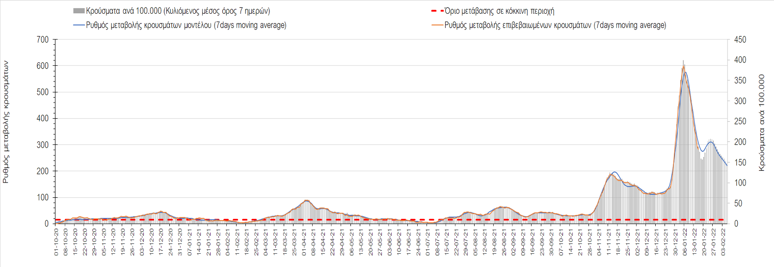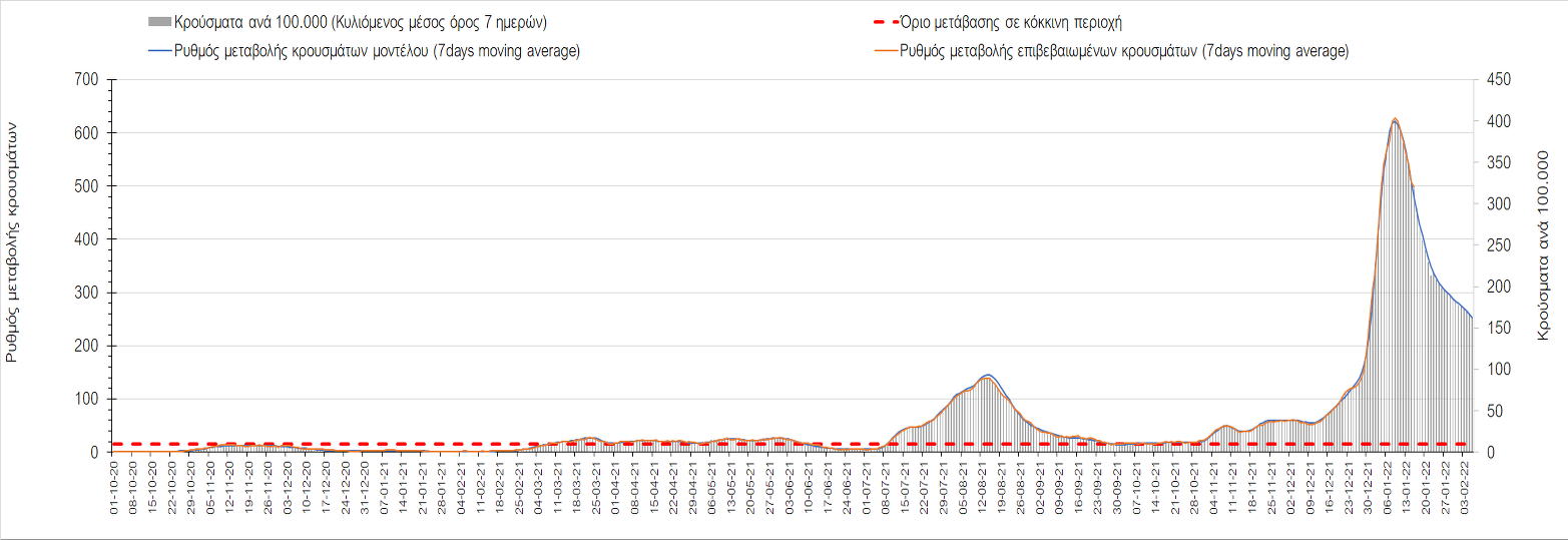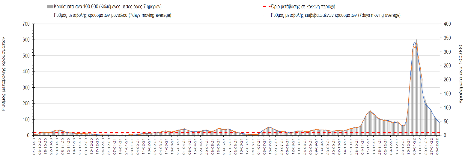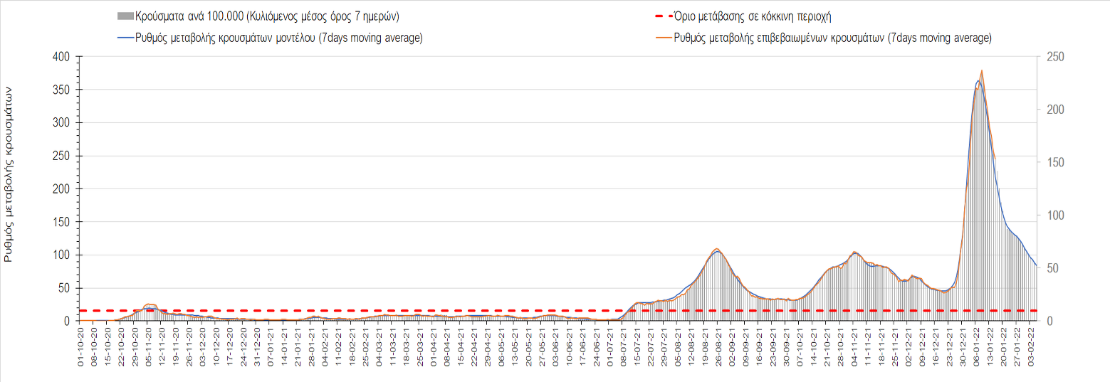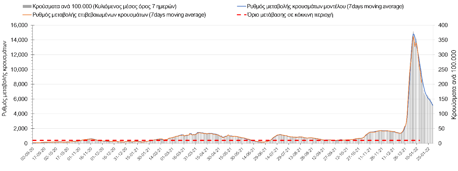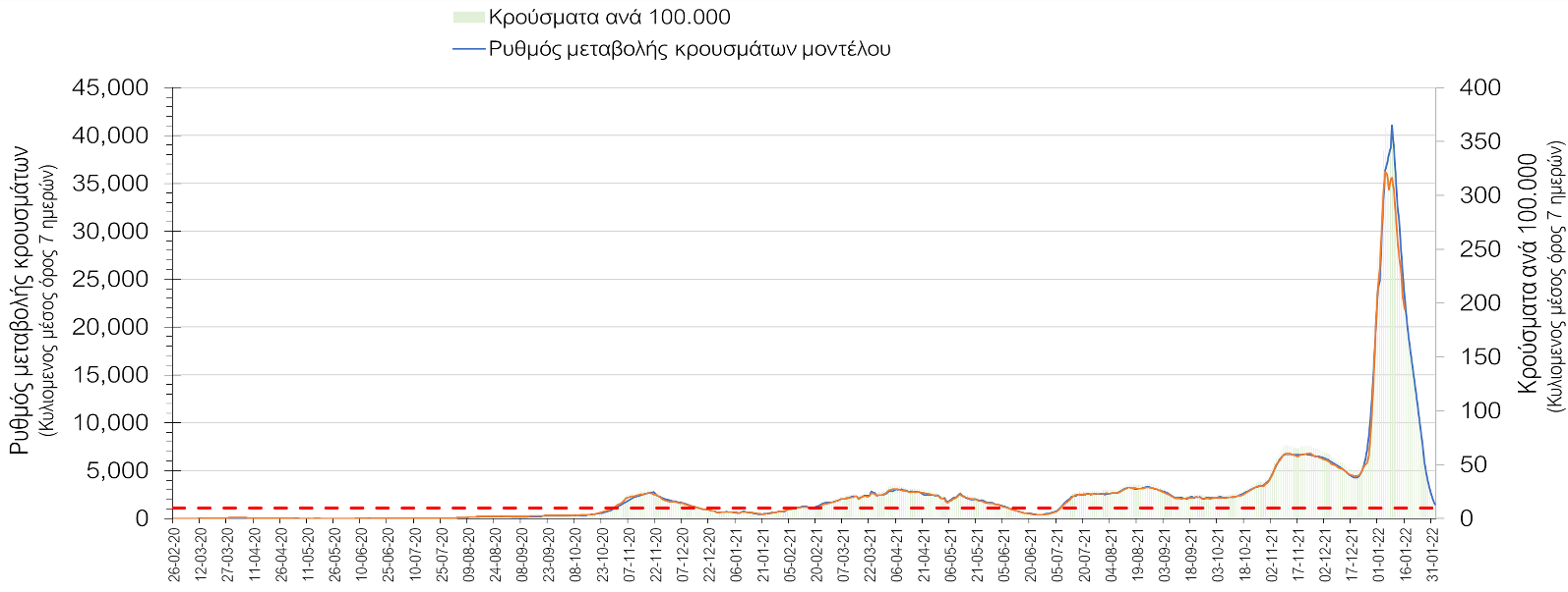 Η ανοδική τάση που είχε διαμορφωθεί από τις 23/12 και που οφείλεται στην μετάλλαξη Ο, έχει περιέλθει σε πτωτική, και αντικατοπτρίζεται στον ημερήσιο αριθμό των κρουσμάτων (κυλιόμενος μέσος όρος 7 ημερών), ο οποίος βρίσκεται κάτω από τις 22.000 (21.874). Αυτή αποτυπώνεται πλέον σε όλες σχεδόν τις περιοχές, πράγμα που σημαίνει ότι τα μέτρα που εφαρμοστήκαν στις 24 και 29/12 συντέλεσαν στον περιορισμό του ρυθμού ανόδου, ενώ, πέρα από την εφαρμογή των μέτρων, και από το ποσοστό εμβολιασμού (και μάλιστα με 3η δόση), έχει αυξηθεί πιο σημαντικά από το αναμενόμενο το ποσοστό φυσικής ανοσίας, λόγω του μεγάλου αριθμού ασυμπτωματικών που νόσησαν από το στέλεχος Ο. Πέρα από την εφαρμογή των μέτρων (σε συνδυασμό με την σημαντική συνειδητοποίηση εκ μέρους του πληθυσμού ότι χρειάζεται προσοχή και σύνεση για την αντιμετώπιση της διασποράς της παραλλαγής Ο), η συστηματική αποκλιμάκωση της πανδημίας (της οποίας η έναρξη όπως ήδη βλέπουμε να τοποθετείται σε διαφορετικό χρονικό σημείο ανά περιοχή) θα οφείλεται στο συνδυασμό των επιπέδων ανοσίας του πληθυσμού (επίκτητη και φυσική), αλλά και στον πολύ μεγάλο αριθμό των τεστ συνολικά (μοριακά, rapid και self-test) που πραγματοποιούνται καθημερινά, των οποίων ο αριθμός έχει φθάσει σε ημερήσια βάση τις 700.000.
