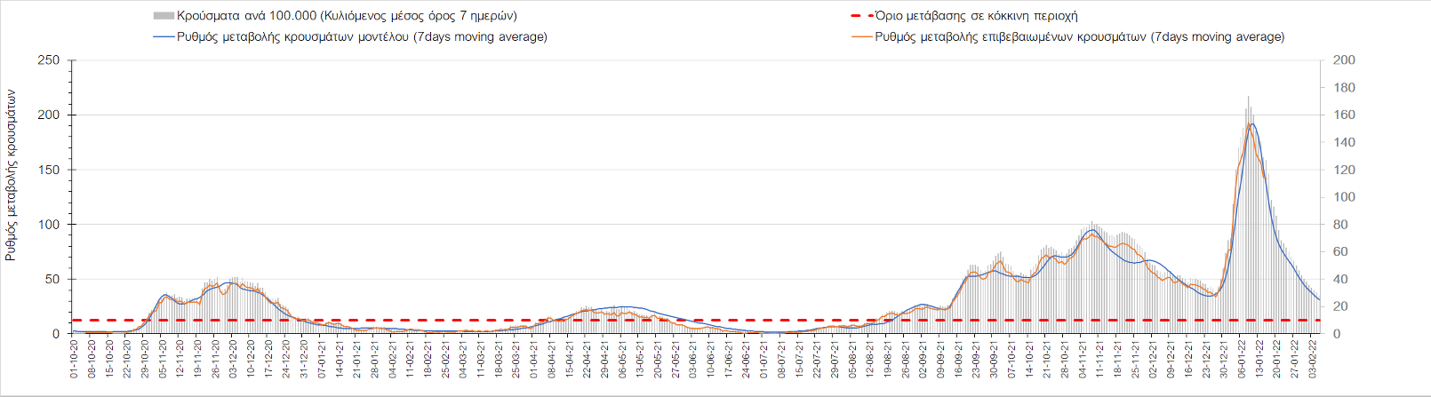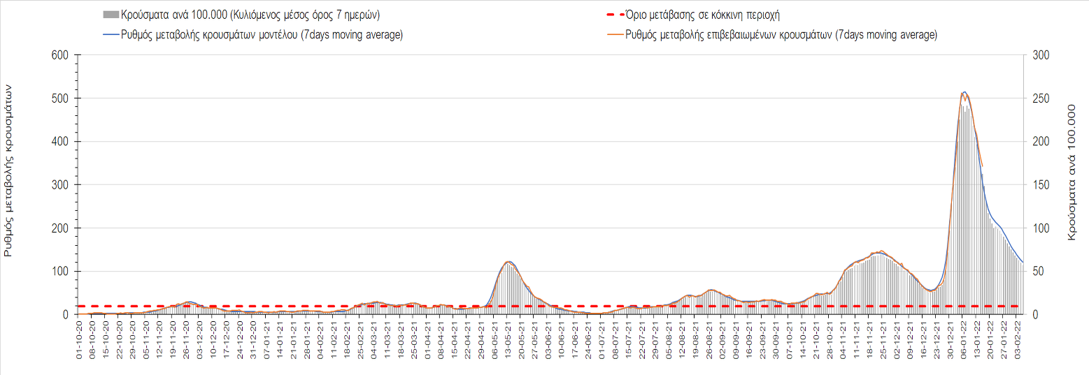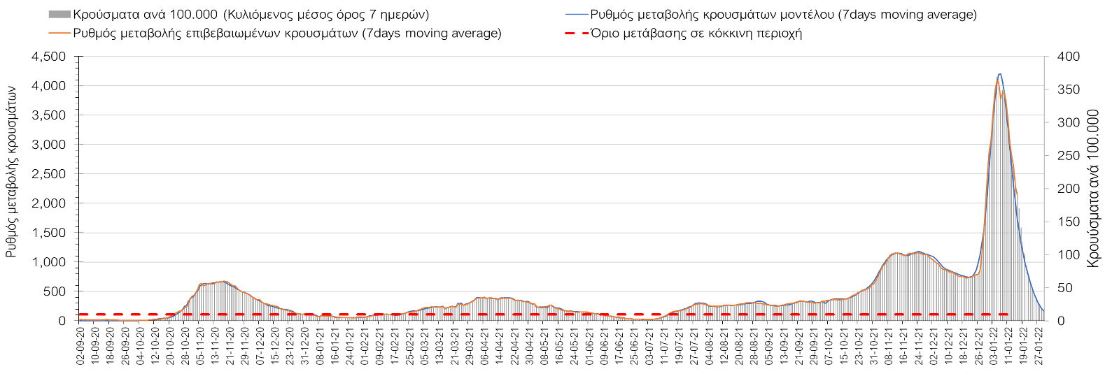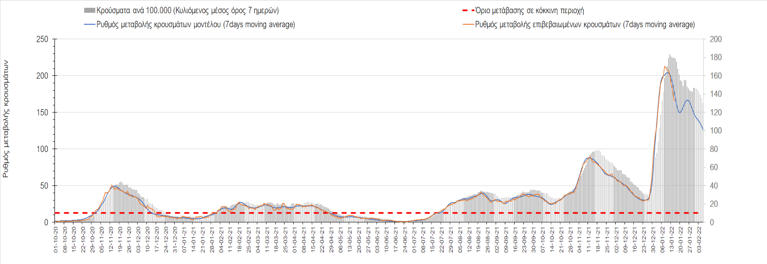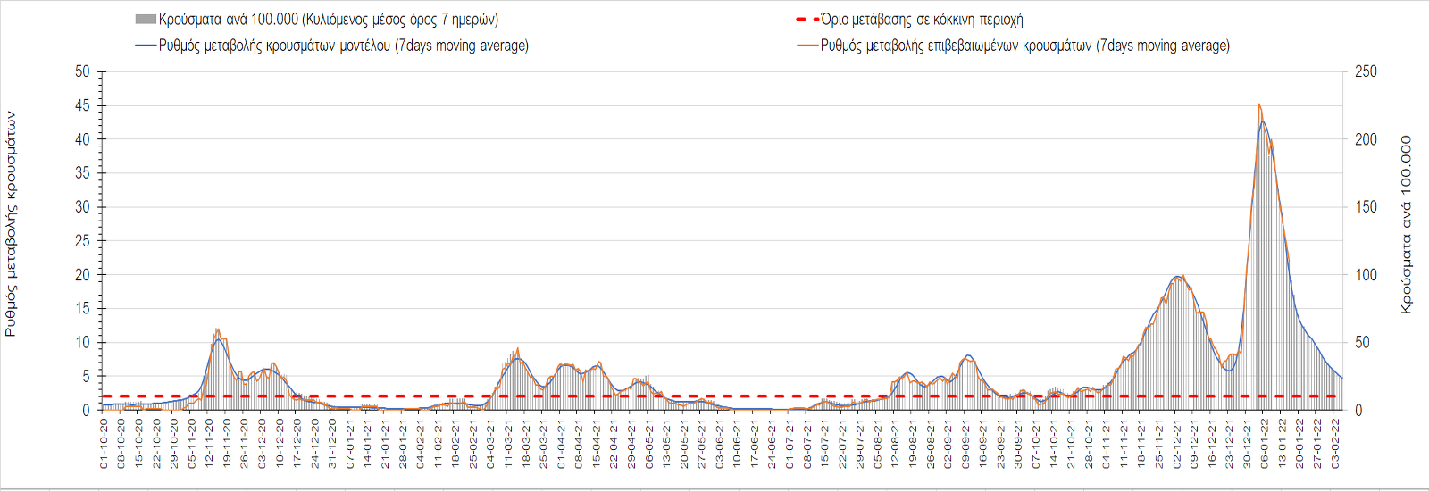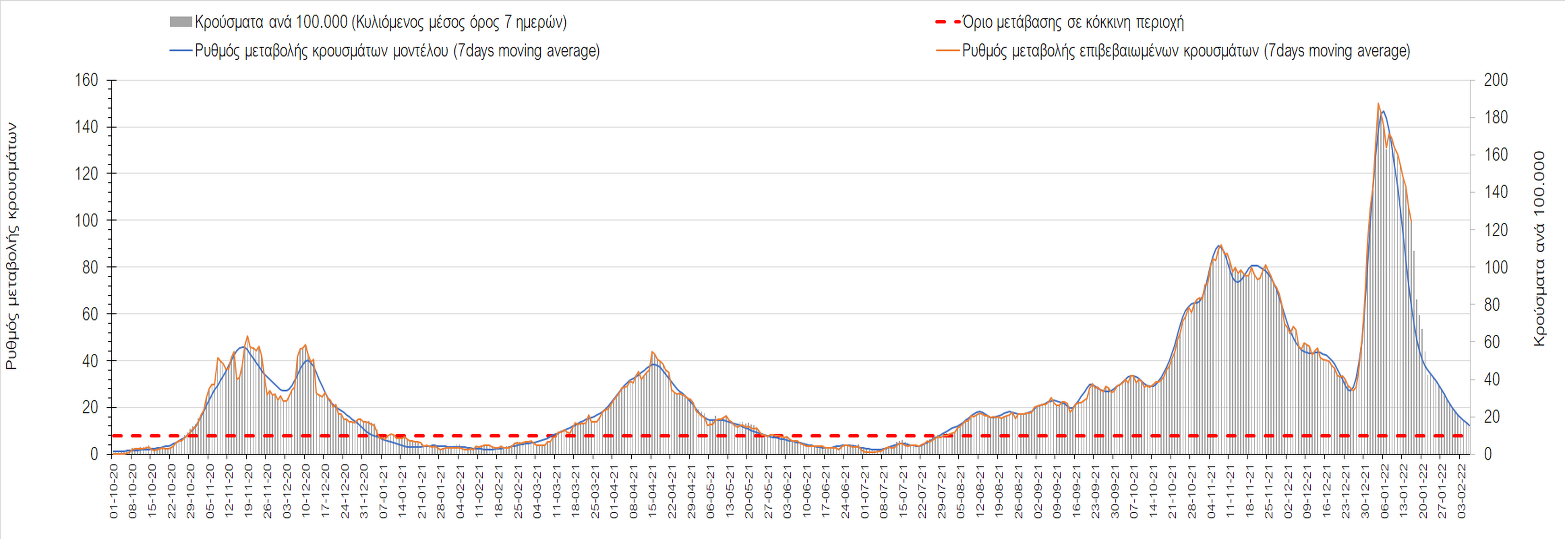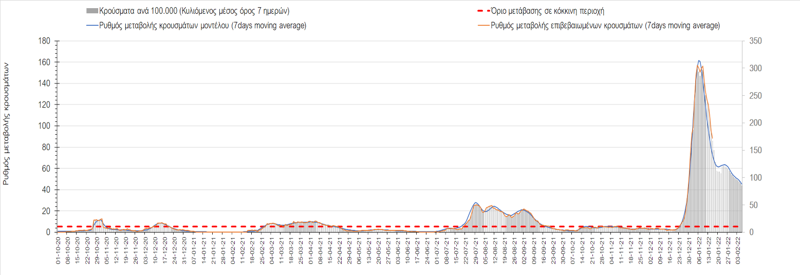 Η ανοδική τάση που είχε διαμορφωθεί από τις 23/12 και που οφείλεται στην μετάλλαξη Ο, έχει περιέλθει σε πτωτική, και αντικατοπτρίζεται στον ημερήσιο αριθμό των κρουσμάτων (κυλιόμενος μέσος όρος 7 ημερών), ο οποίος βρίσκεται κάτω από τις 22.000 (21.874). Αυτή αποτυπώνεται πλέον σε όλες σχεδόν τις περιοχές, πράγμα που σημαίνει ότι τα μέτρα που εφαρμοστήκαν στις 24 και 29/12 συντέλεσαν στον περιορισμό του ρυθμού ανόδου, ενώ, πέρα από την εφαρμογή των μέτρων, και από το ποσοστό εμβολιασμού (και μάλιστα με 3η δόση), έχει αυξηθεί πιο σημαντικά από το αναμενόμενο το ποσοστό φυσικής ανοσίας, λόγω του μεγάλου αριθμού ασυμπτωματικών που νόσησαν από το στέλεχος Ο. Πέρα από την εφαρμογή των μέτρων (σε συνδυασμό με την σημαντική συνειδητοποίηση εκ μέρους του πληθυσμού ότι χρειάζεται προσοχή και σύνεση για την αντιμετώπιση της διασποράς της παραλλαγής Ο), η συστηματική αποκλιμάκωση της πανδημίας (της οποίας η έναρξη όπως ήδη βλέπουμε να τοποθετείται σε διαφορετικό χρονικό σημείο ανά περιοχή) θα οφείλεται στο συνδυασμό των επιπέδων ανοσίας του πληθυσμού (επίκτητη και φυσική), αλλά και στον πολύ μεγάλο αριθμό των τεστ συνολικά (μοριακά, rapid και self-test) που πραγματοποιούνται καθημερινά, των οποίων ο αριθμός έχει φθάσει σε ημερήσια βάση τις 700.000.