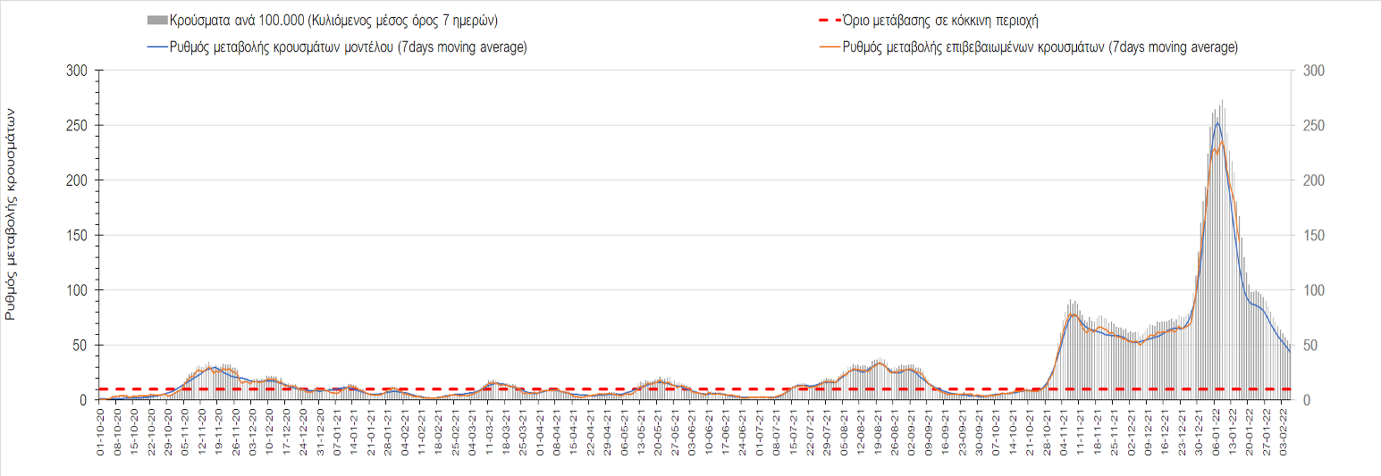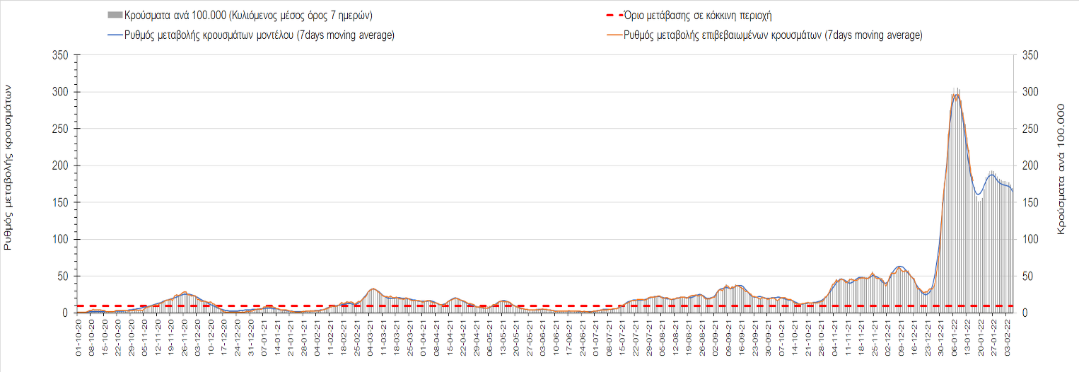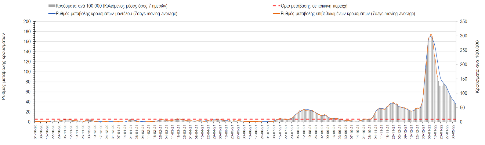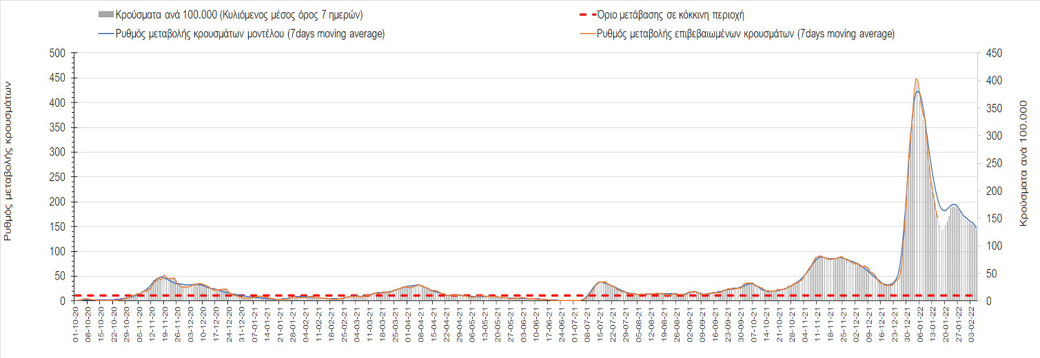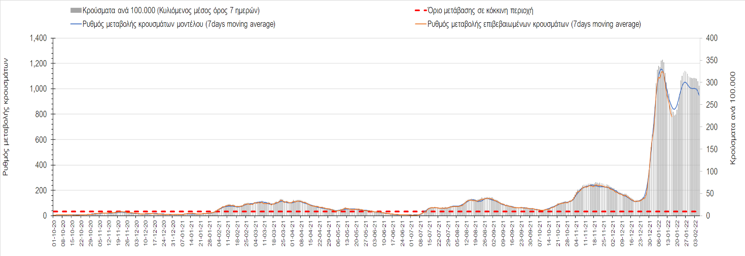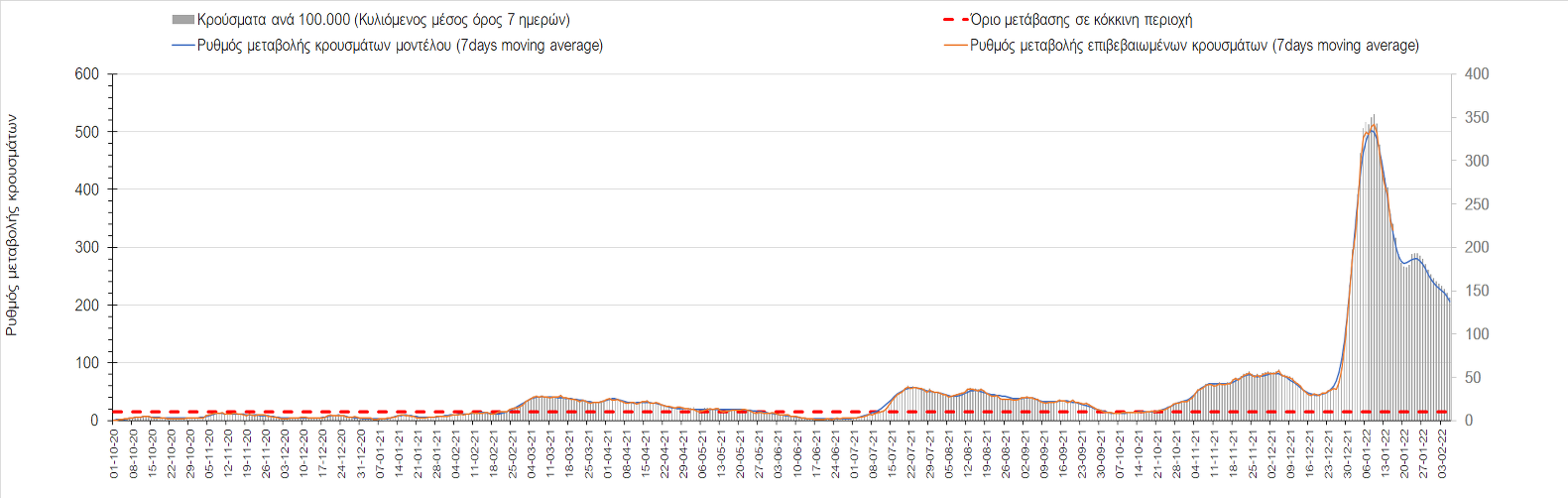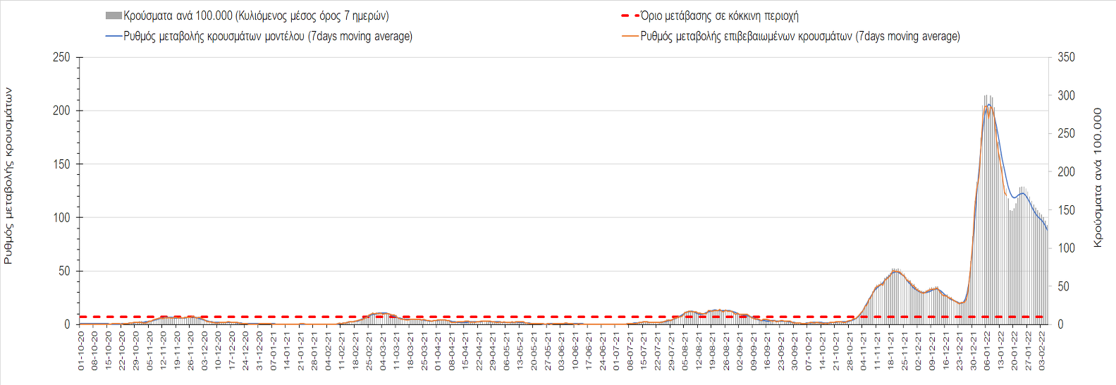 Η ανοδική τάση που είχε διαμορφωθεί από τις 23/12 και που οφείλεται στην μετάλλαξη Ο, έχει περιέλθει σε πτωτική, και αντικατοπτρίζεται στον ημερήσιο αριθμό των κρουσμάτων (κυλιόμενος μέσος όρος 7 ημερών), ο οποίος βρίσκεται κάτω από τις 22.000 (21.874). Αυτή αποτυπώνεται πλέον σε όλες σχεδόν τις περιοχές, πράγμα που σημαίνει ότι τα μέτρα που εφαρμοστήκαν στις 24 και 29/12 συντέλεσαν στον περιορισμό του ρυθμού ανόδου, ενώ, πέρα από την εφαρμογή των μέτρων, και από το ποσοστό εμβολιασμού (και μάλιστα με 3η δόση), έχει αυξηθεί πιο σημαντικά από το αναμενόμενο το ποσοστό φυσικής ανοσίας, λόγω του μεγάλου αριθμού ασυμπτωματικών που νόσησαν από το στέλεχος Ο. Πέρα από την εφαρμογή των μέτρων (σε συνδυασμό με την σημαντική συνειδητοποίηση εκ μέρους του πληθυσμού ότι χρειάζεται προσοχή και σύνεση για την αντιμετώπιση της διασποράς της παραλλαγής Ο), η συστηματική αποκλιμάκωση της πανδημίας (της οποίας η έναρξη όπως ήδη βλέπουμε να τοποθετείται σε διαφορετικό χρονικό σημείο ανά περιοχή) θα οφείλεται στο συνδυασμό των επιπέδων ανοσίας του πληθυσμού (επίκτητη και φυσική), αλλά και στον πολύ μεγάλο αριθμό των τεστ συνολικά (μοριακά, rapid και self-test) που πραγματοποιούνται καθημερινά, των οποίων ο αριθμός έχει φθάσει σε ημερήσια βάση τις 700.000.