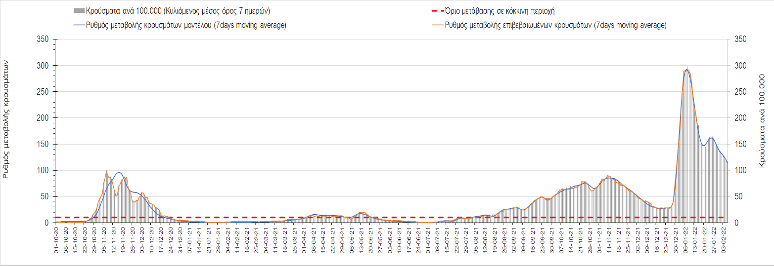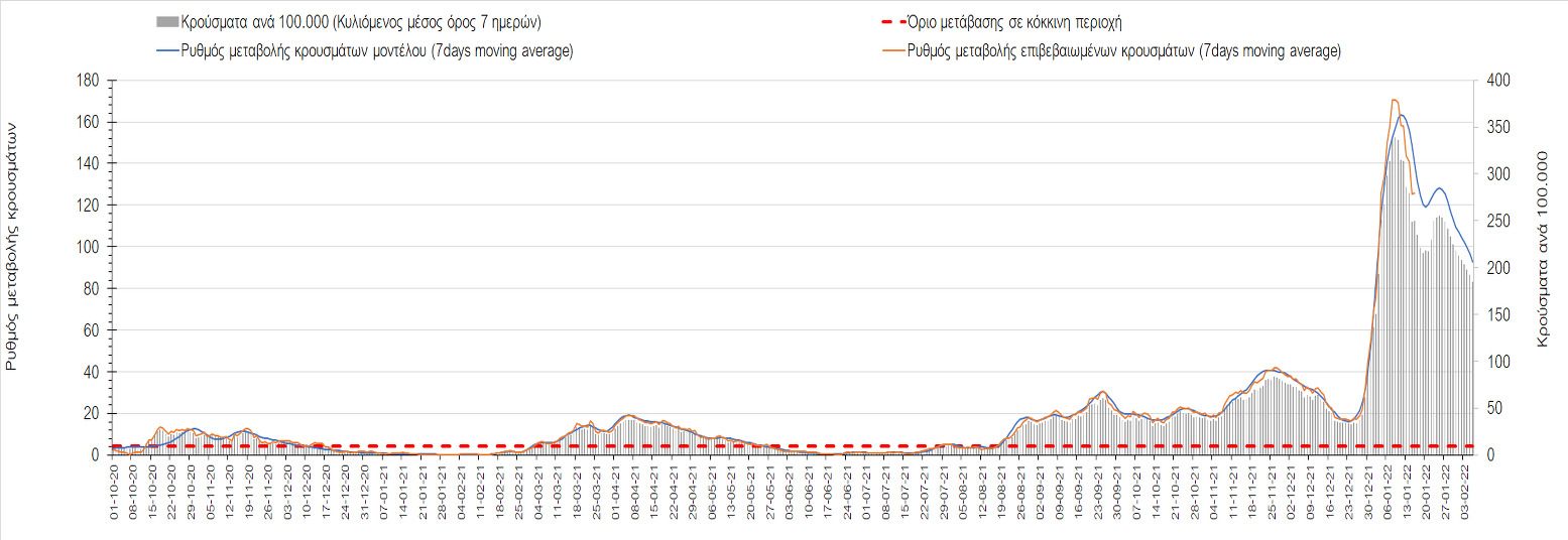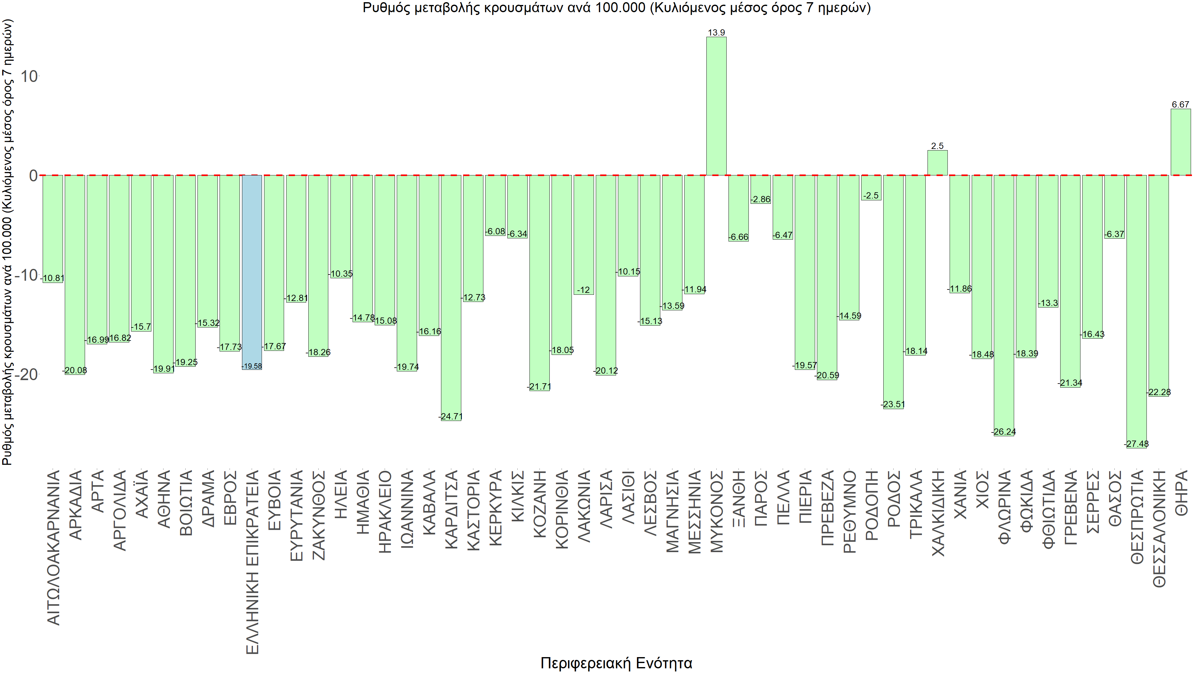 Η αποτύπωση των τάσεων στις επιμέρους περιοχές, παρουσιάζεται στο Σχήμα 61, όπου παρουσιάζεται ο ρυθμός μεταβολής των νέων κρουσμάτων ανά 100.000 κατοίκους (κυλιόμενος μέσος όρος 7 ημερών) των επιμέρους περιοχών. Θετικές τιμές του ρυθμού μεταβολής υποδηλώνουν άνοδο, ενώ αρνητικές τιμές υποδηλώνουν πτωτική πορεία. Το σχήμα αυτό είναι ιδιαίτερα κατατοπιστικό, γιατί οι τιμές που παρουσιάζονται είναι κανονικοποιημένες ως προς τον πληθυσμό, και η σύγκριση των τάσεων ανάμεσα στις επιμέρους περιοχές είναι άμεση.