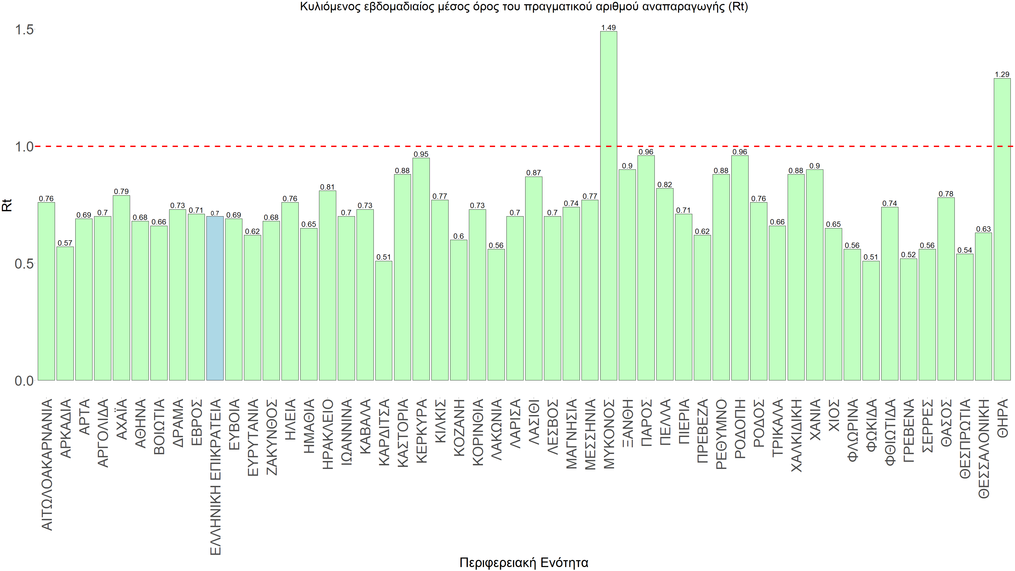 O πραγματικός αριθμός αναπαραγωγής Rt ανά περιφερειακή ενότητα της χώρας παρουσιάζεται στο Σχήμα 58.