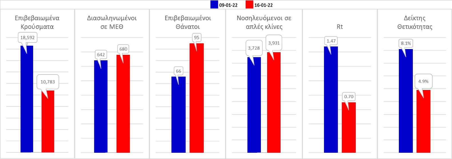 Σχήμα 59. Συγκριτικά αποτελέσματα της επιδημιολογικής εικόνας της σημερινής Κυριακής (16/01/2022) σε σχέση με τη προηγούμενη (09/01/2022)