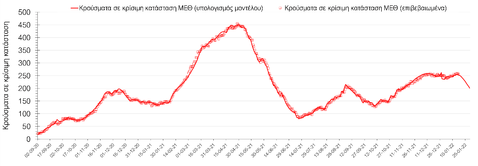 Συμπεράσματα: Με βάση τα αποτελέσματα, σε σχέση με προχθές, έχουμε μικρότερο αριθμό ασθενών σε κρίσιμη κατάσταση (διασωληνωμένοι σε ΜΕΘ), αλλά σημαντικά μεγαλύτερο αριθμό θανάτων από COVID-19. Σε πανελλαδικό επίπεδο ο κυλιόμενος εβδομαδιαίος μέσος όρος του δείκτη θετικότητας διαμορφώθηκε στο 7,8% (η ημερήσια τιμή είναι 4,9%) ενώ ο κυλιόμενος εβδομαδιαίος μέσος όρος του πραγματικού αριθμού αναπαραγωγής Rt (δηλαδή ο αριθμός των ατόμων που ένας φορέας μπορεί να επιμολύνει) μειώθηκε ελαφρά στο 0,70 (Rt κάτω από τη μονάδα υποδηλώνει καθαρή μείωση της διασποράς του ιού στην κοινότητα). Στις 23/12/21 ξεκίνησε και επίσημα το 5ο κύμα της πανδημίας στην Ελλάδα λόγω της ταχείας διασποράς του στελέχους Ο του SARS-CoV-2 η οποία εκτιμάται από τα σχετικά δεδομένα ότι πλέον έχει ξεπεράσει το 95% των νέων κρουσμάτων. Εντούτοις, την τελευταία εβδομάδα βρισκόμαστε σε σαφή φάση ύφεσης του 5ου κύματος της πανδημίας.