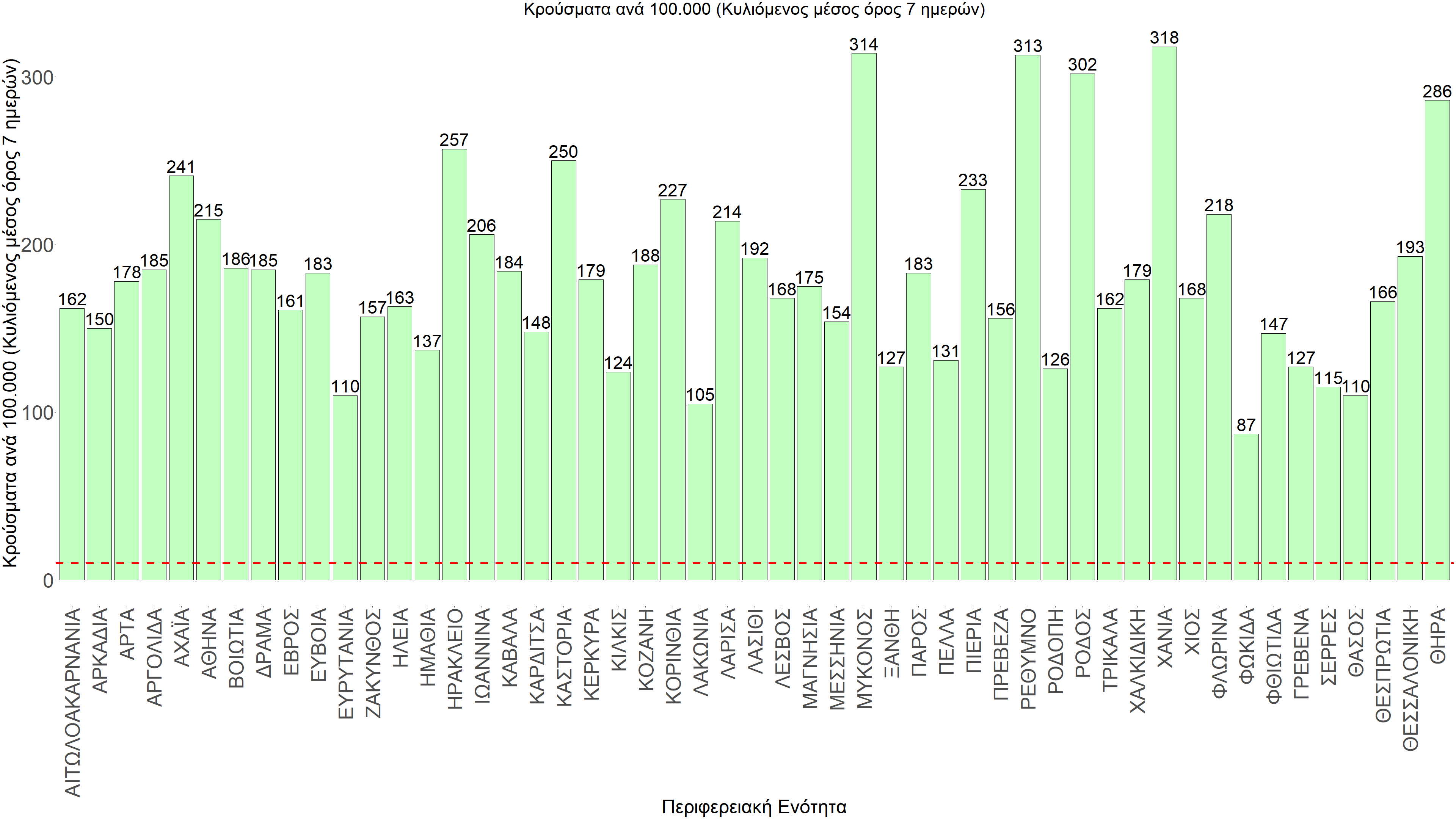 Σχήμα 60. Συγκεντρωτική εικόνα των νέων κρουσμάτων ανά 100.000 κατοίκους (κυλιόμενος μέσος όρος 7 ημερών) των επιμέρους περιοχών