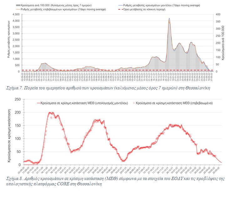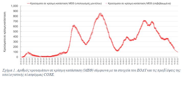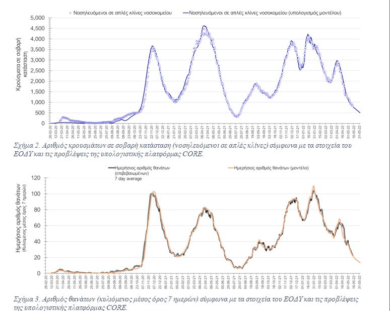 Η πορεία της μέσης εβδομαδιαίας τιμής των κρουσμάτων, καθώς και του κυλιόμενου μέσου όρου 7 ημερών του αριθμού των κρουσμάτων ανά 100.000 πληθυσμού, όπως έχουν καταγραφεί από τον ΕΟΔΥ και η αναμενόμενη πορεία τους, όπως προδιαγράφεται από την υπολογιστική πλατφόρμα CORE για την Ελληνική επικράτεια (όπως και στην Αττική και τη Θεσσαλονίκη) μέχρι τις 31 Μαΐου, αποτυπώνονται στο Σχήμα 4. Αυτή η προβλεπόμενη πορεία, που αφορά στα κρούσματα, τους νοσηλευόμενους σε απλές κλίνες, όσο και σε ΜΕΘ, καθώς επίσης και τους θανάτους, βασίζεται στις ακόλουθες παραδοχές: