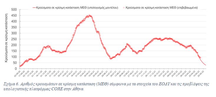 Όσον αφορά στους ασθενείς σε κρίσιμη κατάσταση (διασωληνωμένοι σε ΜΕΘ), ο αριθμός είναι μειωμένος σε σχέση με προχθές (173 από 178). Η καμπύλη εξέλιξης του αριθμού των ασθενών που νοσηλεύονται σε κλίνες ΜΕΘ με βάση τις προσομοιώσεις της πλατφόρμας CORE, παρουσιάζεται στο Σχήμα 1, των ασθενών που νοσηλεύονται σε απλές κλίνες στο Σχήμα 2, ενώ η εκτίμησή μας για την πορεία των θανάτων ανά ημέρα παρουσιάζεται στο Σχήμα 3.