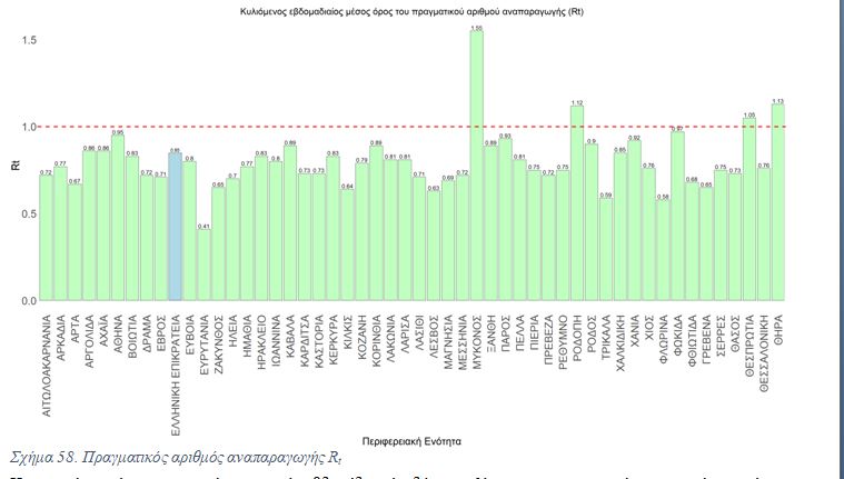 O πραγματικός αριθμός αναπαραγωγής Rt ανά περιφερειακή ενότητα της χώρας παρουσιάζεται στο Σχήμα 58.