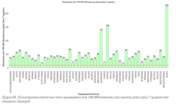 Η συγκεντρωτική εικόνα των νέων κρουσμάτων ανά 100.000 κατοίκους (κυλιόμενος μέσος όρος 7 ημερών) των επιμέρους περιοχών παρουσιάζεται στο Σχήμα 60. Όλες οι περιοχές παραμένουν πάνω από το όριο ανησυχίας, ενώ η προσωρινή ανοδική διακύμανση στη Ροδόπη, την έφερε πάνω από το όριο ξανά.