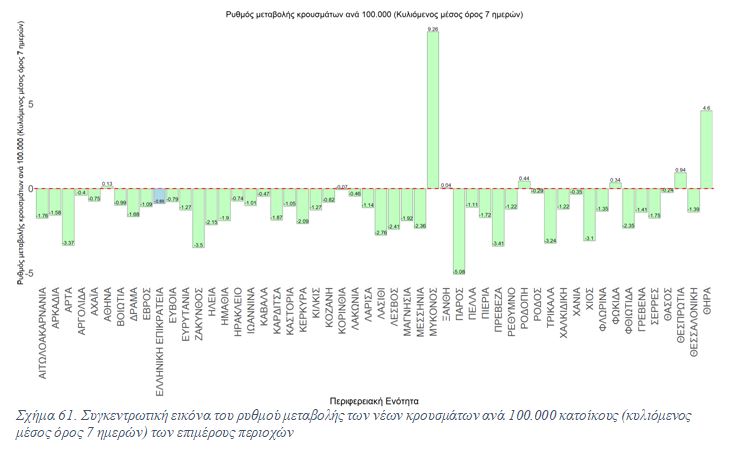 Η αποτύπωση των τάσεων στις επιμέρους περιοχές, παρουσιάζεται στο Σχήμα 61, όπου παρουσιάζεται ο ρυθμός μεταβολής των νέων κρουσμάτων ανά 100.000 κατοίκους (κυλιόμενος μέσος όρος 7 ημερών) των επιμέρους περιοχών. Θετικές τιμές του ρυθμού μεταβολής υποδηλώνουν άνοδο, ενώ αρνητικές τιμές υποδηλώνουν πτωτική πορεία.