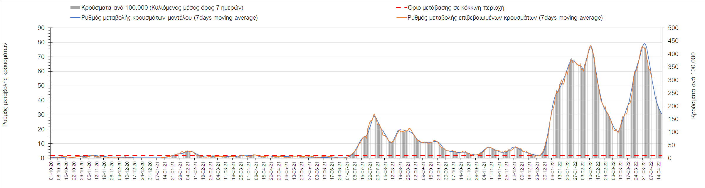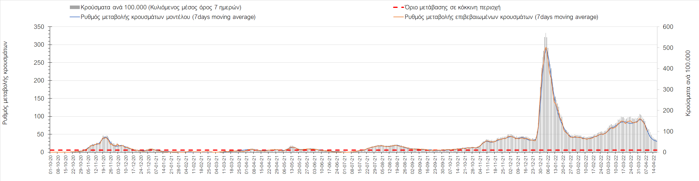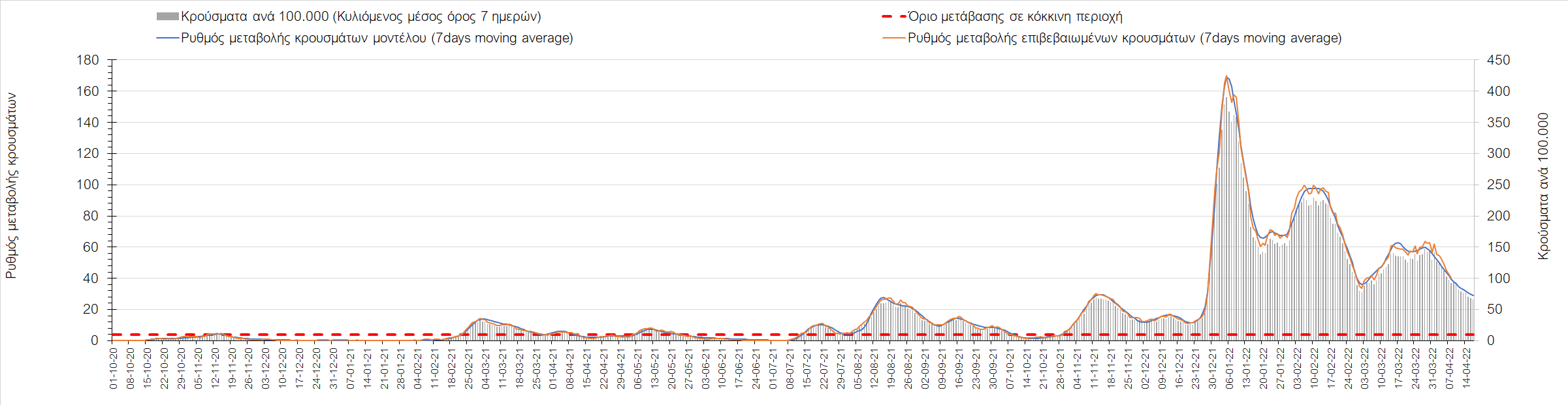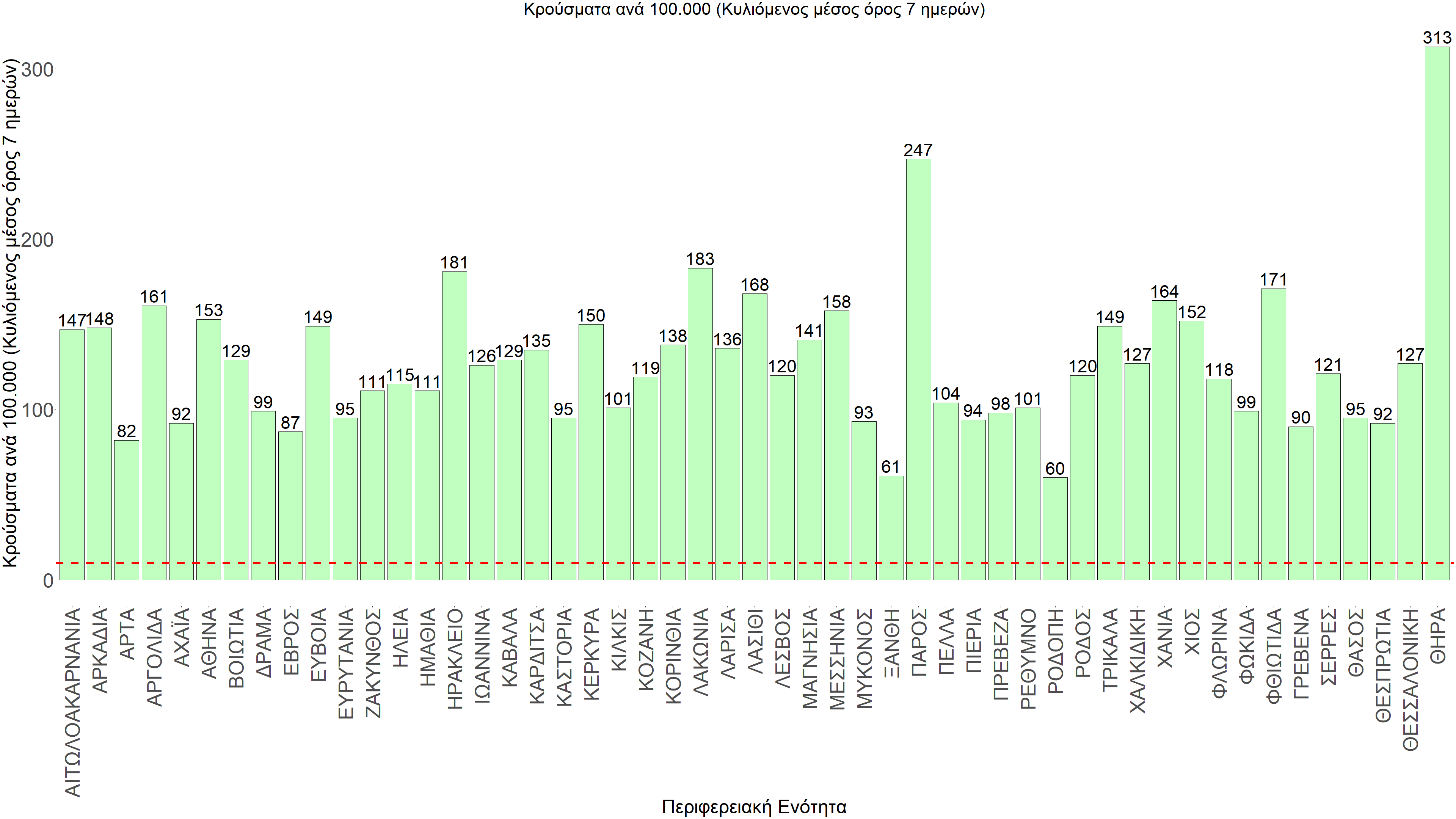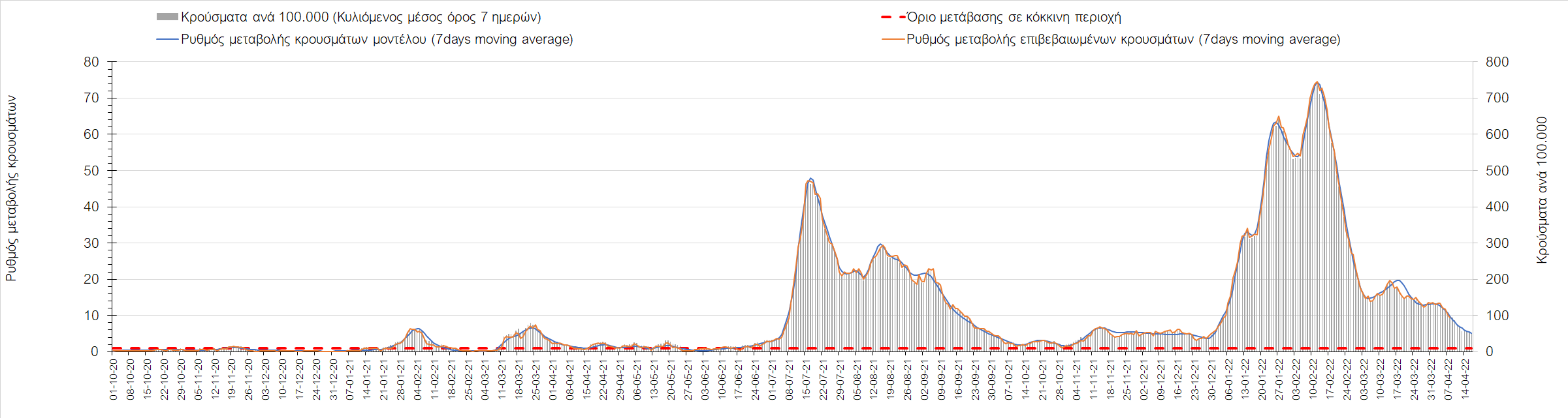Η αποτύπωση των τάσεων στις επιμέρους περιοχές, παρουσιάζεται στο Σχήμα 61, όπου παρουσιάζεται ο ρυθμός μεταβολής των νέων κρουσμάτων ανά 100.000 κατοίκους (κυλιόμενος μέσος όρος 7 ημερών) των επιμέρους περιοχών. Θετικές τιμές του ρυθμού μεταβολής υποδηλώνουν άνοδο, ενώ αρνητικές τιμές υποδηλώνουν πτωτική πορεία.