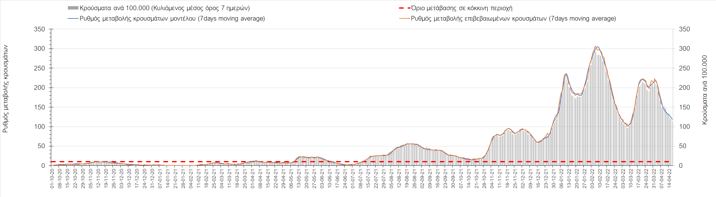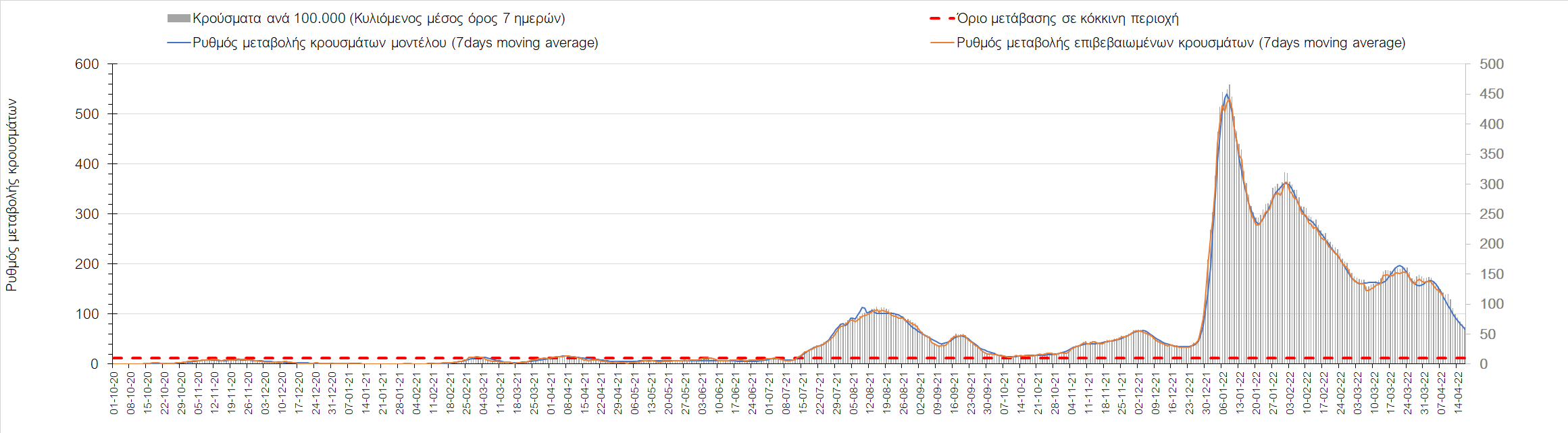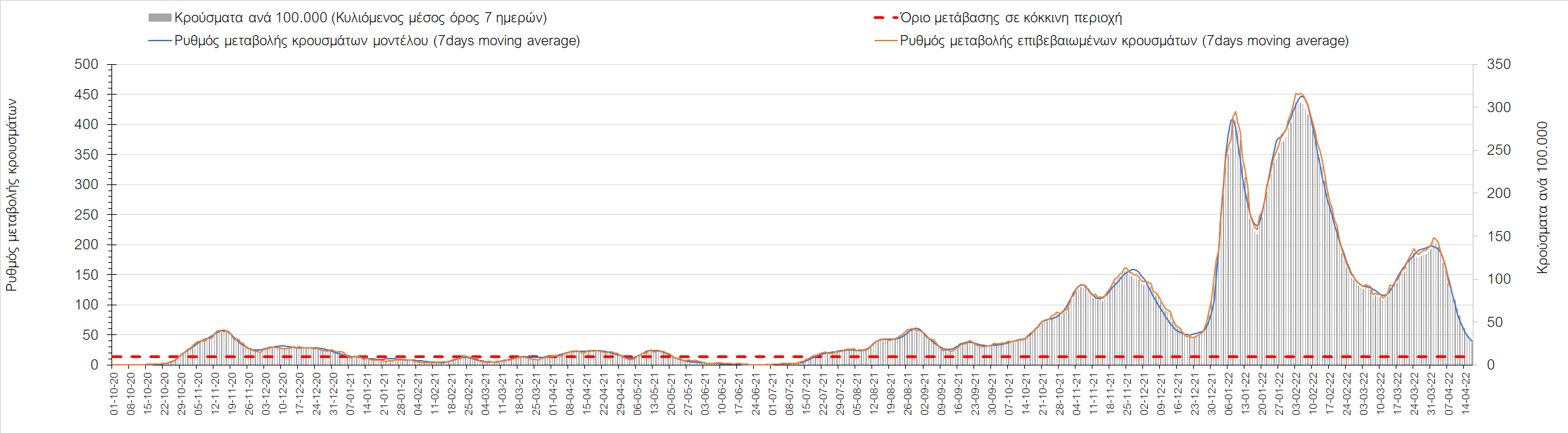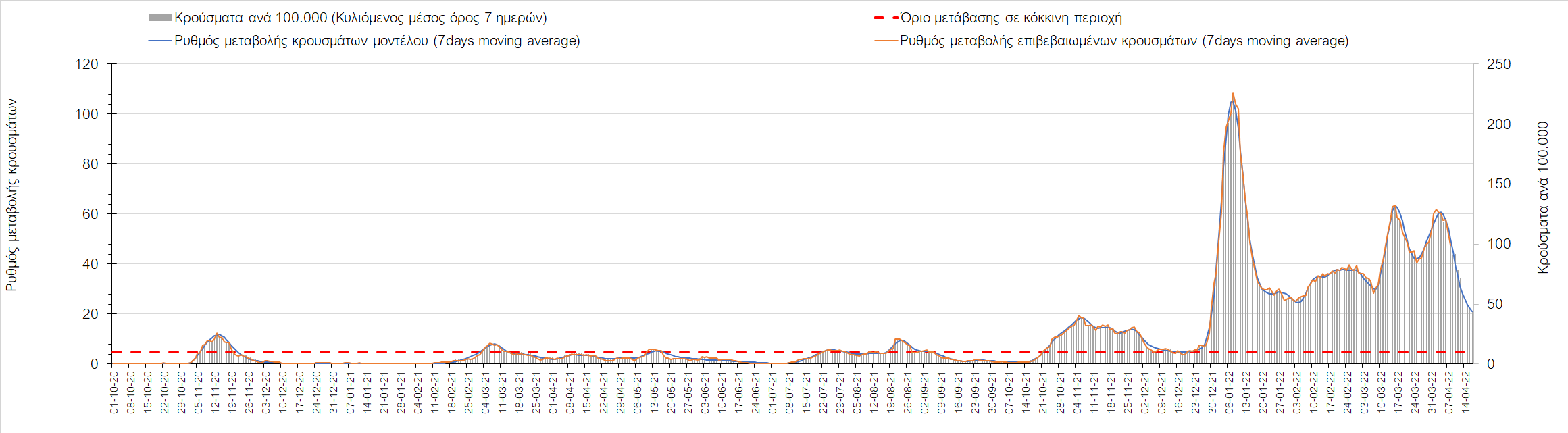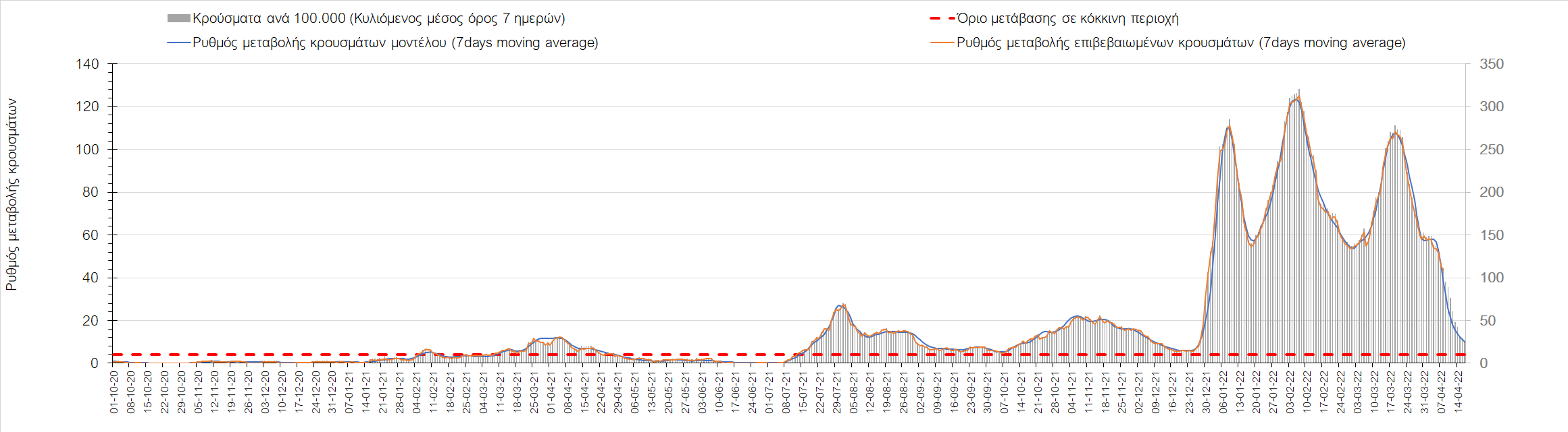 Η αποτύπωση των τάσεων στις επιμέρους περιοχές, παρουσιάζεται στο Σχήμα 61, όπου παρουσιάζεται ο ρυθμός μεταβολής των νέων κρουσμάτων ανά 100.000 κατοίκους (κυλιόμενος μέσος όρος 7 ημερών) των επιμέρους περιοχών. Θετικές τιμές του ρυθμού μεταβολής υποδηλώνουν άνοδο, ενώ αρνητικές τιμές υποδηλώνουν πτωτική πορεία.