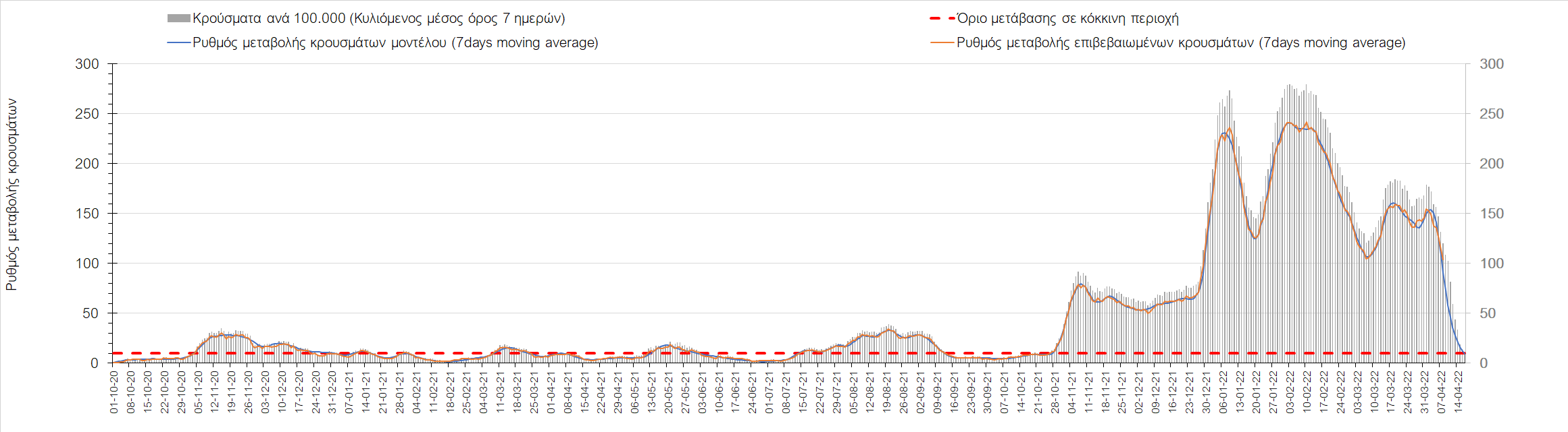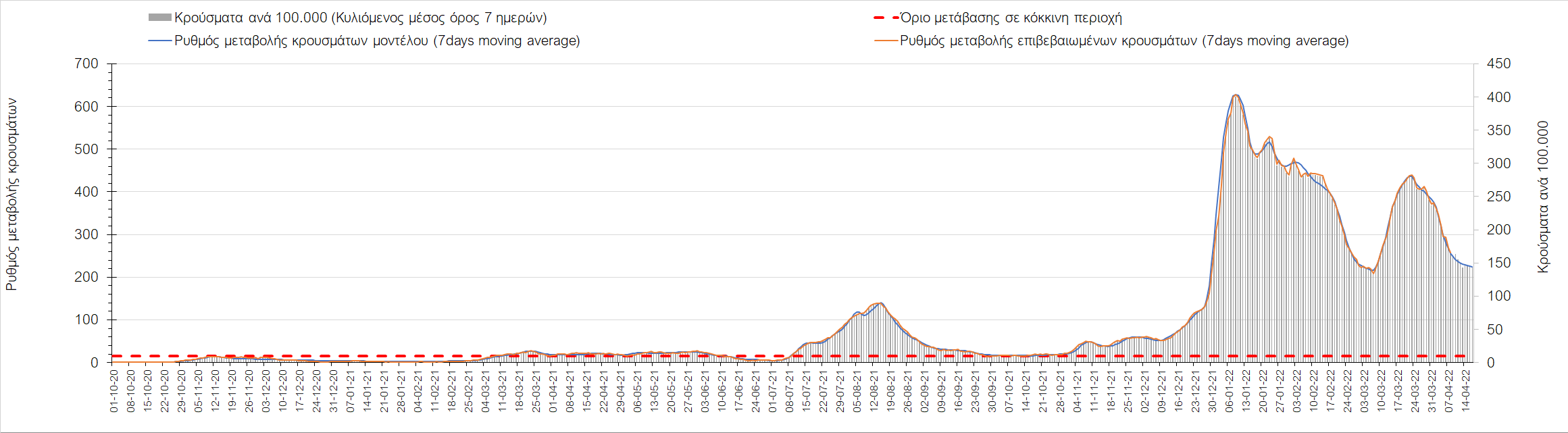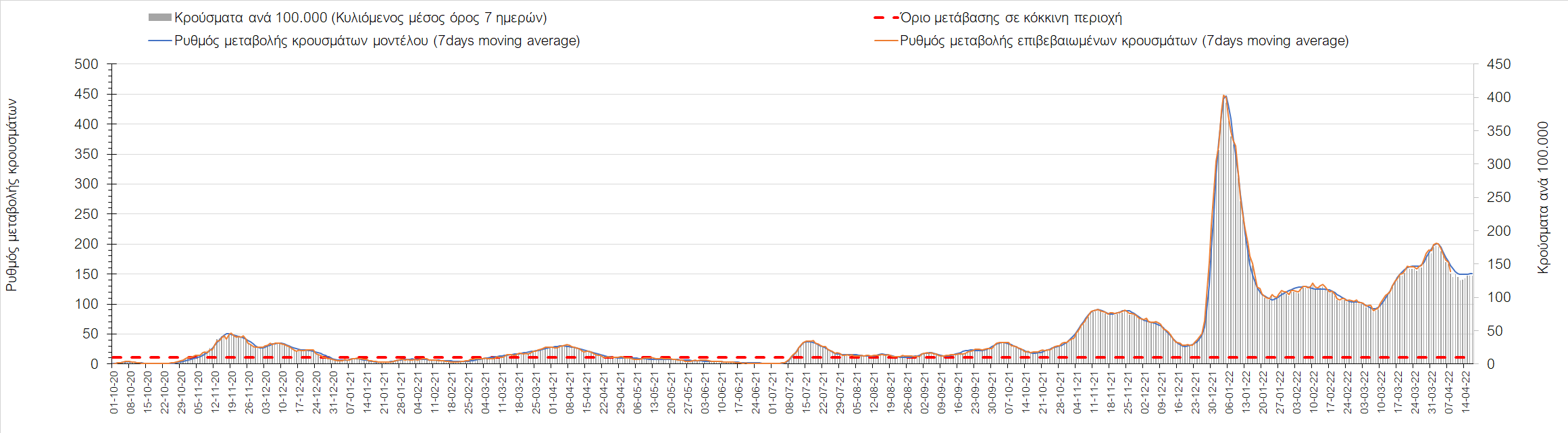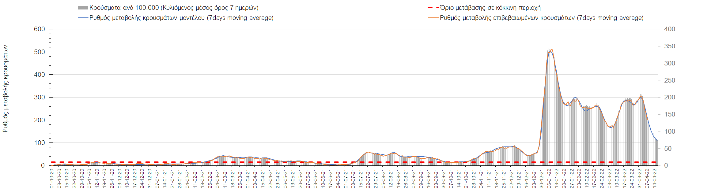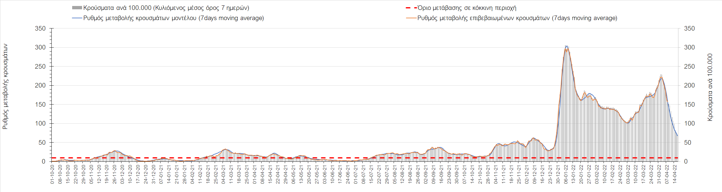 Η αποτύπωση των τάσεων στις επιμέρους περιοχές, παρουσιάζεται στο Σχήμα 61, όπου παρουσιάζεται ο ρυθμός μεταβολής των νέων κρουσμάτων ανά 100.000 κατοίκους (κυλιόμενος μέσος όρος 7 ημερών) των επιμέρους περιοχών. Θετικές τιμές του ρυθμού μεταβολής υποδηλώνουν άνοδο, ενώ αρνητικές τιμές υποδηλώνουν πτωτική πορεία.