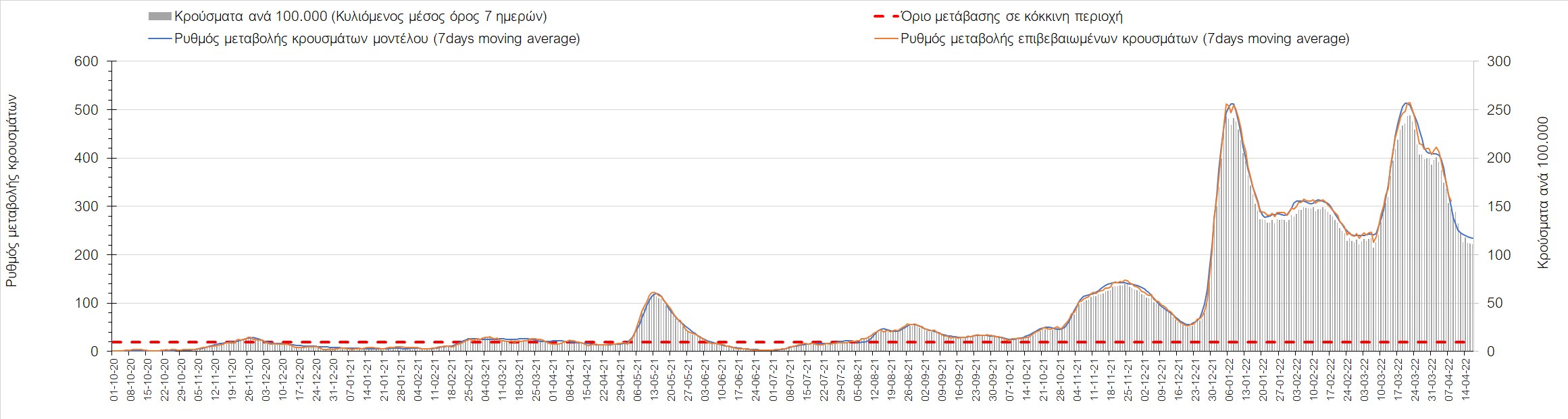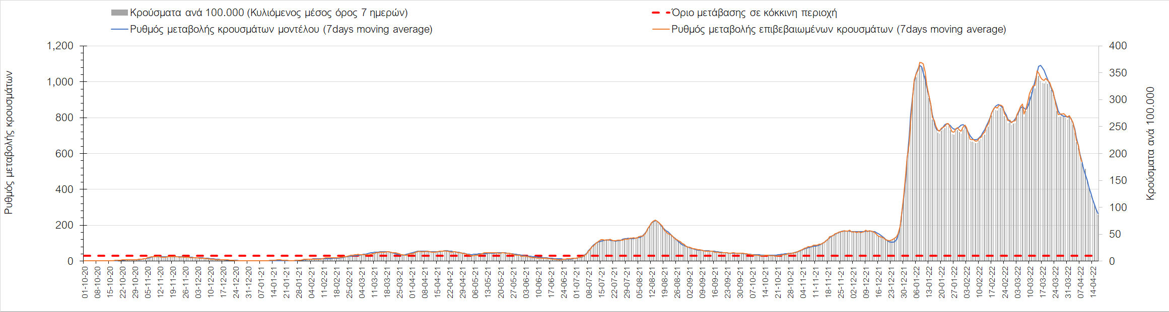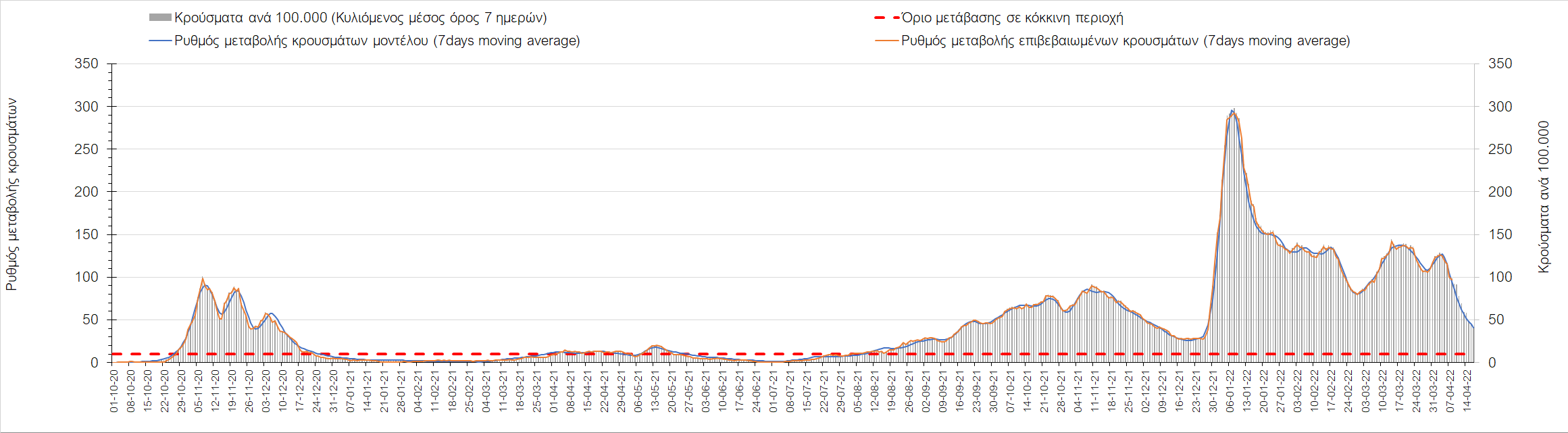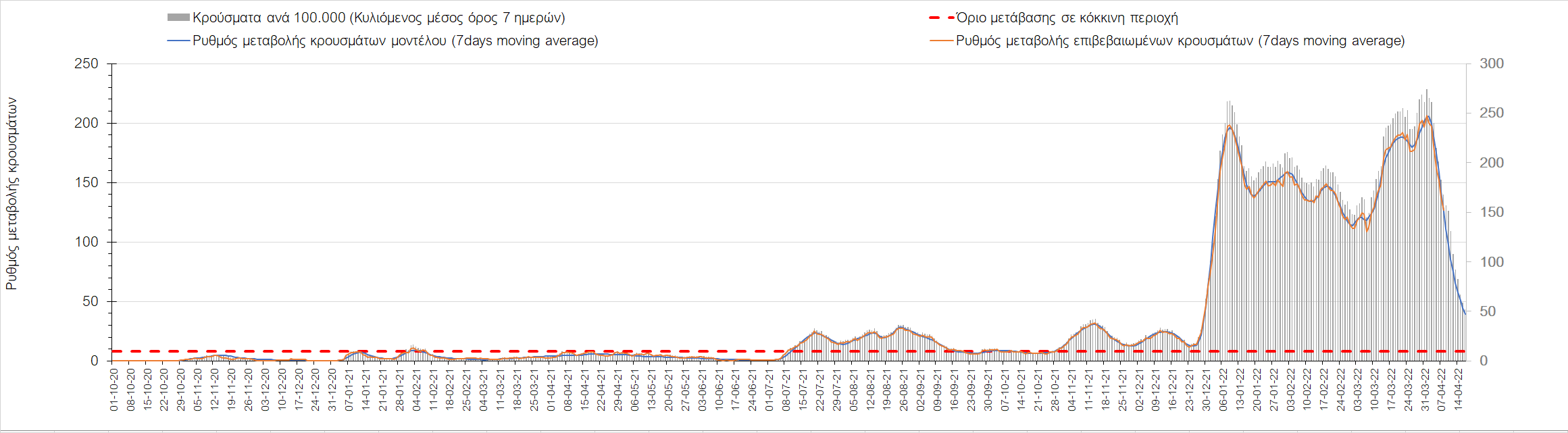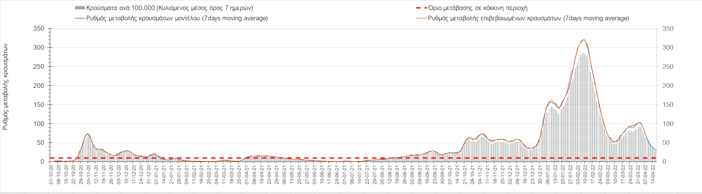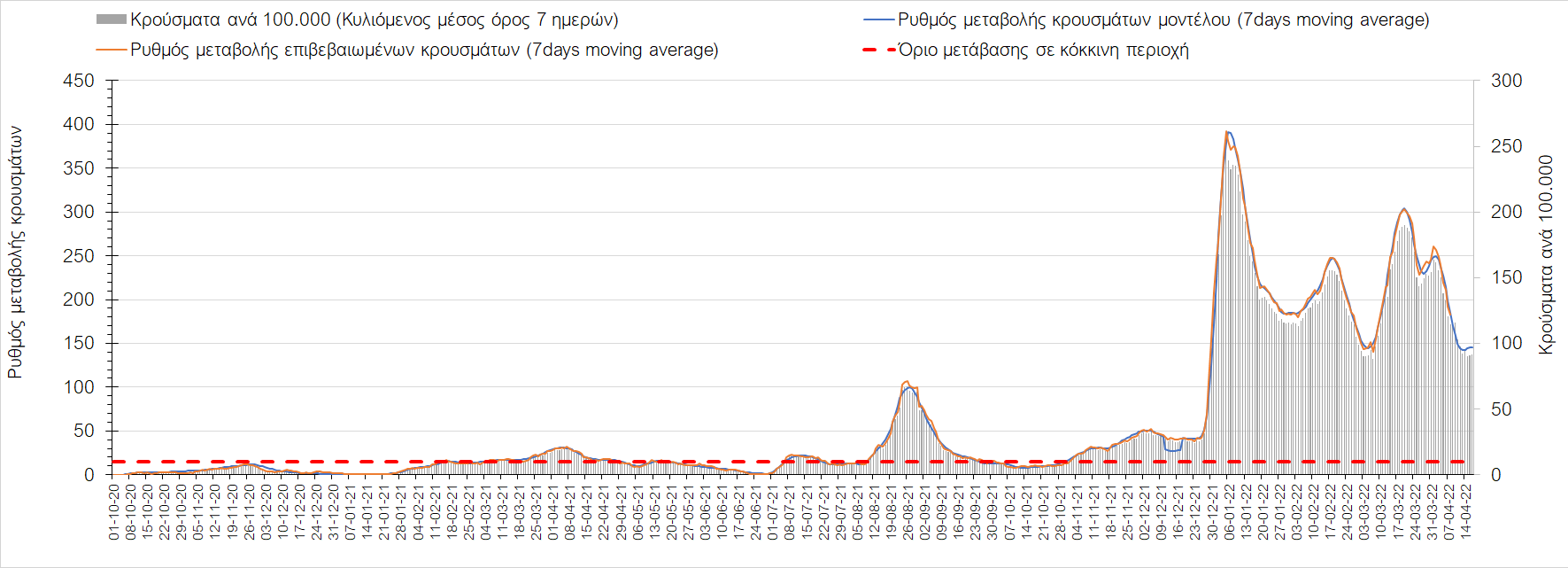 Η αποτύπωση των τάσεων στις επιμέρους περιοχές, παρουσιάζεται στο Σχήμα 61, όπου παρουσιάζεται ο ρυθμός μεταβολής των νέων κρουσμάτων ανά 100.000 κατοίκους (κυλιόμενος μέσος όρος 7 ημερών) των επιμέρους περιοχών. Θετικές τιμές του ρυθμού μεταβολής υποδηλώνουν άνοδο, ενώ αρνητικές τιμές υποδηλώνουν πτωτική πορεία.