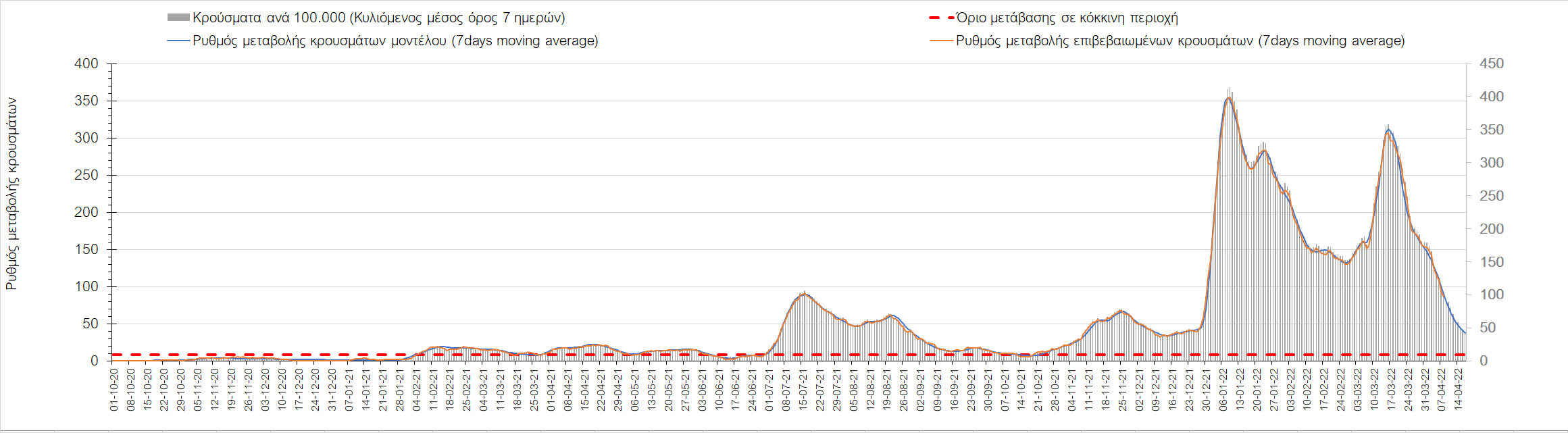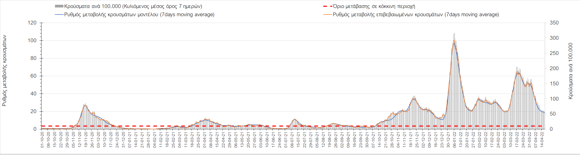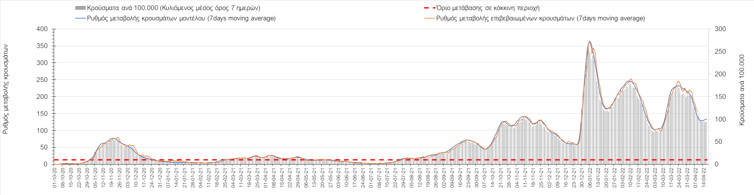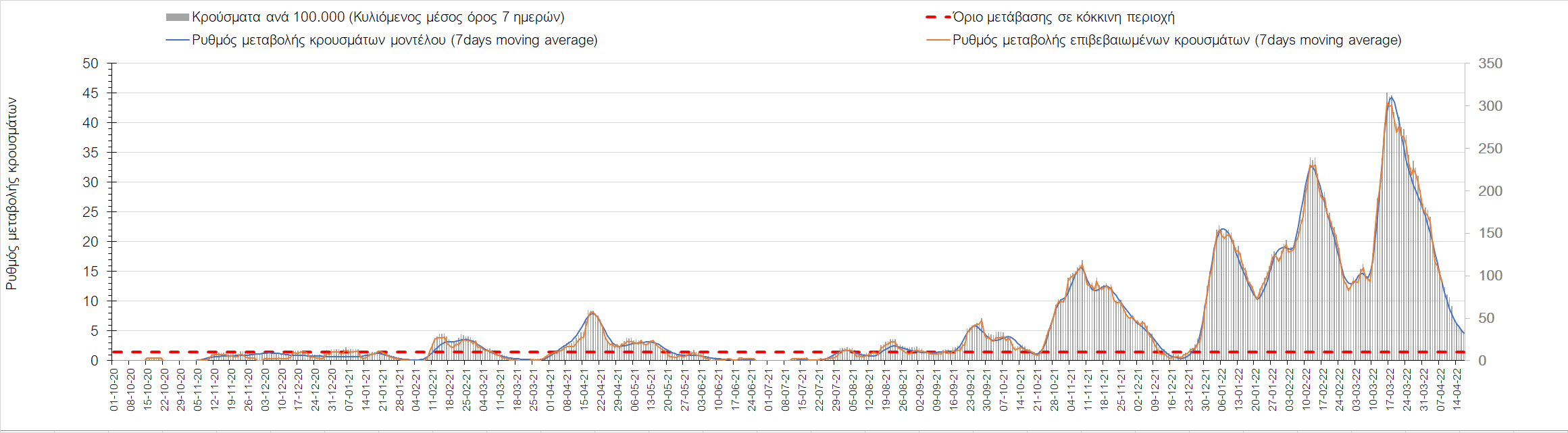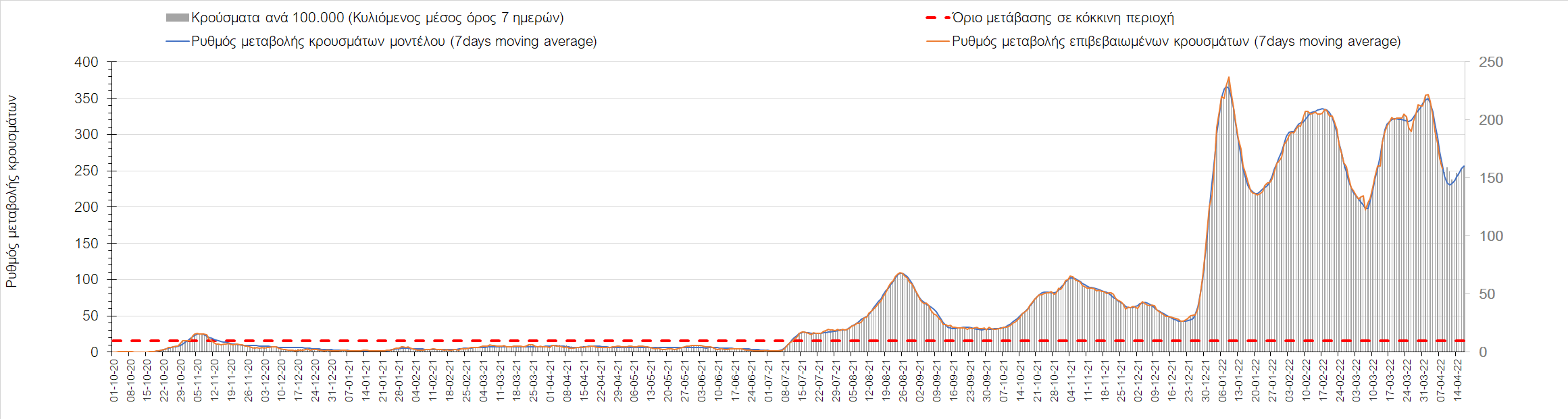 Η αποτύπωση των τάσεων στις επιμέρους περιοχές, παρουσιάζεται στο Σχήμα 61, όπου παρουσιάζεται ο ρυθμός μεταβολής των νέων κρουσμάτων ανά 100.000 κατοίκους (κυλιόμενος μέσος όρος 7 ημερών) των επιμέρους περιοχών. Θετικές τιμές του ρυθμού μεταβολής υποδηλώνουν άνοδο, ενώ αρνητικές τιμές υποδηλώνουν πτωτική πορεία.