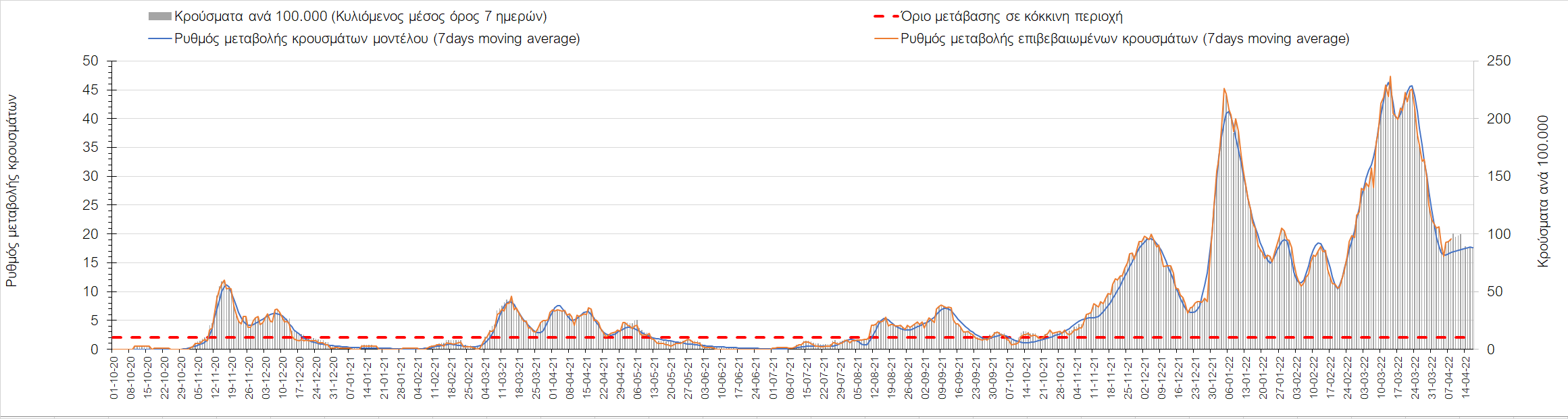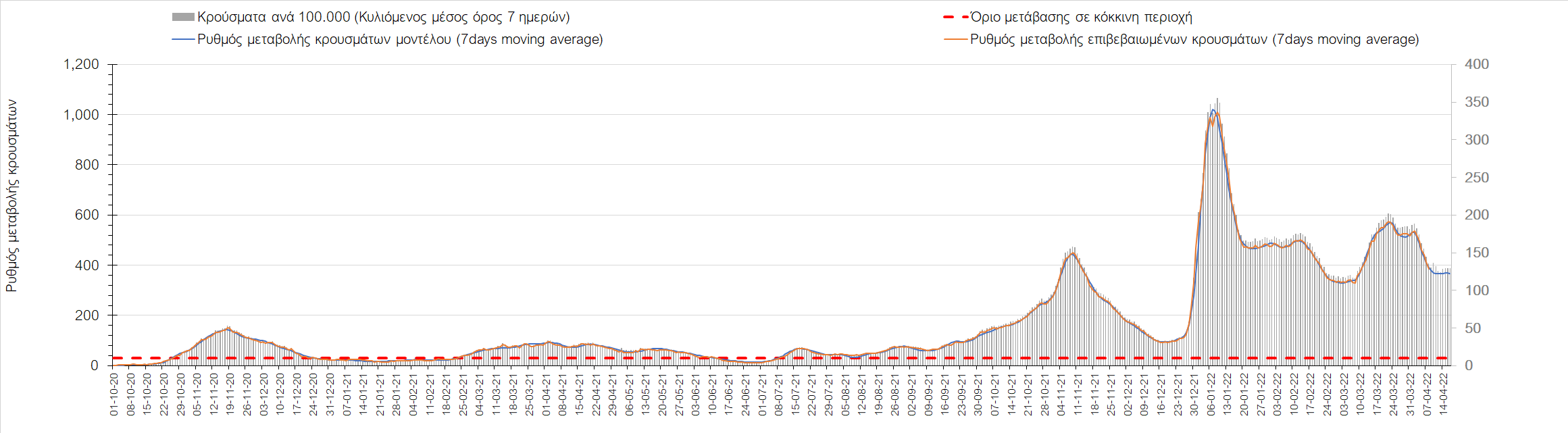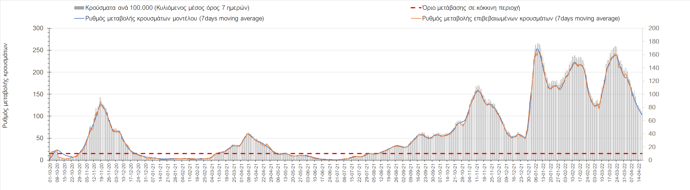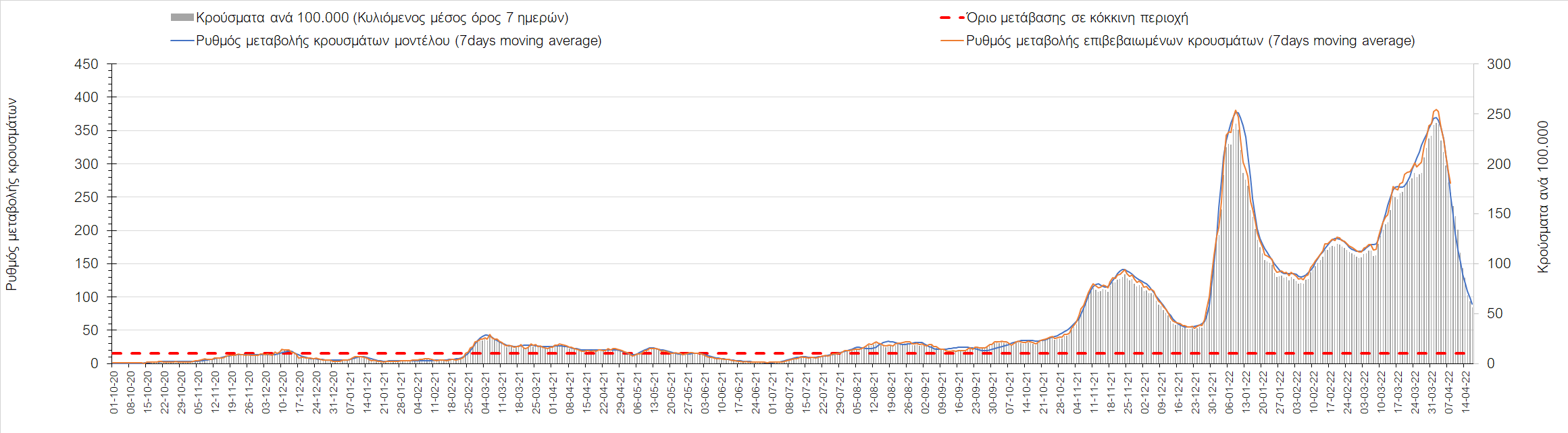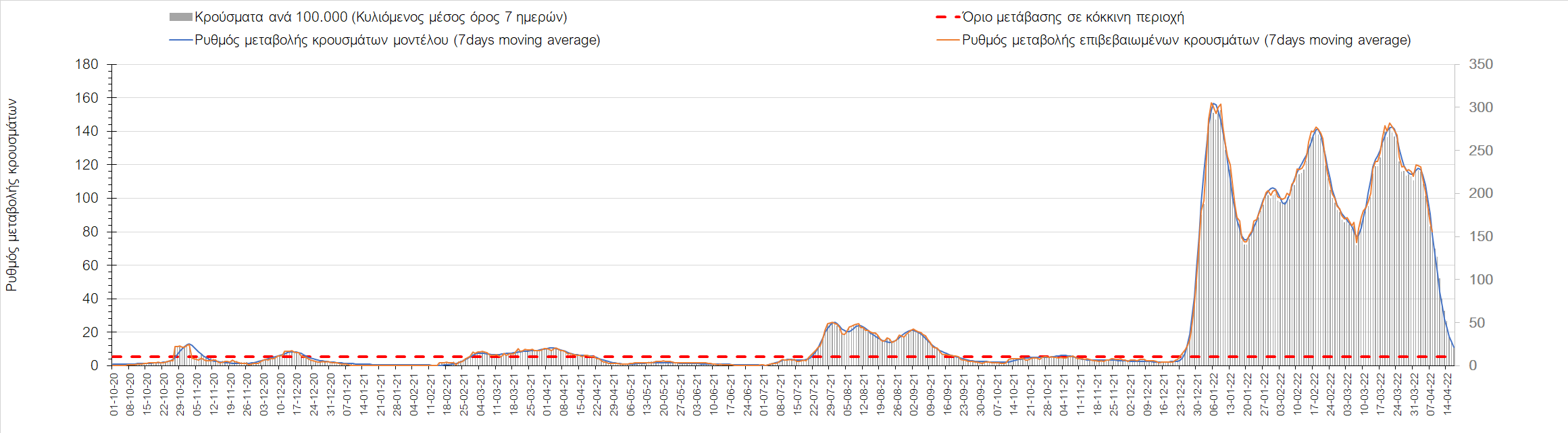 Η αποτύπωση των τάσεων στις επιμέρους περιοχές, παρουσιάζεται στο Σχήμα 61, όπου παρουσιάζεται ο ρυθμός μεταβολής των νέων κρουσμάτων ανά 100.000 κατοίκους (κυλιόμενος μέσος όρος 7 ημερών) των επιμέρους περιοχών. Θετικές τιμές του ρυθμού μεταβολής υποδηλώνουν άνοδο, ενώ αρνητικές τιμές υποδηλώνουν πτωτική πορεία.