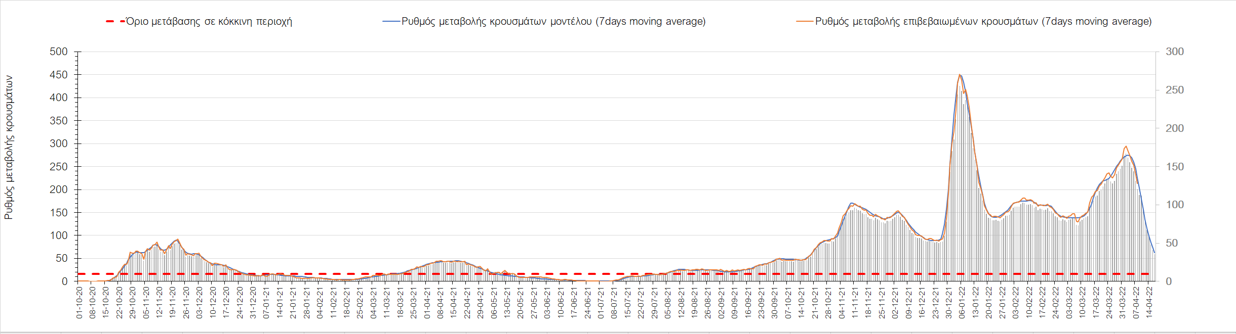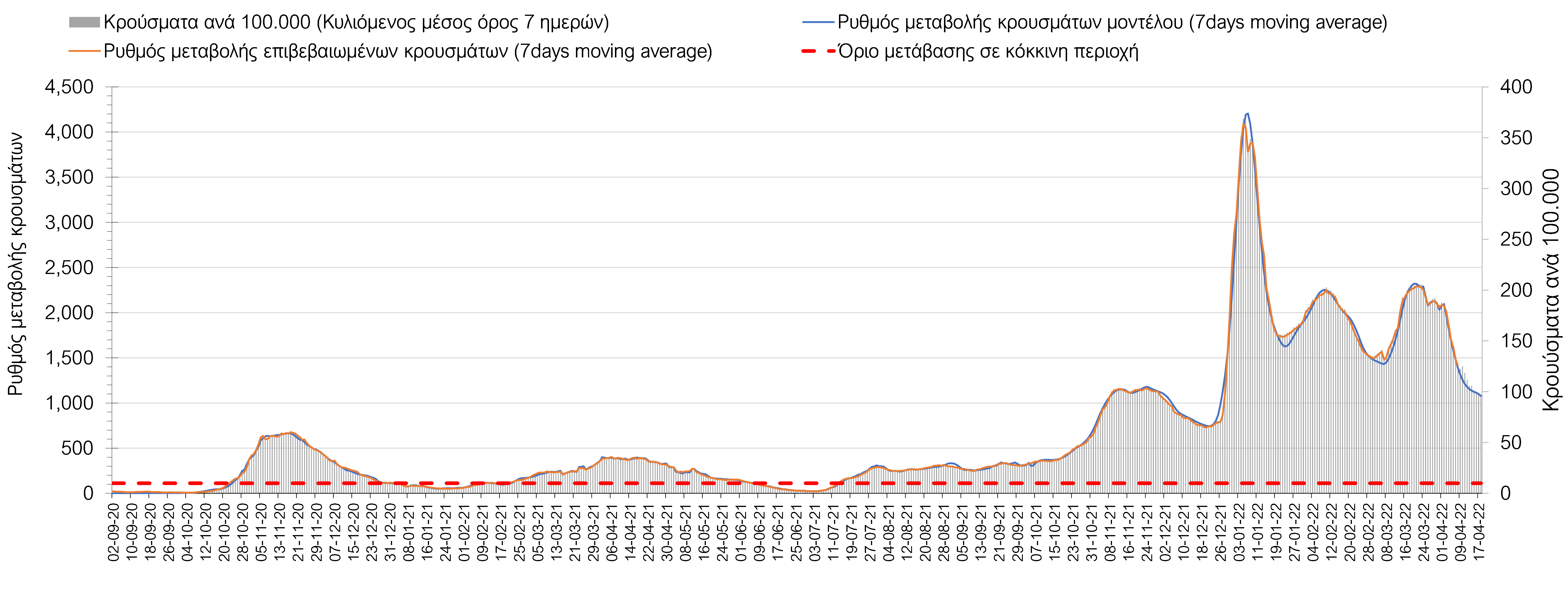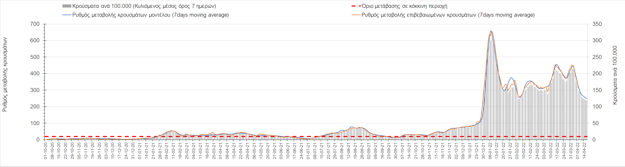 Σχήμα 4. Πορεία του ημερησίου αριθμού των κρουσμάτων (κυλιόμενος μέσος όρος 7 ημερών) στην Ελληνική επικράτεια.
