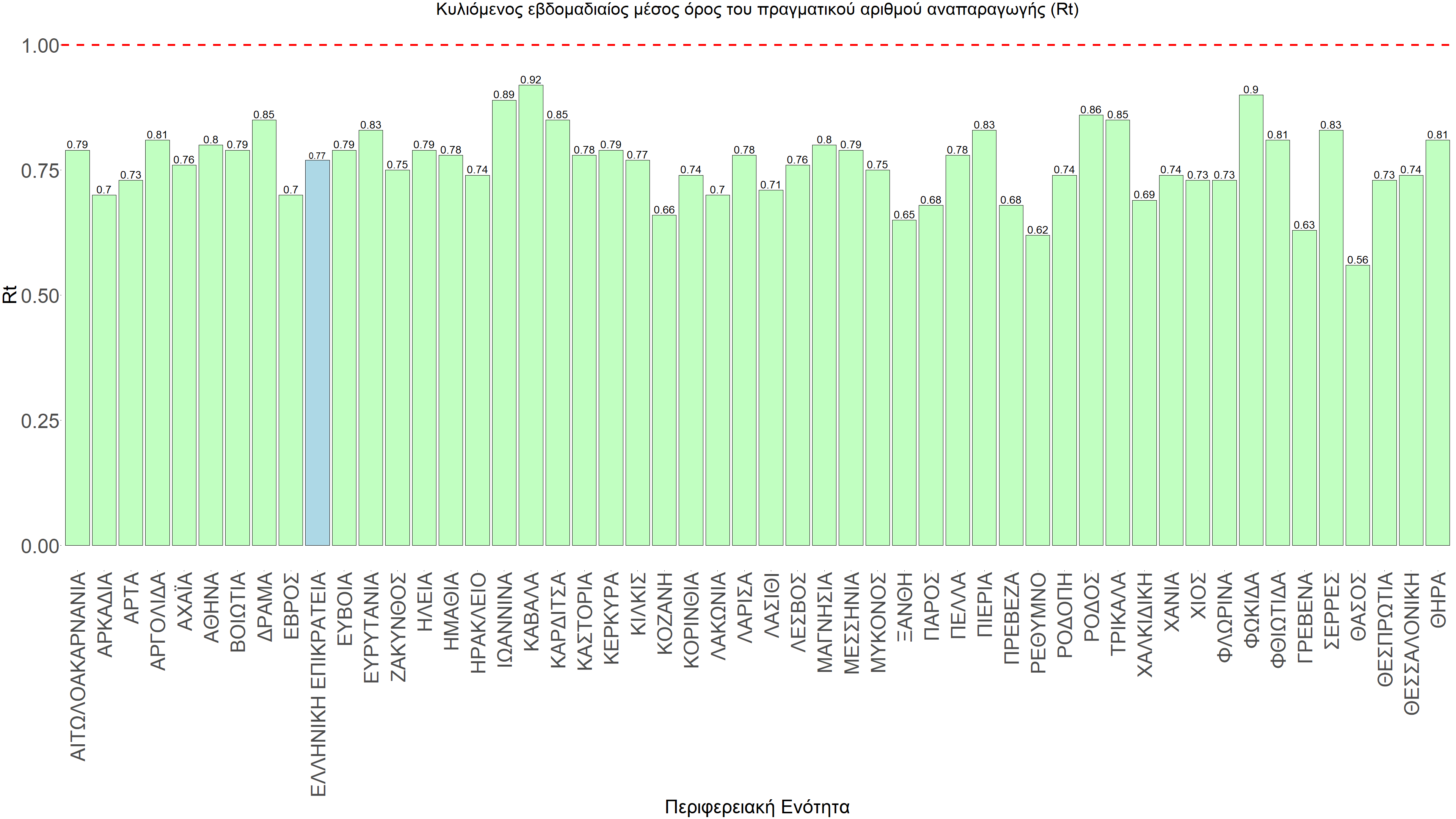 O πραγματικός αριθμός αναπαραγωγής Rt ανά περιφερειακή ενότητα της χώρας παρουσιάζεται στο Σχήμα 58.