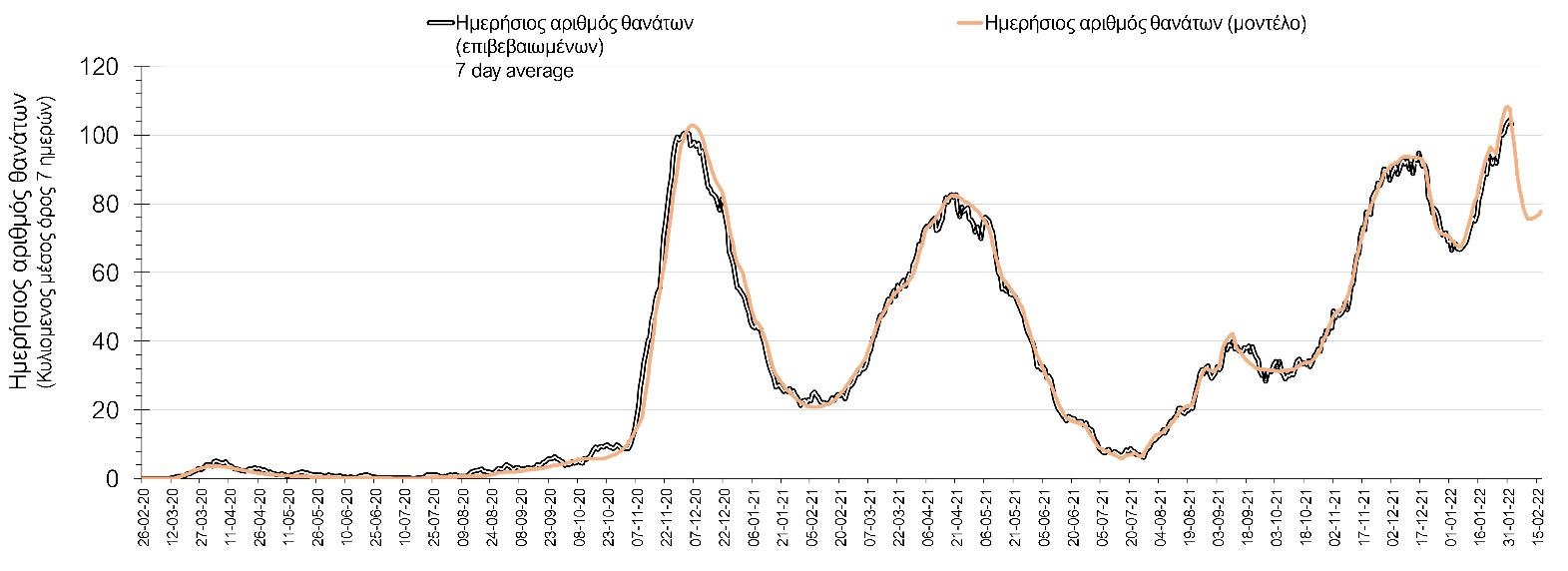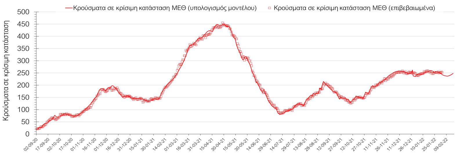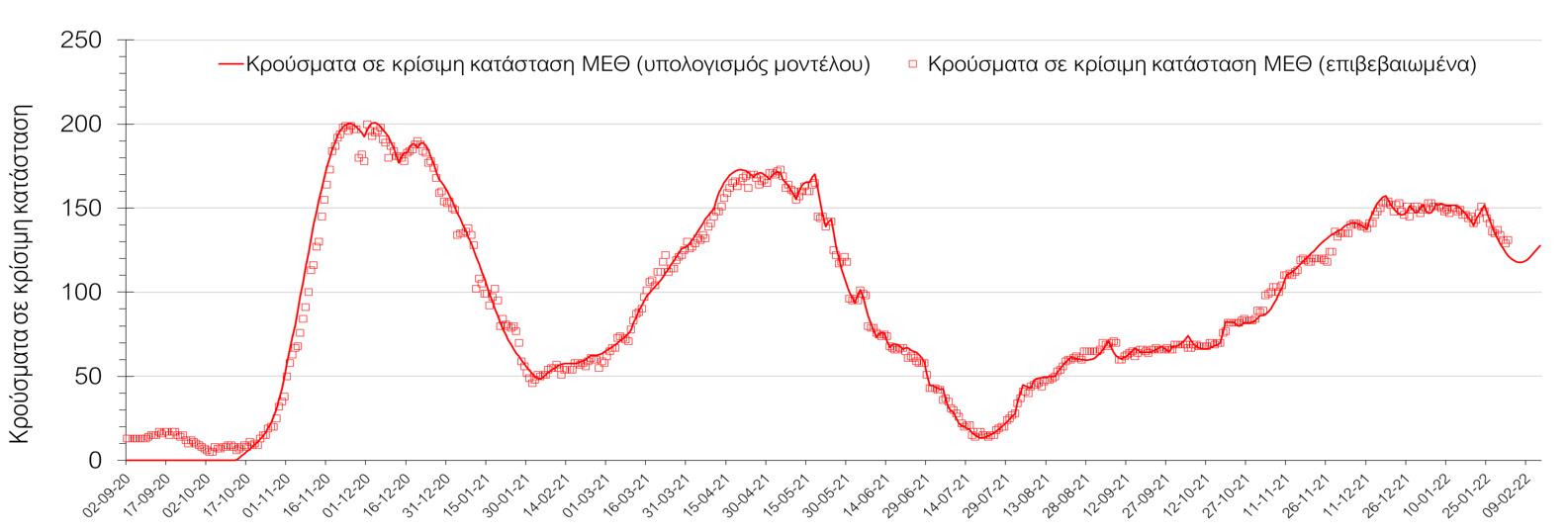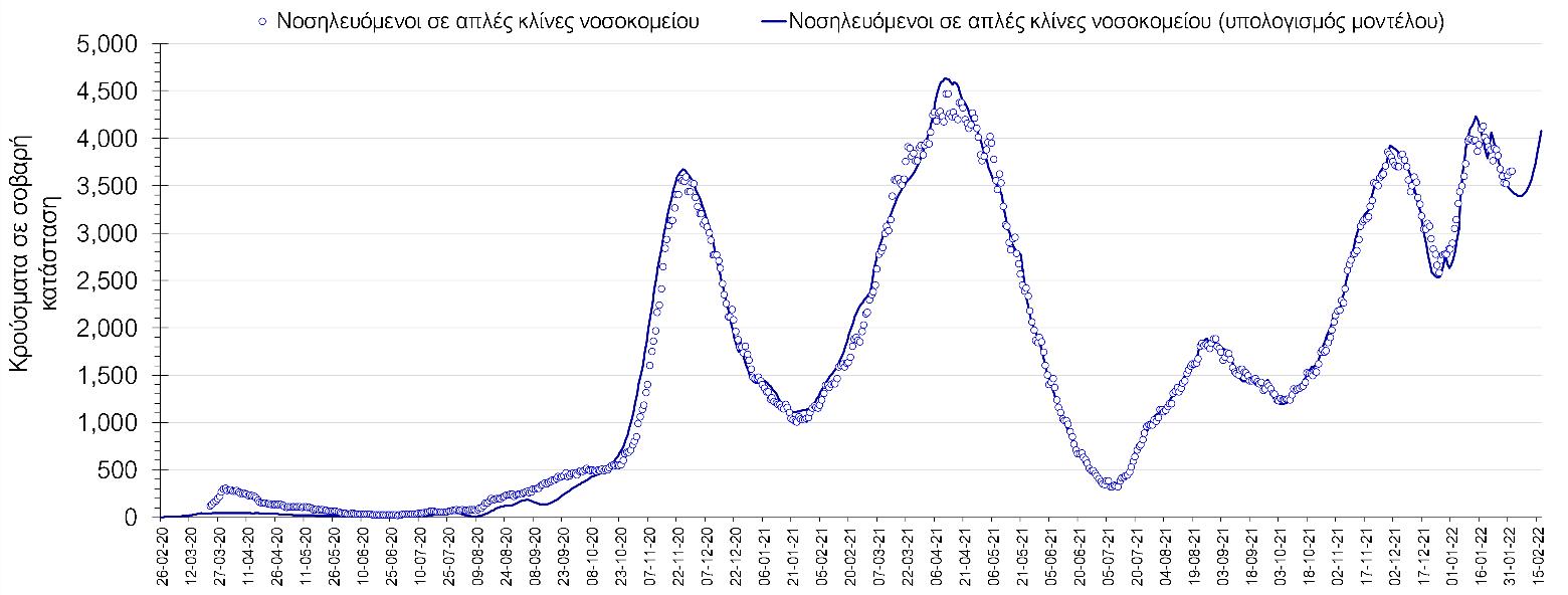 Η πορεία της μέσης εβδομαδιαίας τιμής των κρουσμάτων, καθώς και του κυλιόμενου μέσου όρου 7 ημερών του αριθμού των κρουσμάτων ανά 100.000 πληθυσμού, όπως έχουν καταγραφεί από τον ΕΟΔΥ και η αναμενόμενη πορεία τους όπως προδιαγράφεται από την υπολογιστική πλατφόρμα CORE για την Ελληνική επικράτεια μέχρι τις 15 Φεβρουαρίου, αποτυπώνονται στο Σχήμα 4. Αυτή η προβλεπόμενη πορεία, που αφορά τα κρούσματα, τους νοσηλευόμενους σε απλές κλίνες, όσο και σε ΜΕΘ, καθώς επίσης και τους θανάτους, βασίζεται στις ακόλουθες παραδοχές: