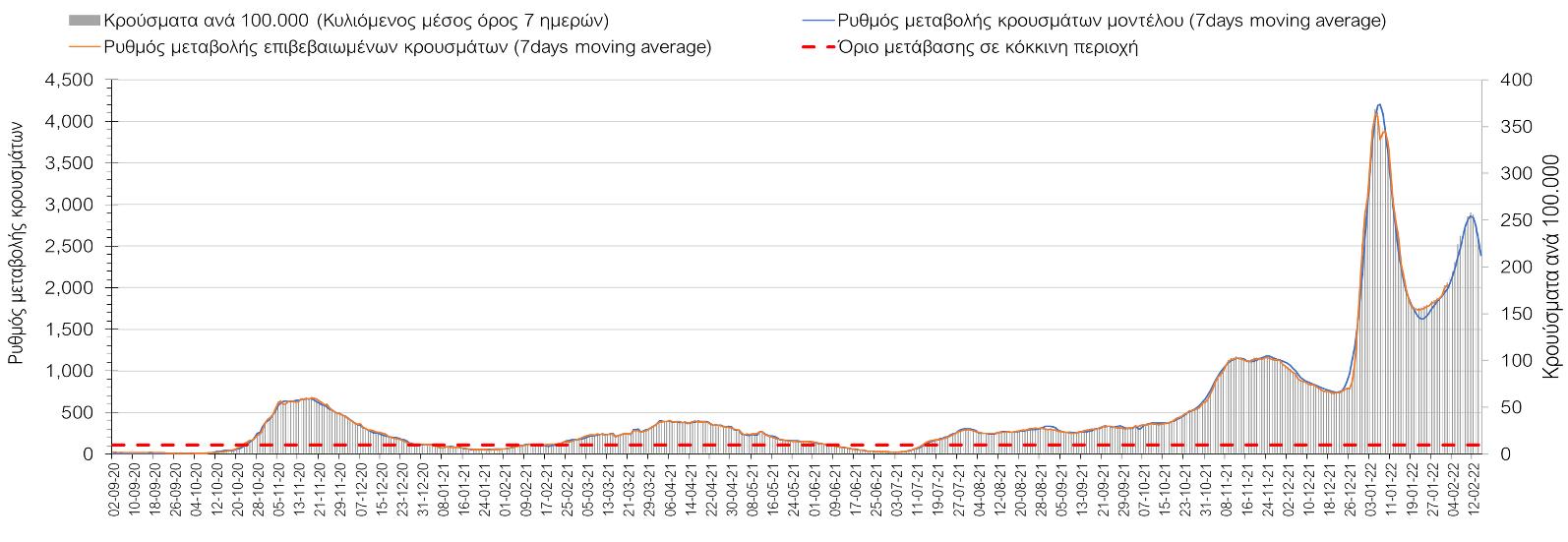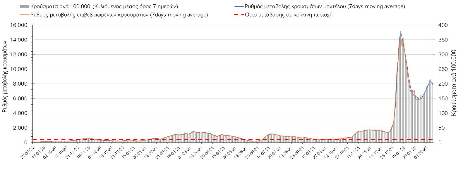 Η ανοδική τάση που είχε διαμορφώνεται εκ νέου αντικατοπτρίζεται και στον ημερήσιο αριθμό των κρουσμάτων (κυλιόμενος μέσος όρος 7 ημερών), ο οποίος βρίσκεται πάνω από τις 19.000 (19.378). Για να επανέλθει η ταχεία αποκλιμάκωση της πανδημίας, πέρα από την εφαρμογή των μέτρων (σε συνδυασμό με την σημαντική συνειδητοποίηση εκ μέρους του πληθυσμού ότι χρειάζεται προσοχή και σύνεση για την αντιμετώπιση της διασποράς της παραλλαγής Ο), θα πρέπει να στοχεύσουμε στη διατήρηση και την επέκταση της επίκτητης ανοσίας του πληθυσμού, αλλά και στον πολύ μεγάλο αριθμό των τεστ συνολικά (μοριακά, rapid και self-test) που πραγματοποιούνται καθημερινά, των οποίων ο αριθμός έχει φθάσει σε ημερήσια βάση τις 700.000. Αυτά σε συνδυασμό με τη φυσική ανοσία του πληθυσμού μετά από νόσηση, θα συντελέσουν στην συστηματική αποκλιμάκωση της πανδημίας. Αντίθετα, με τον υπάρχοντα ρυθμό εμβολιασμού αναμνηστικών δόσεων, θα υπάρξει ανοδική πορεία όλο το Φεβρουάριο.