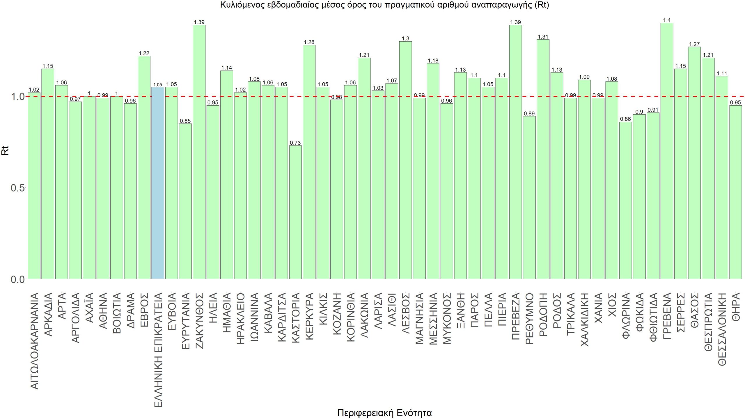 Όσον αφορά επιμέρους περιοχές, όλες βρίσκονται πάνω από το όριο χαρακτηρισμού ως περιοχές ανησυχίας. Η συγκεντρωτική εικόνα των επιμέρους περιοχών παρουσιάζεται στο Σχήμα 60. Αξίζει να σημειωθεί η σημαντική μεταβολή του Rt, από το 0.85 στο 1,04.
