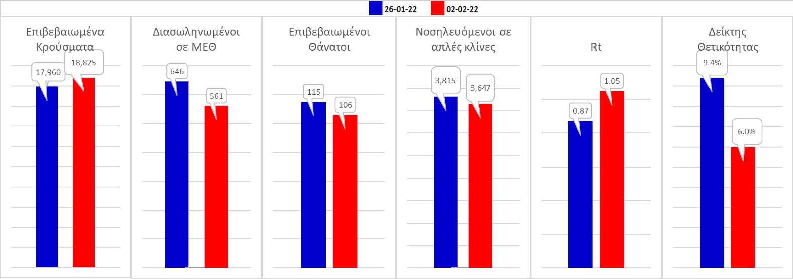 Σχήμα 59. Συγκριτικά αποτελέσματα της επιδημιολογικής εικόνας της χθεσινής Τετάρτης (02/02/2022) σε σχέση με την προηγούμενη (26/01/2022)