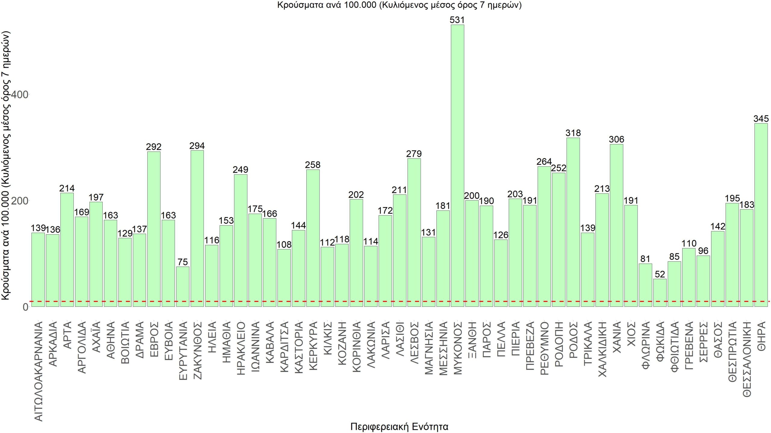 Σχήμα 60. Συγκεντρωτική εικόνα των νέων κρουσμάτων ανά 100.000 κατοίκους (κυλιόμενος μέσος όρος 7 ημερών) των επιμέρους περιοχών