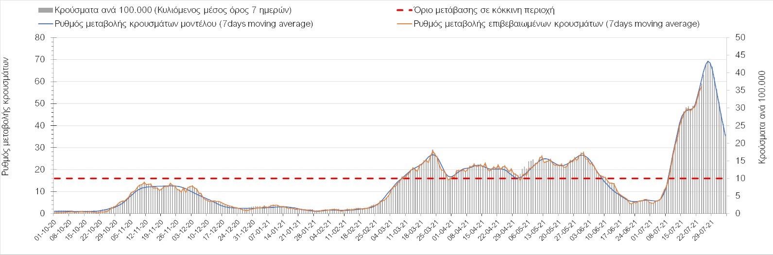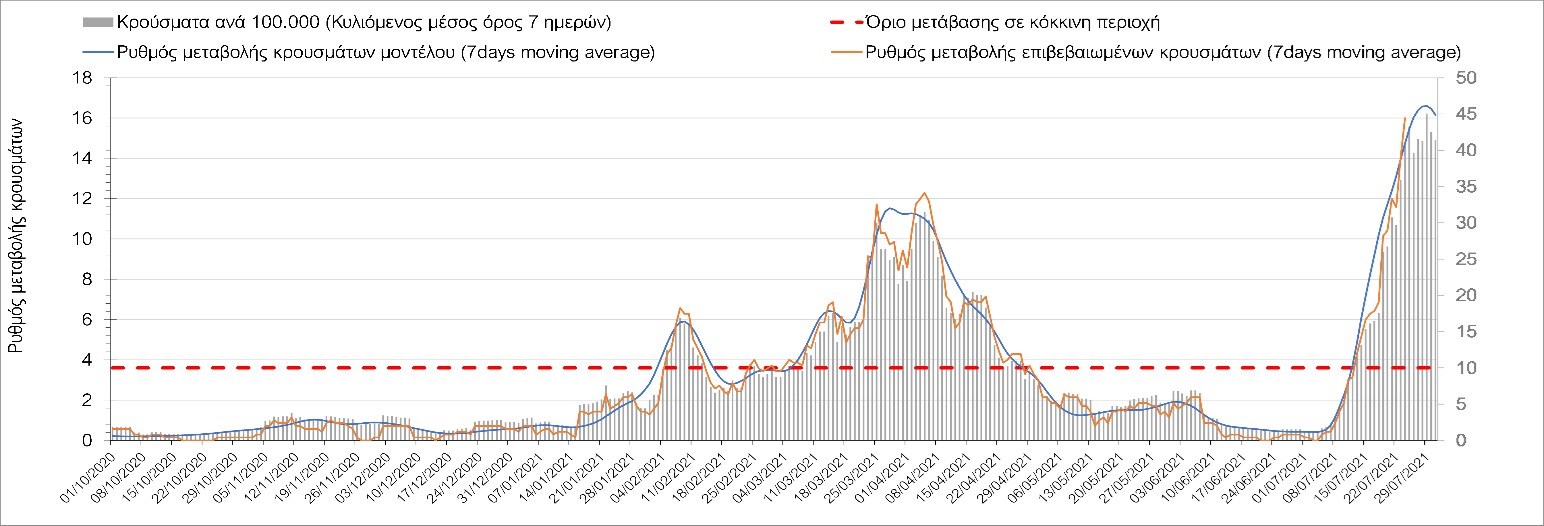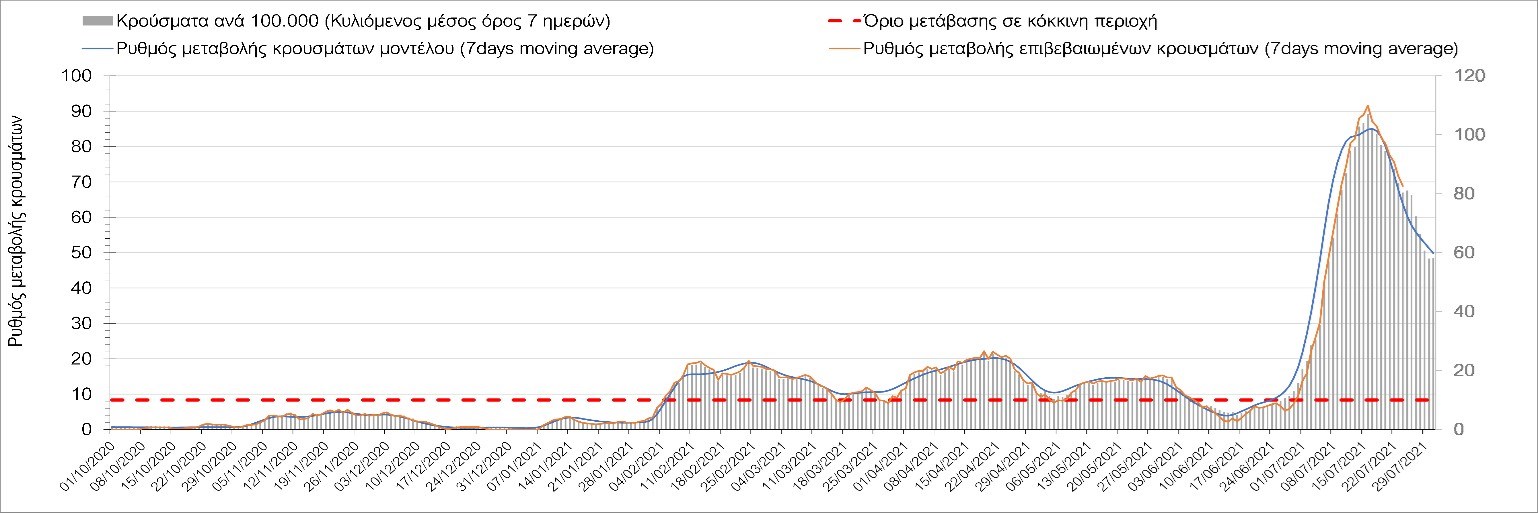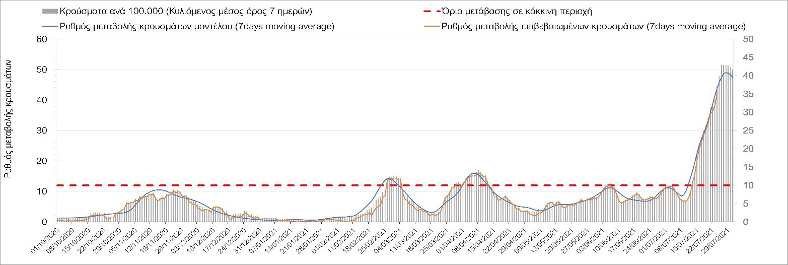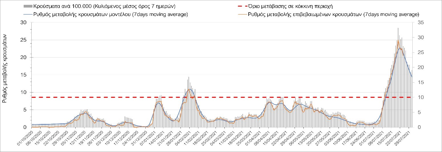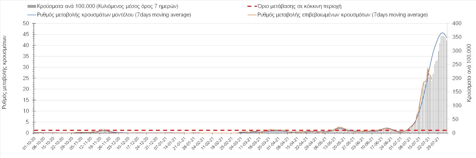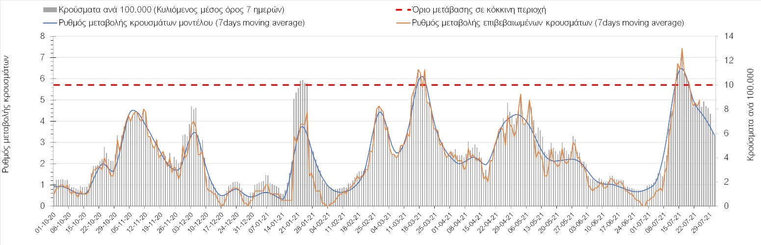 Σχήμα 58. Συγκριτικά αποτελέσματα της επιδημιολογικής εικόνας του σημερινού Σαββάτου (24/07/2021) σε σχέση με την προηγούμενη (27/07/2021) Όσον αφορά επιμέρους περιοχές, αρκετές πλέον βρίσκονται πάνω από το όριο χαρακτηρισμού ως κόκκινες, όπως η Αθήνα, η Θεσσαλονίκη η Λάρισα, η Μαγνησία, η Καρδίτσα, τα Τρίκαλα, η Αχαΐα, η Αργολίδα, η Αρκαδία, η Ηλεία, η Κορινθία, η Μεσσηνία, η Εύβοια, η Βοιωτία, τη Φωκίδα, τα Ιωάννινα, η Θεσπρωτία, τα Γρεβενά, η Κοζάνη, η Φλώρινα, η Χαλκιδική, ο Έβρος, το Ηράκλειο, τα Χανιά, το Ρέθυμνο, το Λασίθι, η Κέρκυρα, η Λέσβος, η Πάρος, η Ζάκυνθος, η Μύκονος, η Σαντορίνη και η Ρόδος, ενώ παρατηρούνται έντονα ανοδικές τάσεις στην Άρτα, στην Καβάλα, στη Πιερία, στη Ξάνθη και στη Χίο. Ιδιαίτερα στην Αθήνα (παρά την πτωτική πορεία), προβληματίζει ο βαθμός που αυτή σχετίζεται με την εξάπλωση μεταλλαγμένων και ταχύτερα μεταδιδόμενων στελεχών (κυρίως το Β.1.1.318 και το Β.1.167). Χαρακτηριστικό παράδειγμα της αυξημένης μεταδοτικότητας του στελέχους Δ (Β.1.167) αποτελεί η Κρήτη. Συνολικά η Κρήτη είναι η περιοχή με τη χειρότερη επιδημιολογική εικόνα και η ταχύτητα μετάδοσης (και το αντίστοιχο ύψος του 4ου κύματος που έχει διαμορφωθεί) είναι ενδεικτική της αυξημένης μεταδοτικότητας του στελέχους Δ. Επίσης, καταδεικνύει τον αρνητικό ρόλο που παίζουν οι διαπεριφερειακές μετακινήσεις στη φάση ανάπτυξης της πανδημίας, καθώς η αρχική αύξηση κρουσμάτων στο Ρέθυμνο πρώτα και στο Ηράκλειο έπειτα, ακολουθήθηκε από αυξητική πορεία της διασποράς στα Χανιά και στο Λασίθι. Στην πράξη, η Κρήτη είναι μια περιοχή οδικά απομονωμένη από την υπόλοιπη Ελλάδα, στην οποία, οι διαπεριφερειακές μετακινήσεις επέτρεψαν τη γρήγορη διασπορά του στελέχους Δ. Παρόμοια φαινόμενα διαπεριφερειακής μετάδοσης παρατηρούνται στη Θεσσαλία, αλλά σε πιο ήπια έκταση, όπου η έντονα αυξητική τάση στη Μαγνησία, μεταφέρθηκε σε κάποιο βαθμό και στη Λάρισα, ενώ ακολουθεί και η Καρδίτσα. Αντίστοιχη είναι η διάχυση της διασποράς στην Ήπειρο και πιο συγκεκριμένα από τα Ιωάννινα προς τα εγγύς τουριστικά θέρετρα (Πρέβεζα και Θεσπρωτία). Συνεπώς, ακόμα και για περιοχές που για την ώρα είναι κάτω από το όριο (ή πολύ κοντά στο όριο), οι ανοδικές τάσεις που παρατηρούνται χρήζουν αυξημένης επιδημιολογικής επιτήρησης με εντατικοποίηση του γονιδιωματικού ελέγχου ώστε να ληφθούν εγκαίρως μέτρα περιορισμού της διασποράς του ιού.Επίσης, σύμφωνα με τα πιο πρόσφατα στοιχεία που έγιναν διαθέσιμα, ανησυχία πλέον δημιουργεί η αύξηση του ποσοστού διασποράς του μεταλλαγμένου στελέχους Β.1.617.2 (μετάλλαξη Δέλτα) σε συγκεκριμένες περιοχές για το 15νθήμερο από 04/07/2021 έως 18/07/2021, όπου οι αντίστοιχες ποσοστώσεις είναι 25.13% για την Αττική, 6.67% για τη Δυτική Ελλάδα, 33.33% για τις Ιόνιες Νήσους, 24.32% για την Πελοπόννησο, 79.59% για την Κρήτη και 50% για την Ήπειρο. Με δεδομένα τα υπάρχοντα ανοίγματα, την παρουσία των μεταλλάξεων και την έλευση των τουριστικών ροών είναι ακόμα πιο σημαντική η τήρηση των μέτρων, με κυριότερη την ορθή και μαζική εφαρμογή των self-test, με ταυτόχρονη αύξηση της ιχνηλασίας των επαφών των ανιχνευθέντων ως θετικοί και καραντίνα 14 ημερών για τους συμπολίτες μας που θα επιβεβαιωθεί ότι είναι θετικοί στην μόλυνση με SARS-CoV-2 ακόμη και αν είναι ασυμπτωματικοί. Η σημασία και η αποτελεσματικότητα των self-test και του εμβολιασμού έχει ήδη φανεί τις προηγούμενες 12 εβδομάδες. Με δεδομένη την εμφάνιση της μετάλλαξης Β.1.617 ο πλήρ