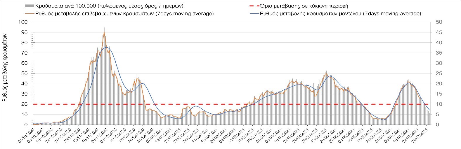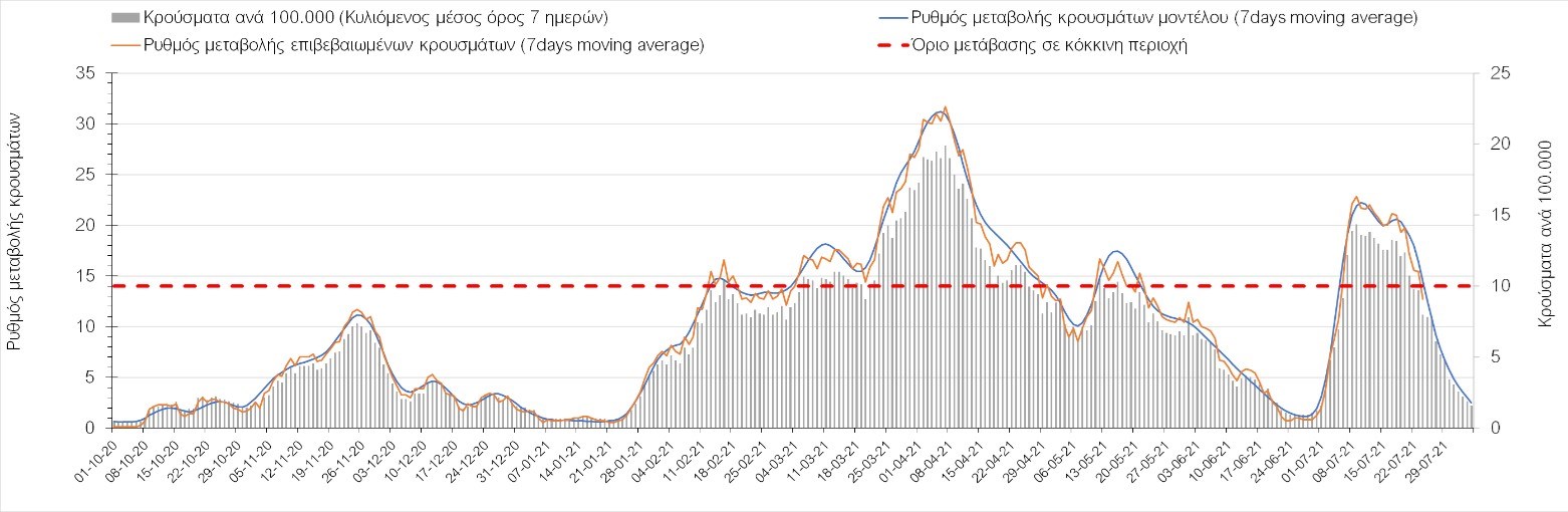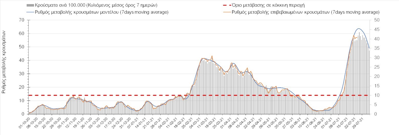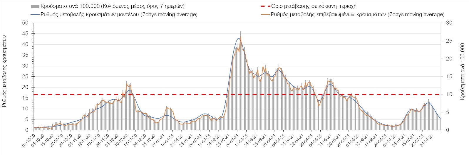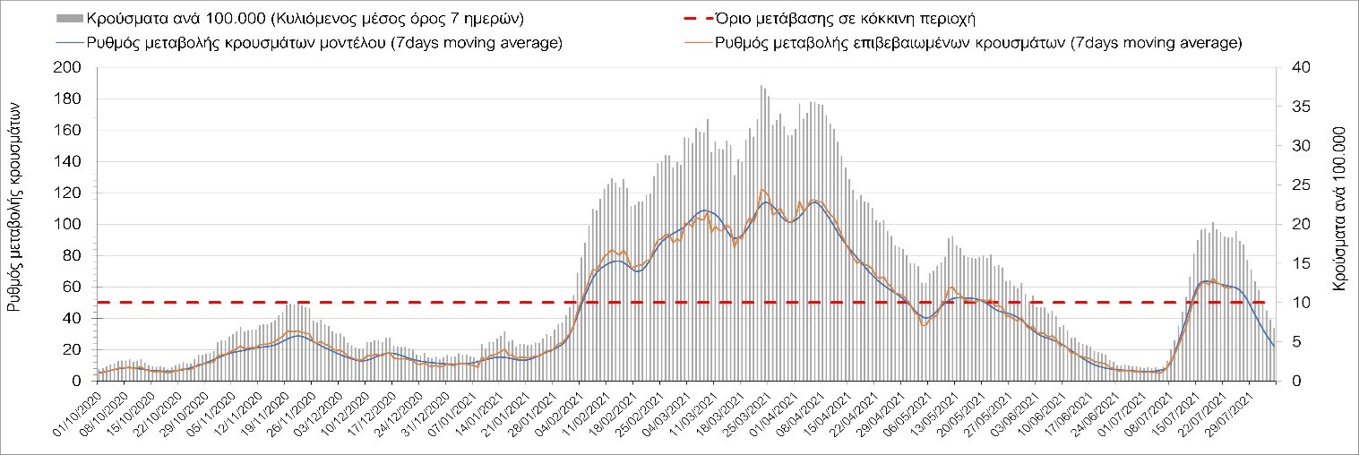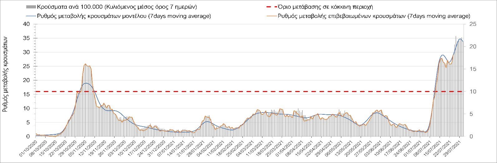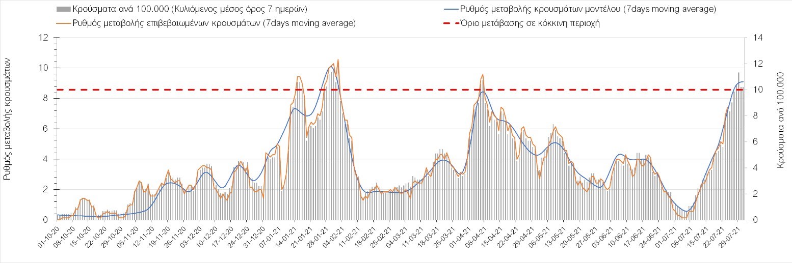 Σχήμα 58. Συγκριτικά αποτελέσματα της επιδημιολογικής εικόνας του σημερινού Σαββάτου (24/07/2021) σε σχέση με την προηγούμενη (27/07/2021) Όσον αφορά επιμέρους περιοχές, αρκετές πλέον βρίσκονται πάνω από το όριο χαρακτηρισμού ως κόκκινες, όπως η Αθήνα, η Θεσσαλονίκη η Λάρισα, η Μαγνησία, η Καρδίτσα, τα Τρίκαλα, η Αχαΐα, η Αργολίδα, η Αρκαδία, η Ηλεία, η Κορινθία, η Μεσσηνία, η Εύβοια, η Βοιωτία, τη Φωκίδα, τα Ιωάννινα, η Θεσπρωτία, τα Γρεβενά, η Κοζάνη, η Φλώρινα, η Χαλκιδική, ο Έβρος, το Ηράκλειο, τα Χανιά, το Ρέθυμνο, το Λασίθι, η Κέρκυρα, η Λέσβος, η Πάρος, η Ζάκυνθος, η Μύκονος, η Σαντορίνη και η Ρόδος, ενώ παρατηρούνται έντονα ανοδικές τάσεις στην Άρτα, στην Καβάλα, στη Πιερία, στη Ξάνθη και στη Χίο. Ιδιαίτερα στην Αθήνα (παρά την πτωτική πορεία), προβληματίζει ο βαθμός που αυτή σχετίζεται με την εξάπλωση μεταλλαγμένων και ταχύτερα μεταδιδόμενων στελεχών (κυρίως το Β.1.1.318 και το Β.1.167). Χαρακτηριστικό παράδειγμα της αυξημένης μεταδοτικότητας του στελέχους Δ (Β.1.167) αποτελεί η Κρήτη. Συνολικά η Κρήτη είναι η περιοχή με τη χειρότερη επιδημιολογική εικόνα και η ταχύτητα μετάδοσης (και το αντίστοιχο ύψος του 4ου κύματος που έχει διαμορφωθεί) είναι ενδεικτική της αυξημένης μεταδοτικότητας του στελέχους Δ. Επίσης, καταδεικνύει τον αρνητικό ρόλο που παίζουν οι διαπεριφερειακές μετακινήσεις στη φάση ανάπτυξης της πανδημίας, καθώς η αρχική αύξηση κρουσμάτων στο Ρέθυμνο πρώτα και στο Ηράκλειο έπειτα, ακολουθήθηκε από αυξητική πορεία της διασποράς στα Χανιά και στο Λασίθι. Στην πράξη, η Κρήτη είναι μια περιοχή οδικά απομονωμένη από την υπόλοιπη Ελλάδα, στην οποία, οι διαπεριφερειακές μετακινήσεις επέτρεψαν τη γρήγορη διασπορά του στελέχους Δ. Παρόμοια φαινόμενα διαπεριφερειακής μετάδοσης παρατηρούνται στη Θεσσαλία, αλλά σε πιο ήπια έκταση, όπου η έντονα αυξητική τάση στη Μαγνησία, μεταφέρθηκε σε κάποιο βαθμό και στη Λάρισα, ενώ ακολουθεί και η Καρδίτσα. Αντίστοιχη είναι η διάχυση της διασποράς στην Ήπειρο και πιο συγκεκριμένα από τα Ιωάννινα προς τα εγγύς τουριστικά θέρετρα (Πρέβεζα και Θεσπρωτία). Συνεπώς, ακόμα και για περιοχές που για την ώρα είναι κάτω από το όριο (ή πολύ κοντά στο όριο), οι ανοδικές τάσεις που παρατηρούνται χρήζουν αυξημένης επιδημιολογικής επιτήρησης με εντατικοποίηση του γονιδιωματικού ελέγχου ώστε να ληφθούν εγκαίρως μέτρα περιορισμού της διασποράς του ιού.Επίσης, σύμφωνα με τα πιο πρόσφατα στοιχεία που έγιναν διαθέσιμα, ανησυχία πλέον δημιουργεί η αύξηση του ποσοστού διασποράς του μεταλλαγμένου στελέχους Β.1.617.2 (μετάλλαξη Δέλτα) σε συγκεκριμένες περιοχές για το 15νθήμερο από 04/07/2021 έως 18/07/2021, όπου οι αντίστοιχες ποσοστώσεις είναι 25.13% για την Αττική, 6.67% για τη Δυτική Ελλάδα, 33.33% για τις Ιόνιες Νήσους, 24.32% για την Πελοπόννησο, 79.59% για την Κρήτη και 50% για την Ήπειρο. Με δεδομένα τα υπάρχοντα ανοίγματα, την παρουσία των μεταλλάξεων και την έλευση των τουριστικών ροών είναι ακόμα πιο σημαντική η τήρηση των μέτρων, με κυριότερη την ορθή και μαζική εφαρμογή των self-test, με ταυτόχρονη αύξηση της ιχνηλασίας των επαφών των ανιχνευθέντων ως θετικοί και καραντίνα 14 ημερών για τους συμπολίτες μας που θα επιβεβαιωθεί ότι είναι θετικοί στην μόλυνση με SARS-CoV-2 ακόμη και αν είναι ασυμπτωματικοί. Η σημασία και η αποτελεσματικότητα των self-test και του εμβολιασμού έχει ήδη φανεί τις προηγούμενες 12 εβδομάδες. Με δεδομένη την εμφάνιση της μετάλλαξης Β.1.617 ο πλήρ
